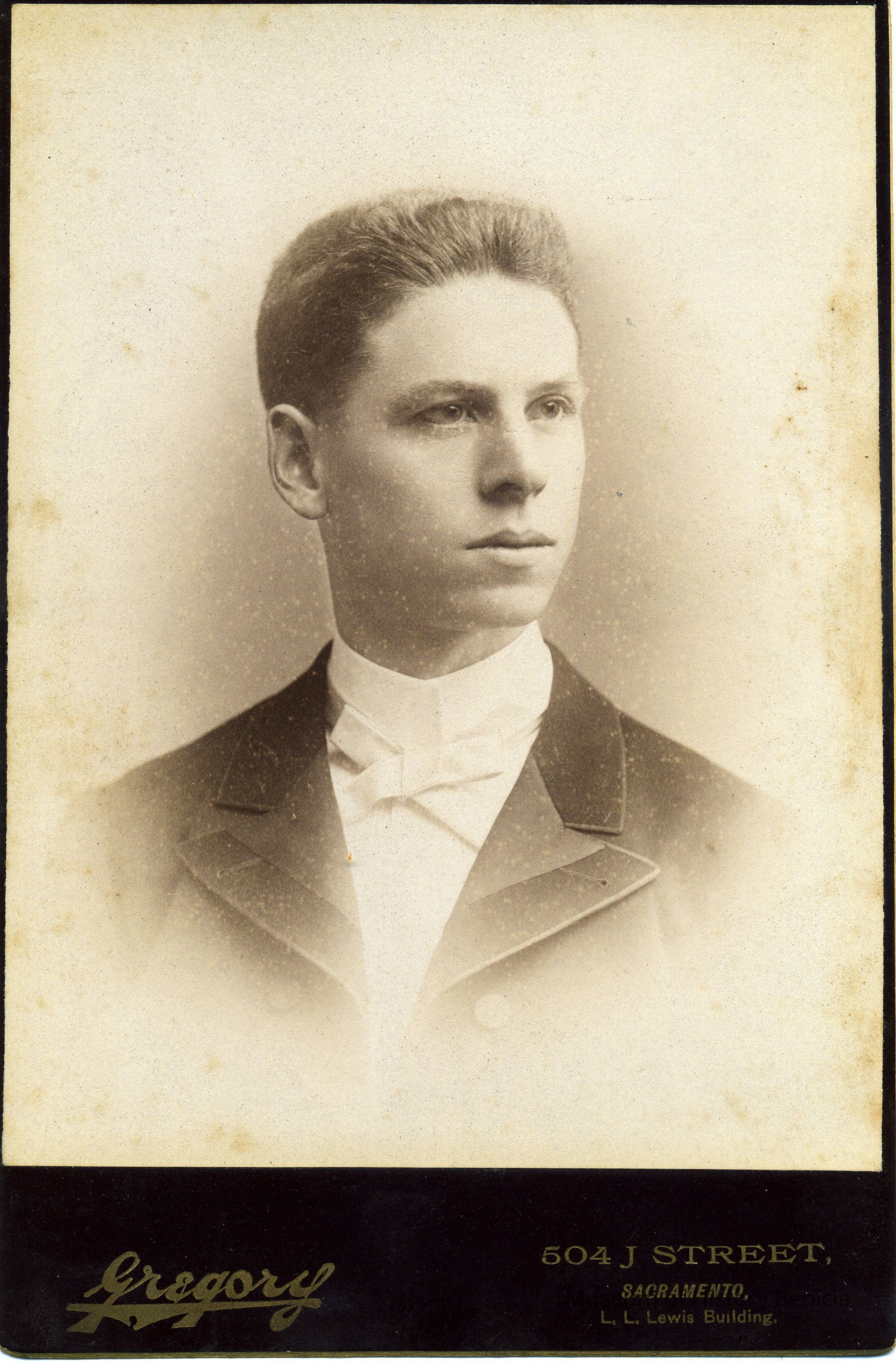 Cabinet photo of a man. It is in a studio. The image shows some foxing. It came from a photo album of portraits with some photos with names of subjects. Family names: Durrant, Pfister, Dalton, Reynolds, Booth, Gucker. Album is covered in red plush. This photo shows no name written under the photo in the album. It was taken in Sacramento.Collection