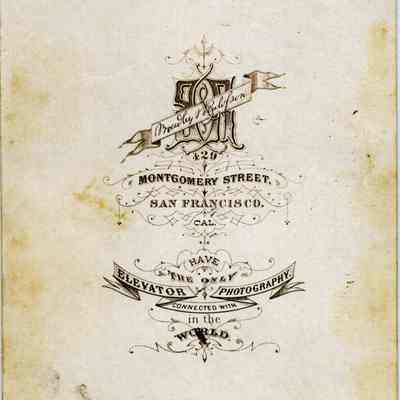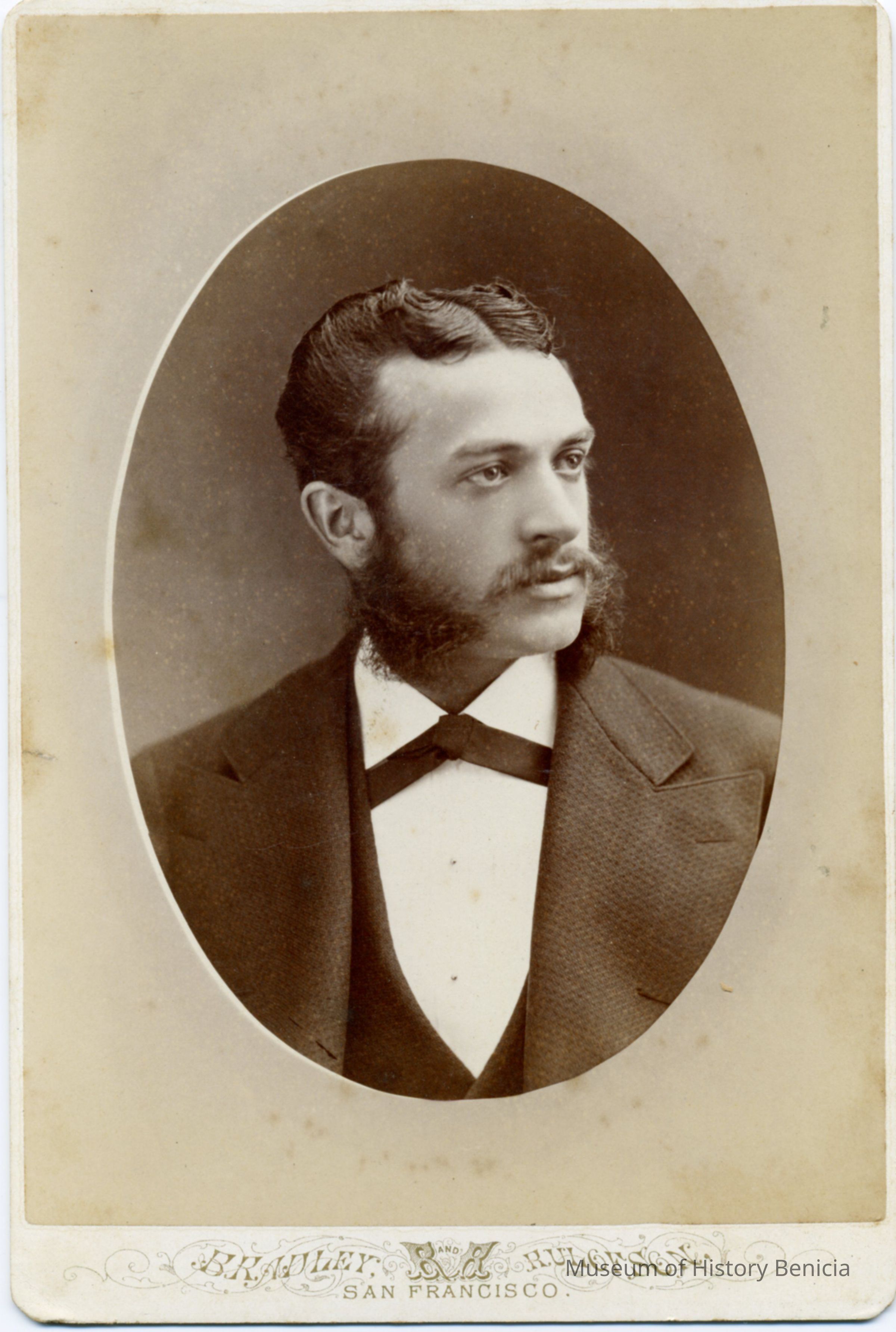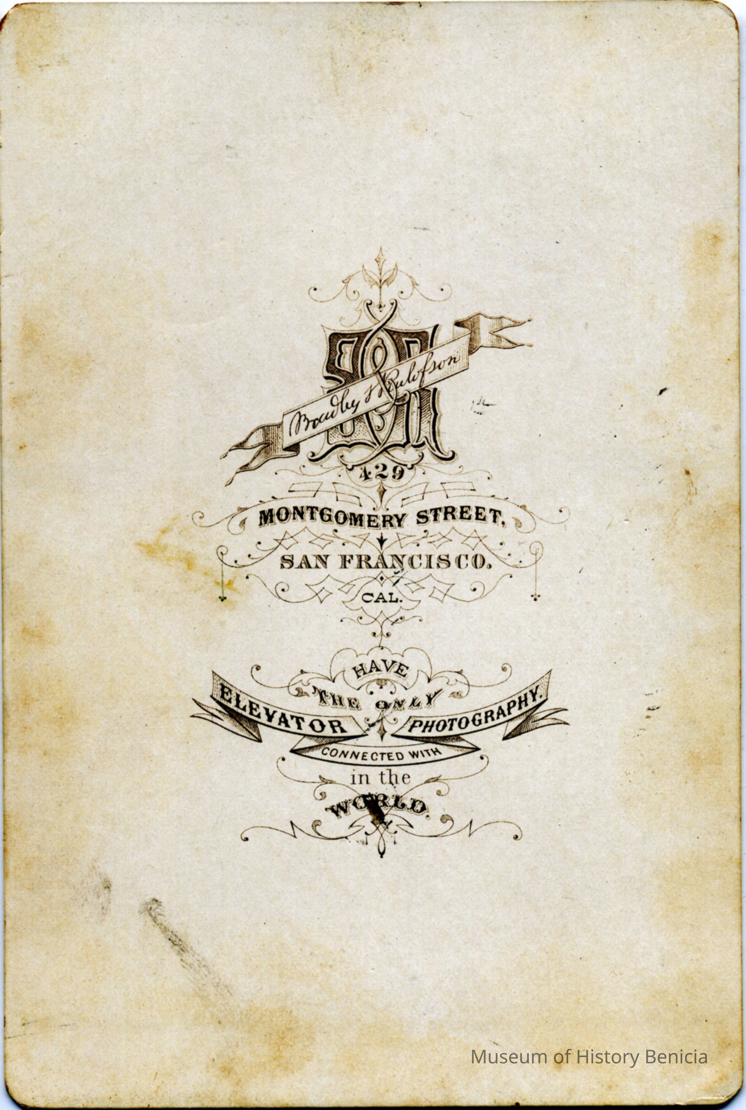 Cabinet photo of a man. It is in a studio. The image shows some foxing. It came from a photo album of portraits with some photos with names of subjects. Family names: Durrant, Pfister, Dalton, Reynolds, Booth, Gucker. Album is covered in red plush. This photo shows no name written under the photo in the album. It was taken by Bradley and Rulgfson in San Francisco.Collection