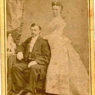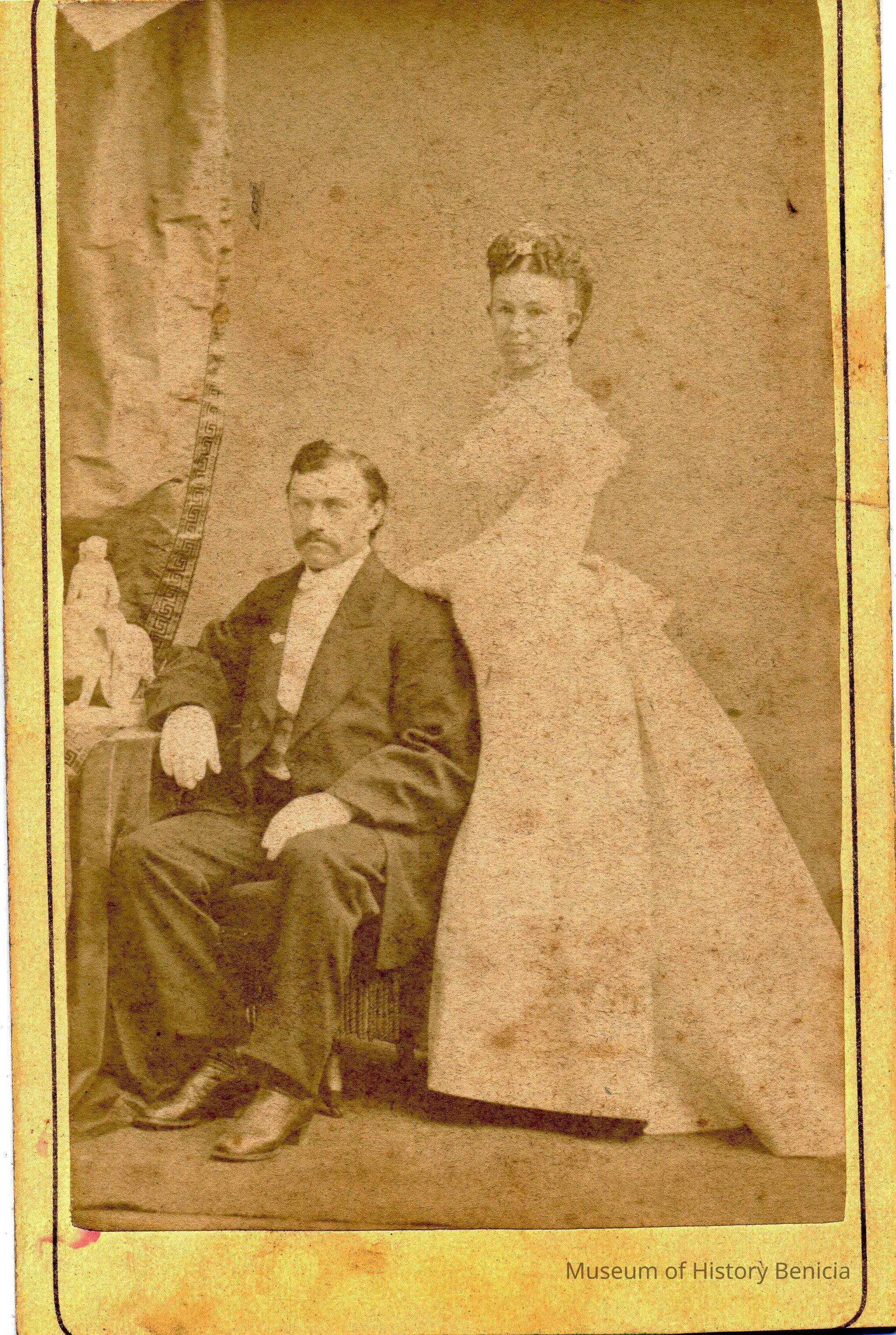 Carte-de-Visite photo of a man and woman. It is in a studio. It came from a photo album of portraits with some photos with names of subjects. Family names: Durrant, Pfister, Dalton, Reynolds, Booth, Gucker. Album is covered in red plush. This photo has the name Mr and Mrs Pfister written over the photo. It was taken in San Francisco by Bradley Rulofson.