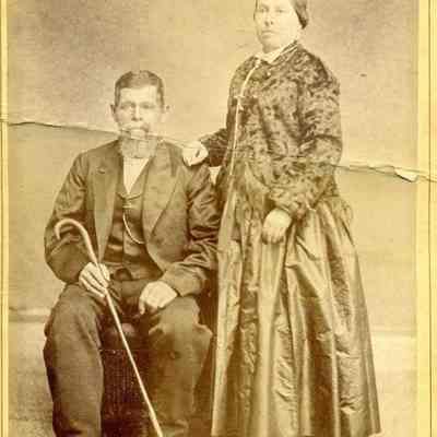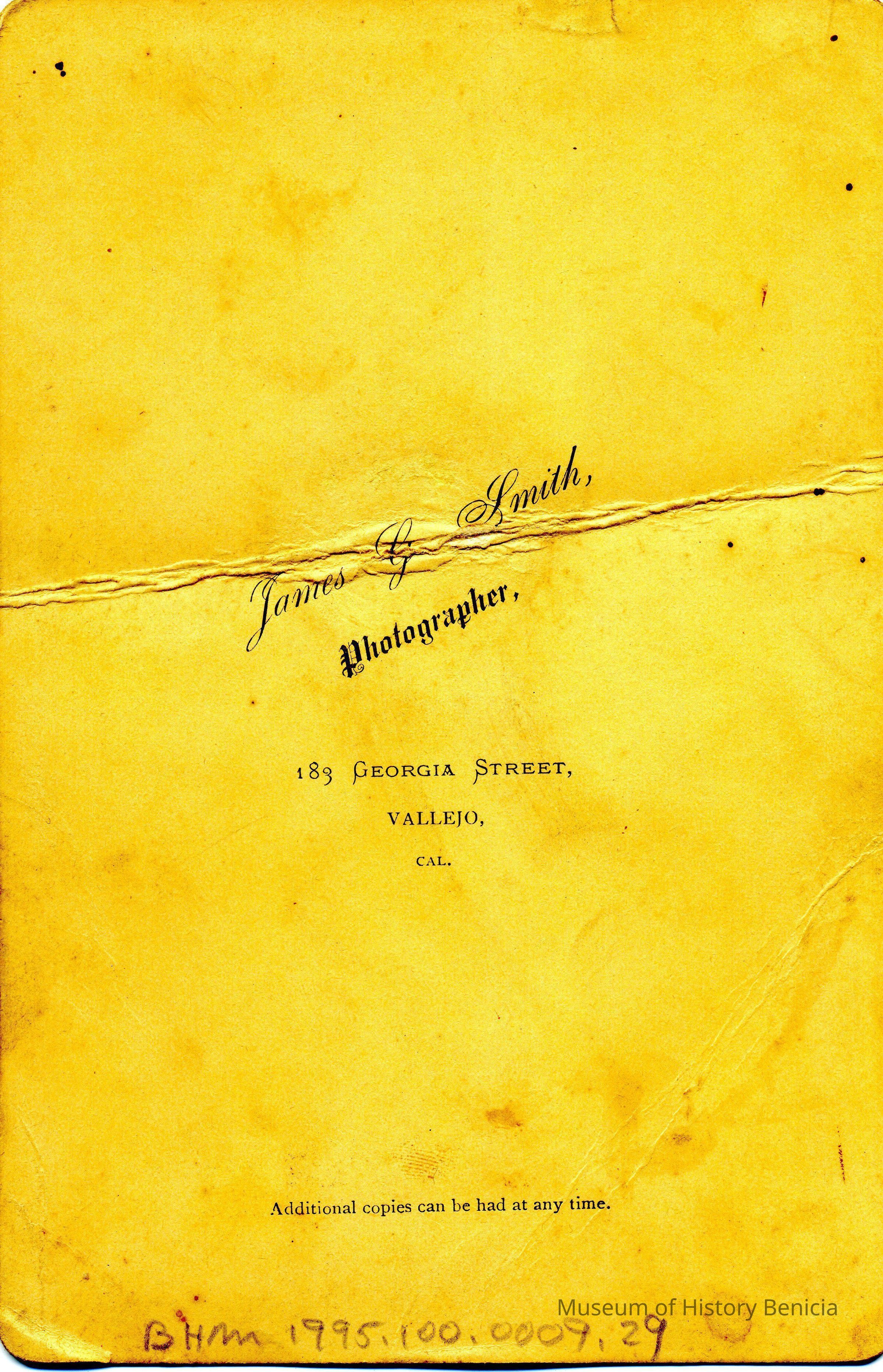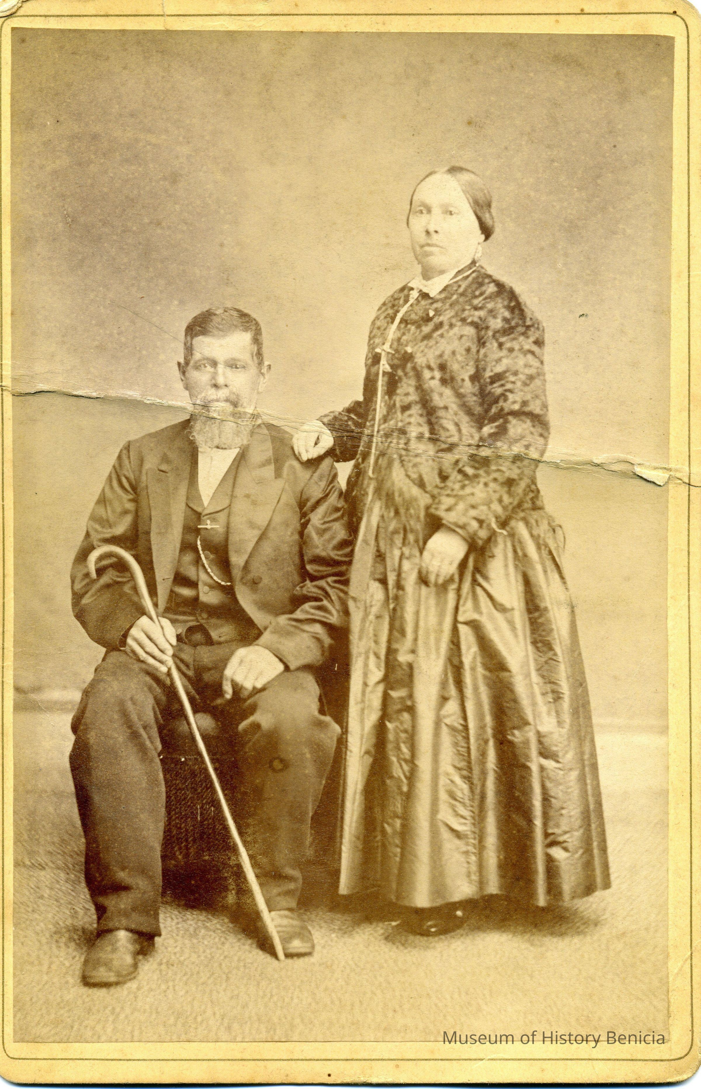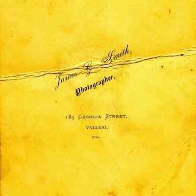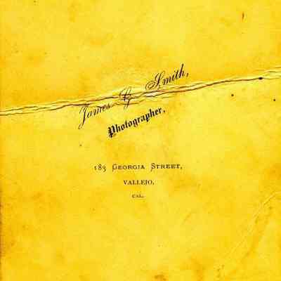 Cabinet photo of a couple. It is in a studio. It came from a photo album of portraits with some photos with names of subjects. Family names: Durrant, Pfister, Dalton, Reynolds, Booth, Gucker. Album is covered in red plush. This photo has no name written under the photo. It was taken in Vallejo by James Smith. The card looks older than the others and the couple seems to be older too. May be Alfred Dalton Sr (1832) who would have been about 50 in 1890.