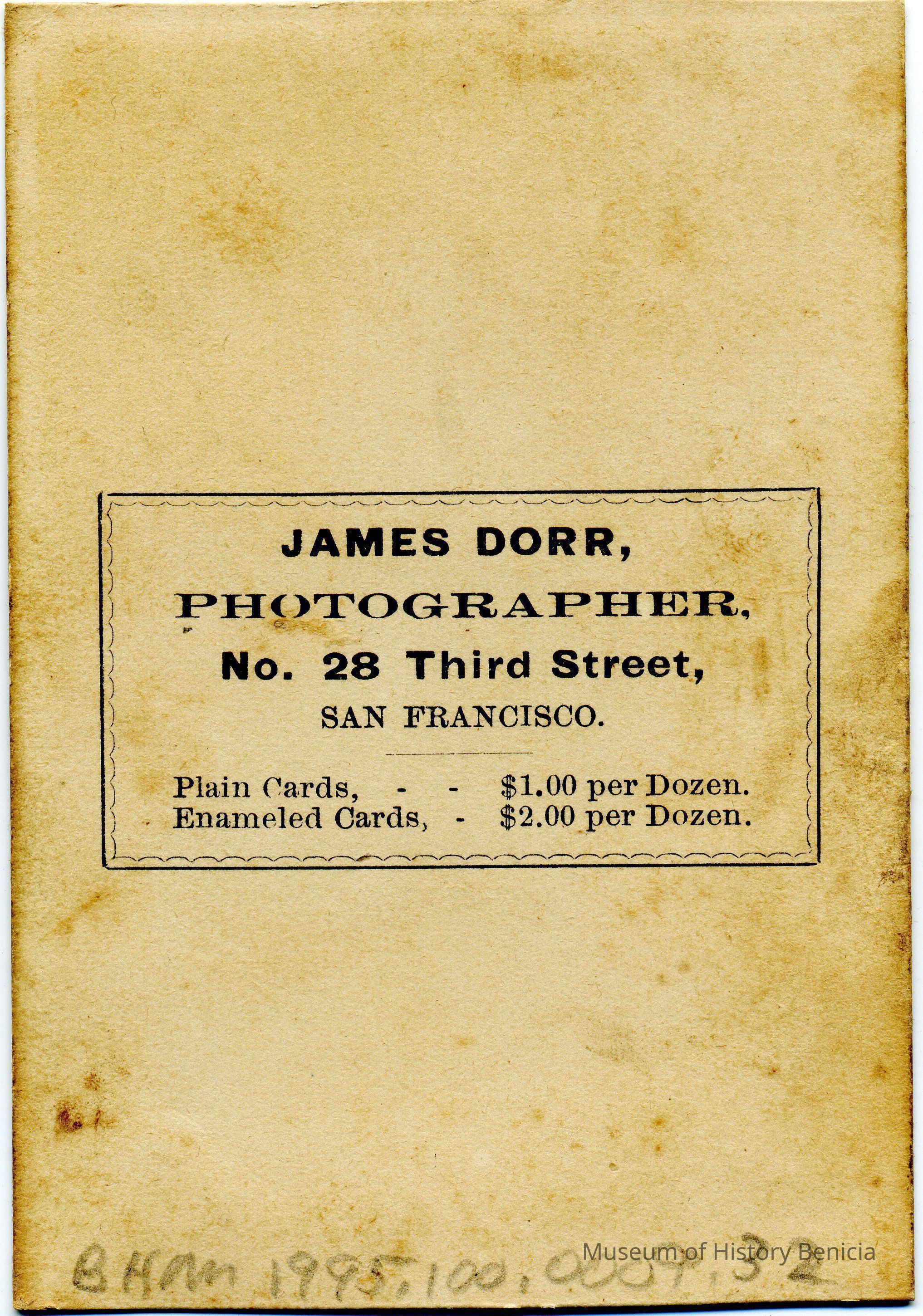 Carte-de-Visite photo of a man. It is in a studio. It came from a photo album of portraits with some photos with names of subjects. Family names: Durrant, Pfister, Dalton, Reynolds, Booth, Gucker. Album is covered in red plush. This photo has no name written under the photo. It was taken in San Francisco by James Dorr