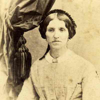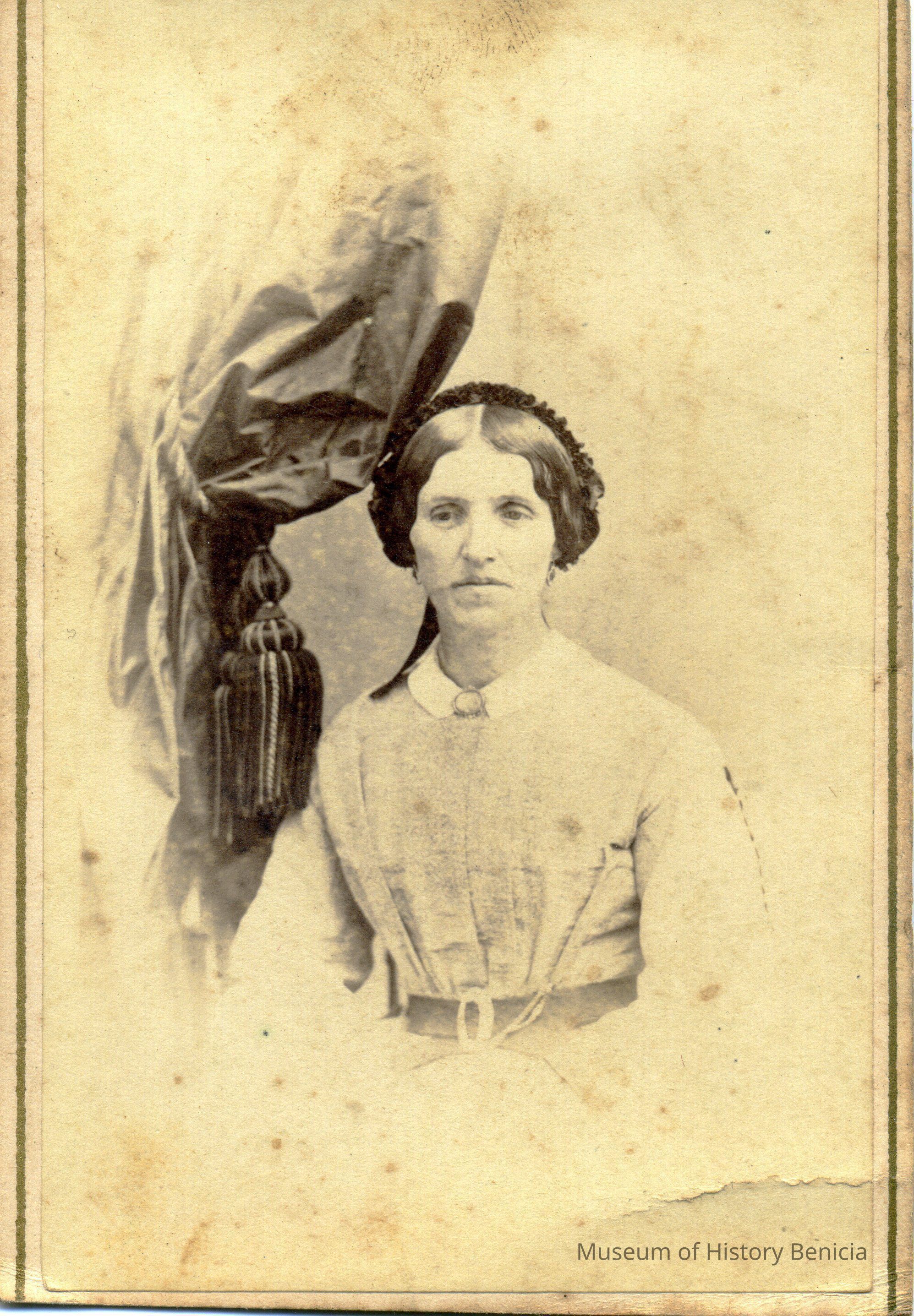 Carte-de-Visite photo of a woman. It is in a studio. It came from a photo album of portraits with some photos with names of subjects. Family names: Durrant, Pfister, Dalton, Reynolds, Booth, Gucker. Album is covered in red plush. This photo has no name written under the photo. It was taken in San Francisco by Nall Bros & Dickman.