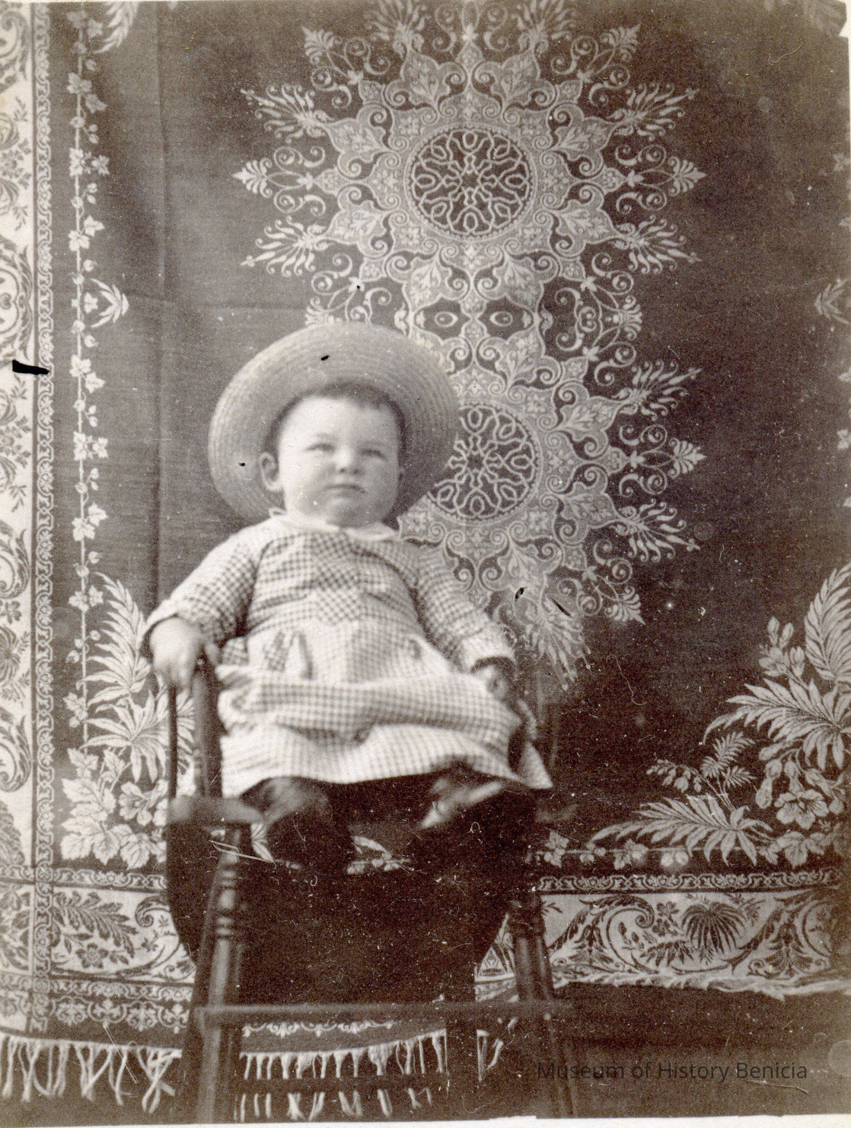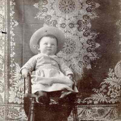 Cabinet photo of a young child. It is not in a studio. The image shows some foxing. It came from a photo album of portraits with some photos with names of subjects. Family names: Durrant, Pfister, Dalton, Reynolds, Booth, Gucker. Album is covered in red plush. This photo has the name Willis Dalton written below it in the album.