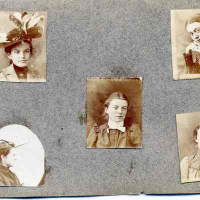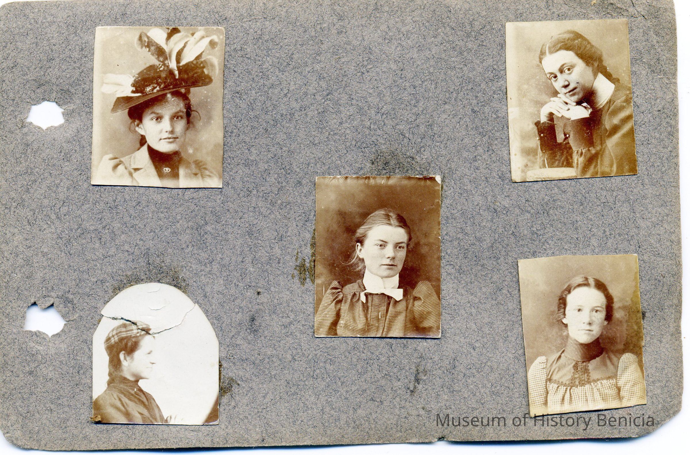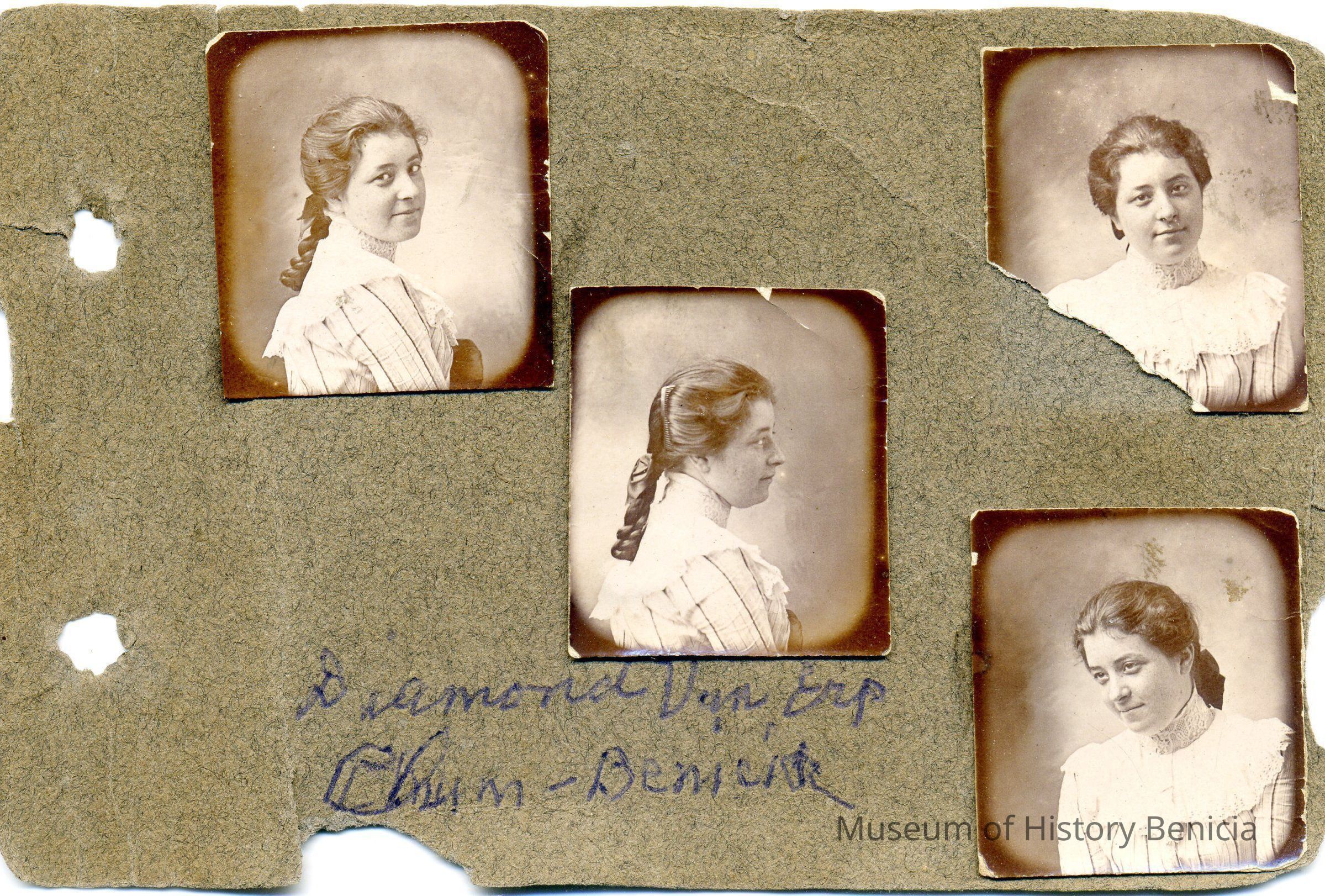Photo album of very small portraits. The book only measures 4.25" x 3". Inside are photos about 1" x .75" of various people. Only one is identified. That is a woman and the inscription says "Diamond Van Erp ??? Benicia".Collection