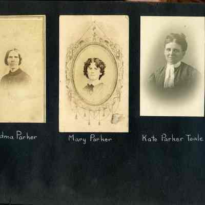 Photo album with a tooled leather cover that has the word "photographs" on the front and several colored diamonds down each side. The photo album is from the Parker/Teale families. Most pages have names written under the photos. The photos are so well documented and very firmly glued into the album that it is being kept together and photos are generally not being removed from the album.