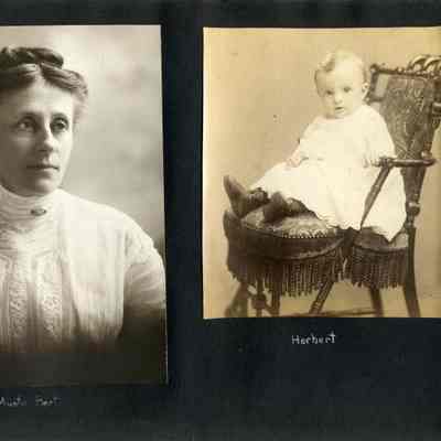 Photo album with a tooled leather cover that has the word "photographs" on the front and several colored diamonds down each side. The photo album is from the Parker/Teale families. Most pages have names written under the photos. The photos are so well documented and very firmly glued into the album that it is being kept together and photos are generally not being removed from the album.