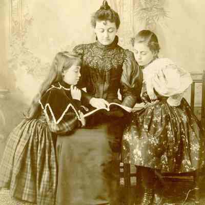 Photo album with a tooled leather cover that has the word "photographs" on the front and several colored diamonds down each side. The photo album is from the Parker/Teale families. Most pages have names written under the photos. The photos are so well documented and very firmly glued into the album that it is being kept together and photos are generally not being removed from the album.
