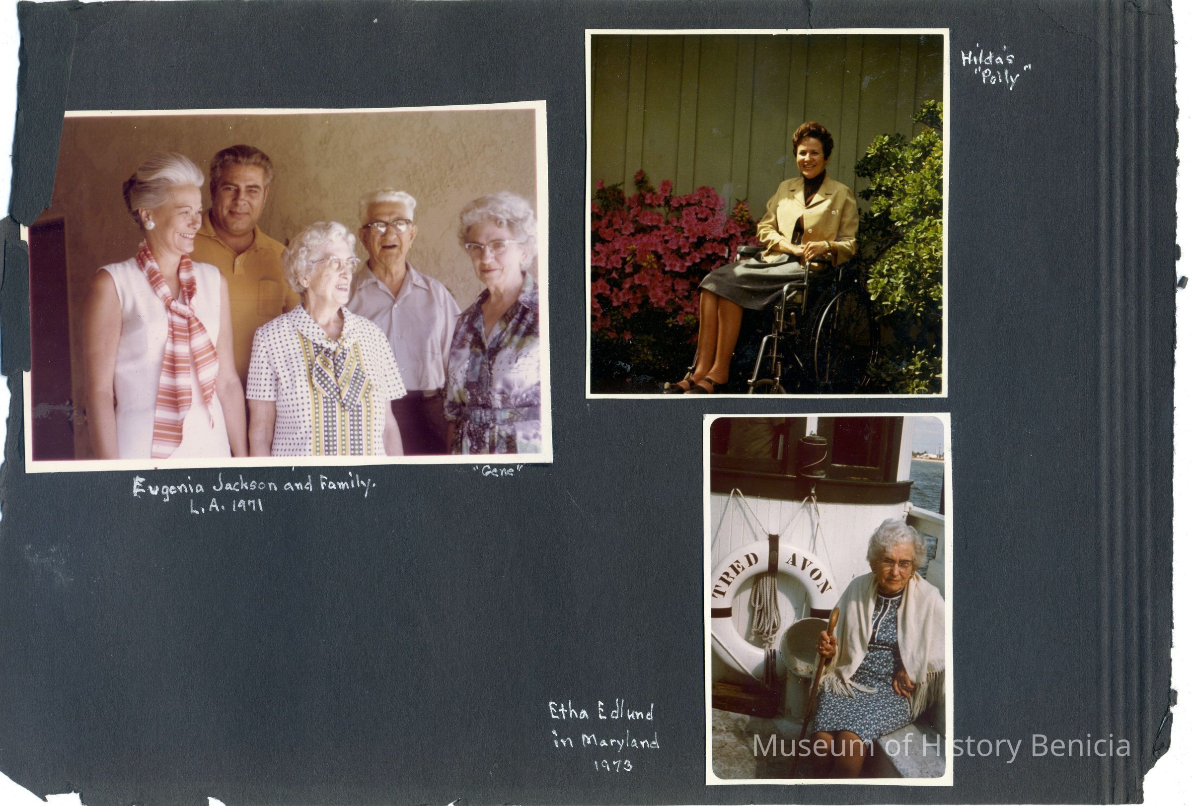 Photo album with a tooled leather cover that has the word "photographs" on the front and several colored diamonds down each side. The photo album is from the Parker/Teale families. Most pages have names written under the photos. The photos are so well documented and very firmly glued into the album that it is being kept together and photos are generally not being removed from the album. Each page will be listed separately along with the photos on that page. Page contains photos of: Eugenia Jackson and family L.A. 1971 Hilda's Polly Etha Edlund in Maryland 1973