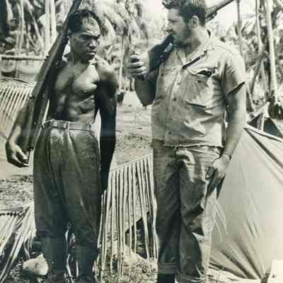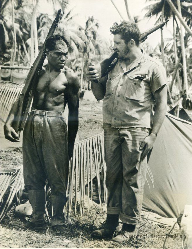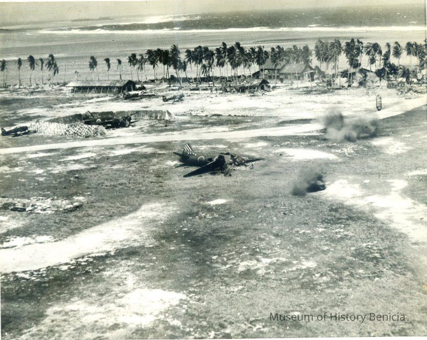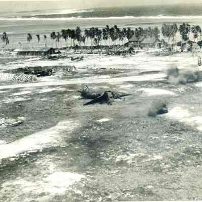 The eleventh page shows two photos. One shows a bombed out Japanese airport in the Marshall Islands. The other shows a native of Gilbert Island who is being recruited by the U.S.Collection