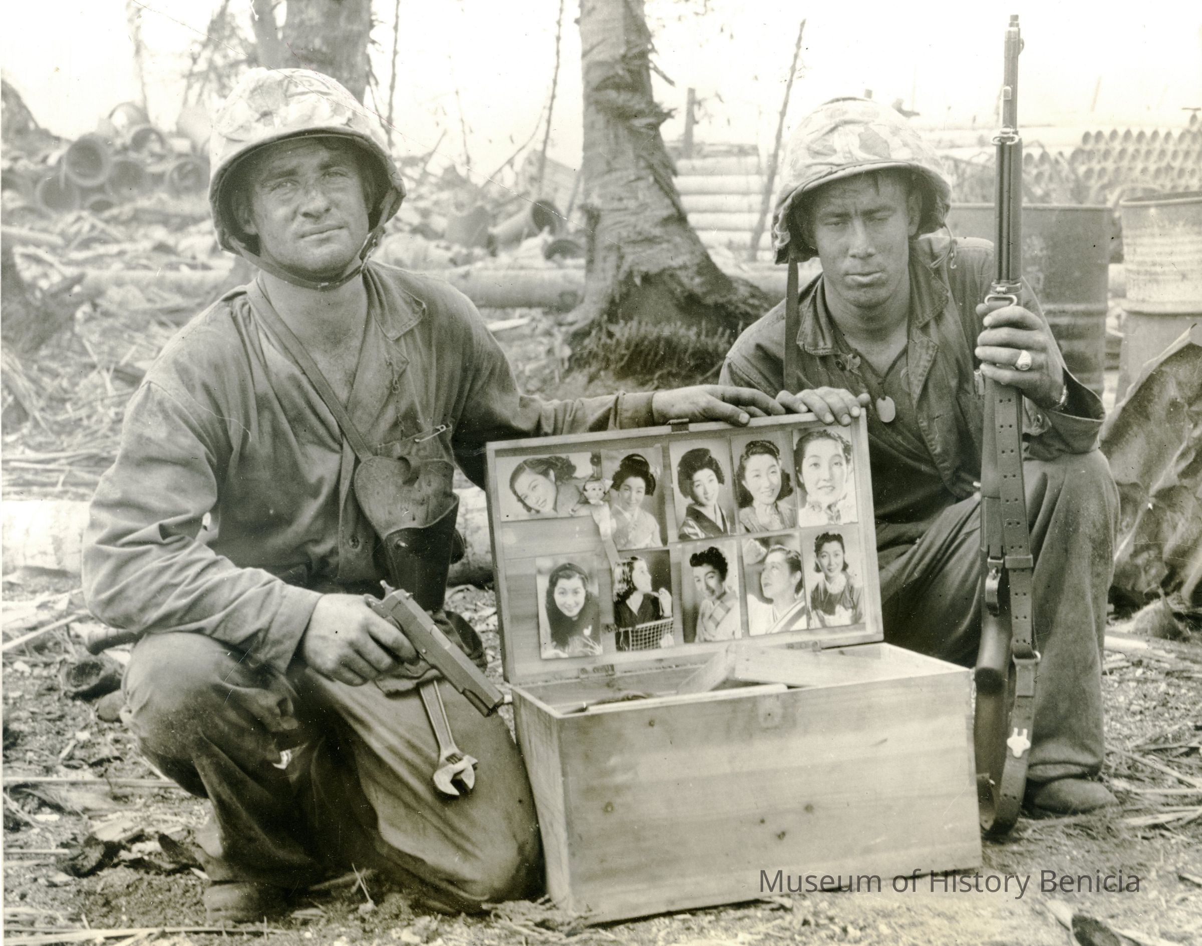 This page shows two photos. One shows a Japanese ship being bombed from above. The other shows two Marines with a box lid covered by Japanese women's photos on Roi Island. The Marines are Cpl. Elmer R. Burkhalter (left) and PFC. Gilbert Maxwell (right).Collection
