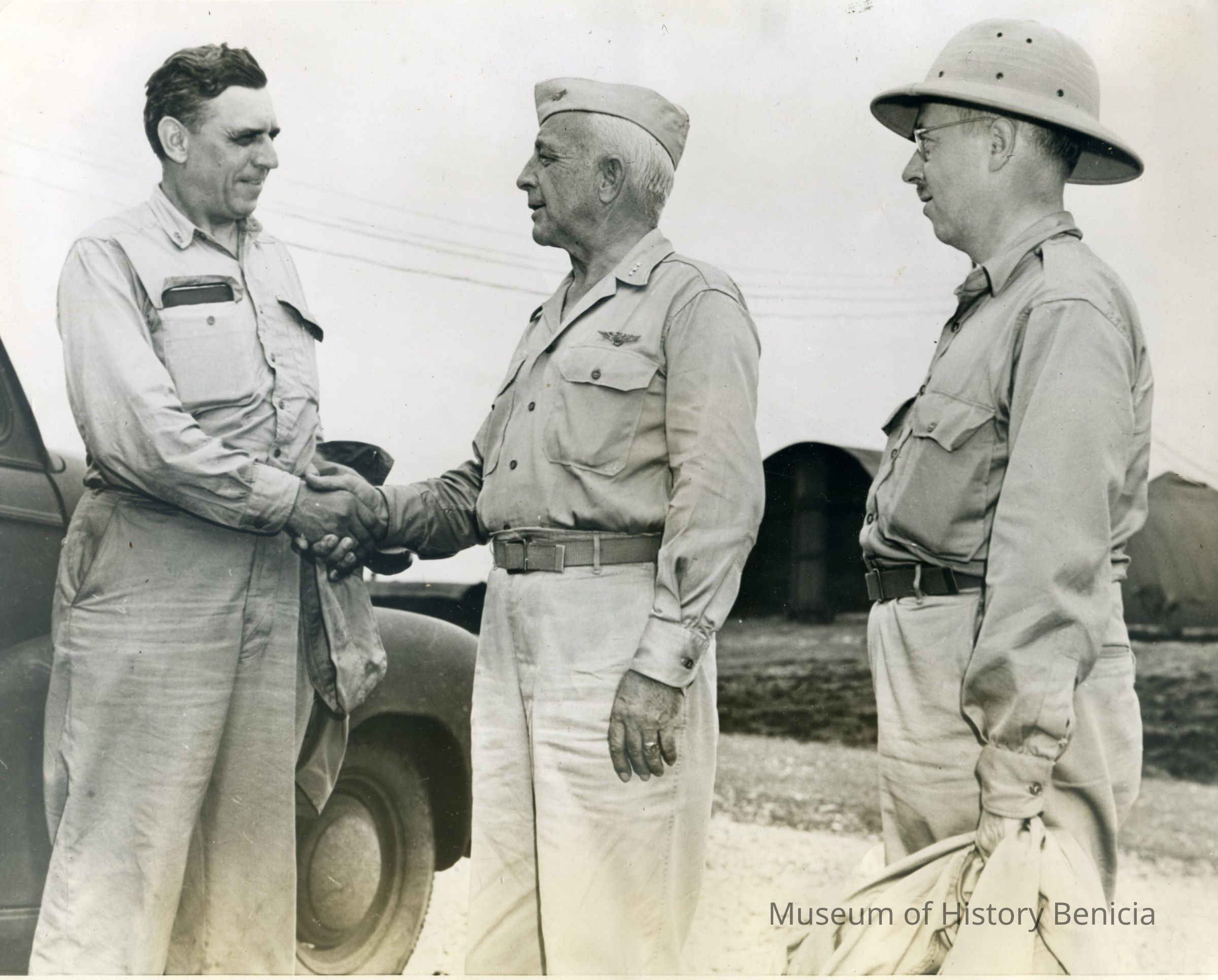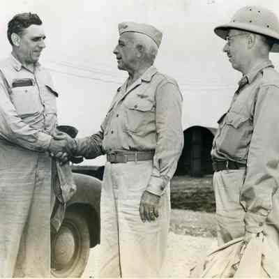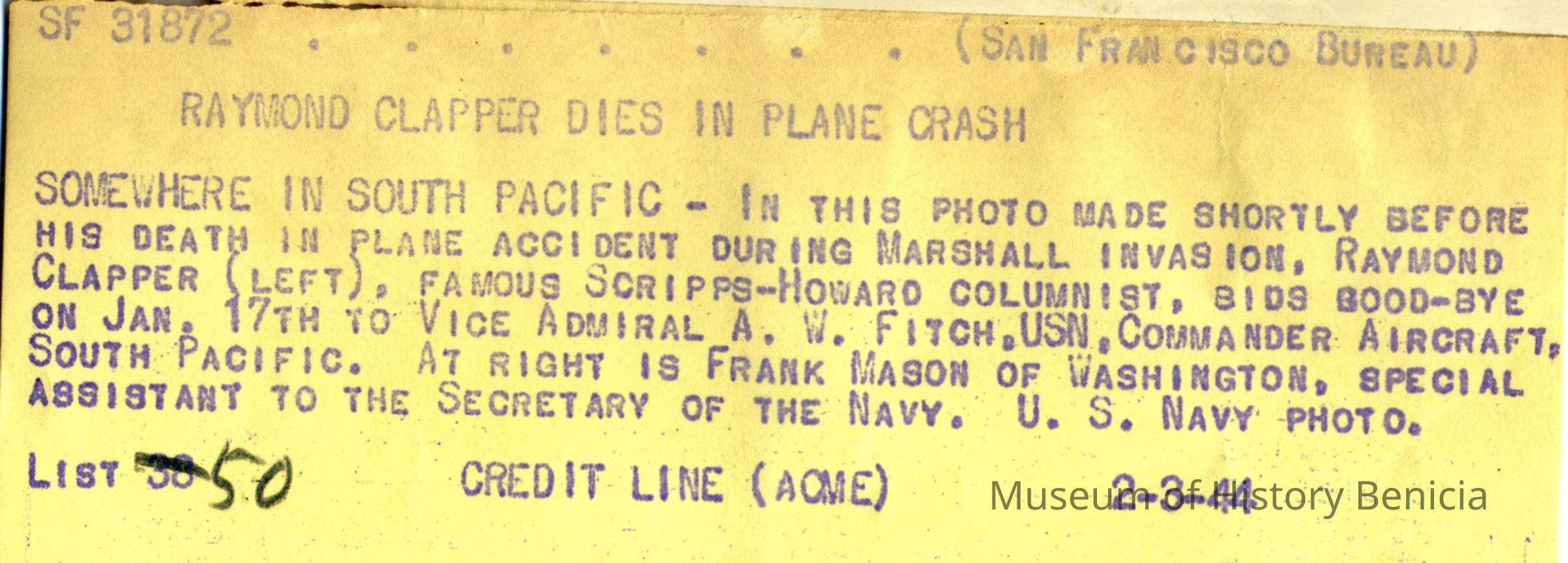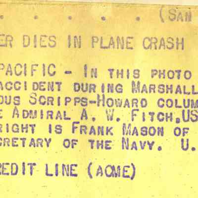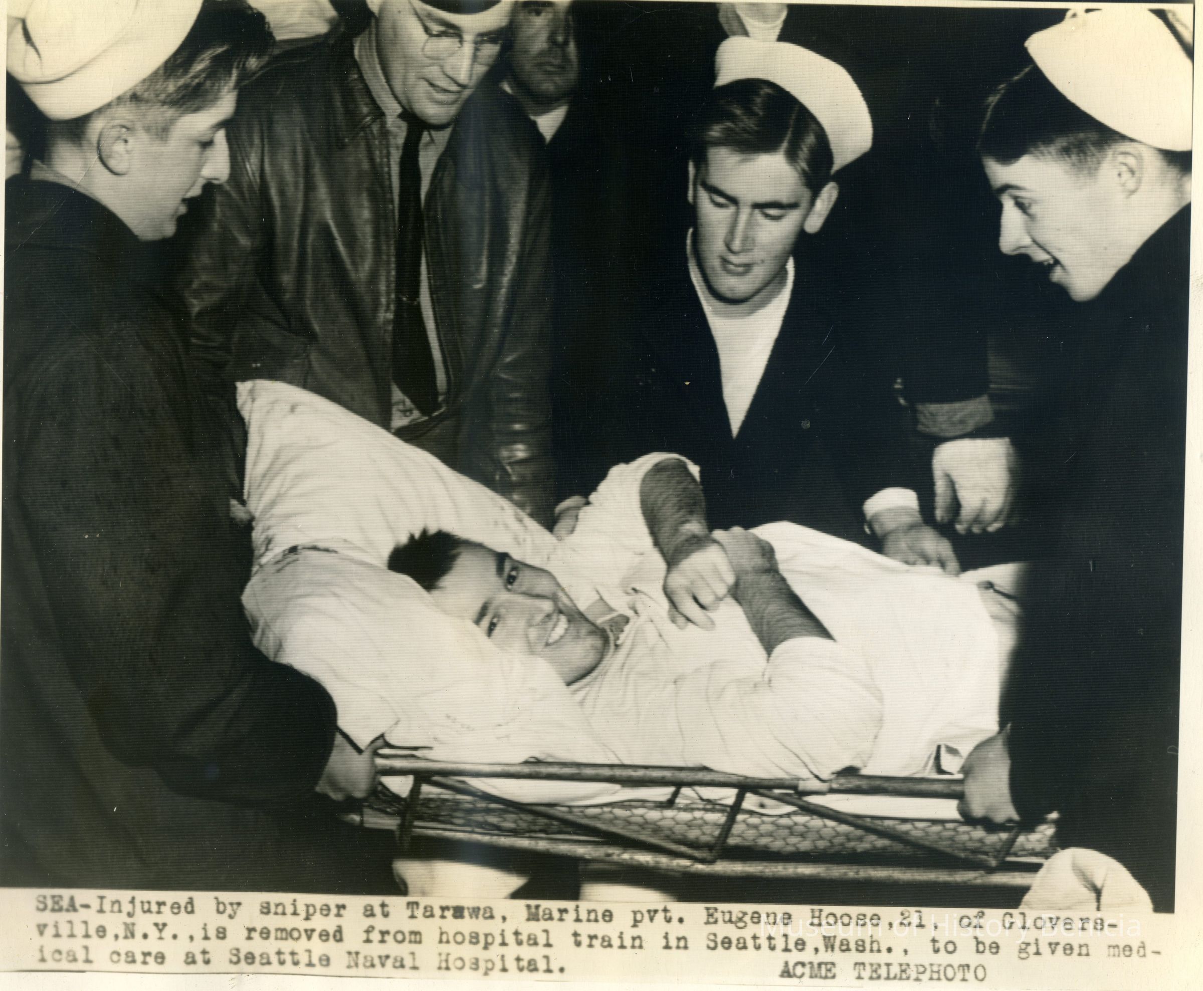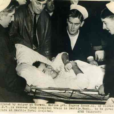 This page shows two photos. One shows a Marine, Pvt. Eugene Hoose, being transferred o Seattle WA by hospital train. The other shows Scripps-Howard columnist Raymond Clapper shortly before his death in an airplane crash. He is picture with Vice Admiral A.W. Fitch and Frank Mason, Asst. to Secty of Navy.Collection