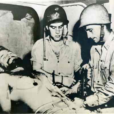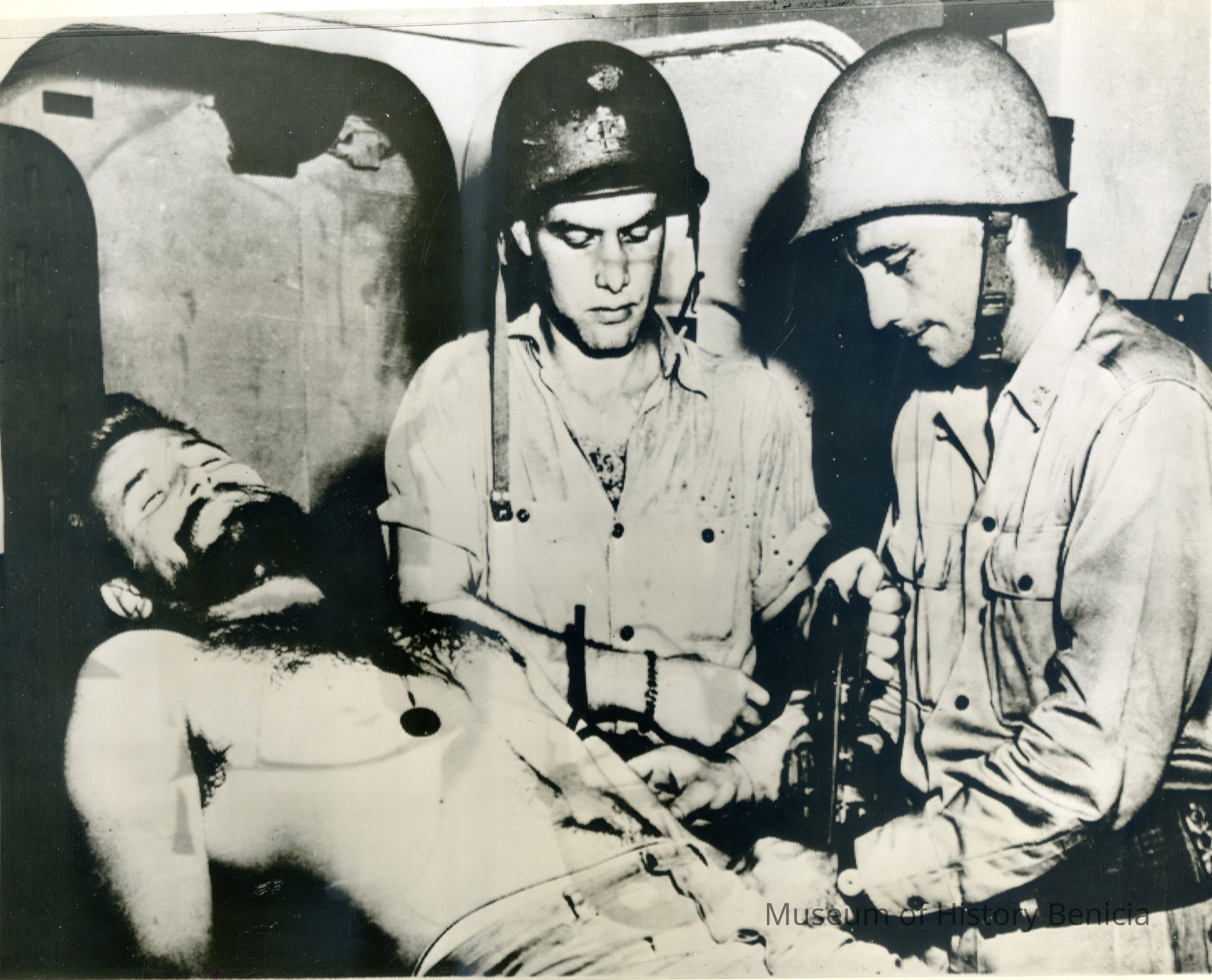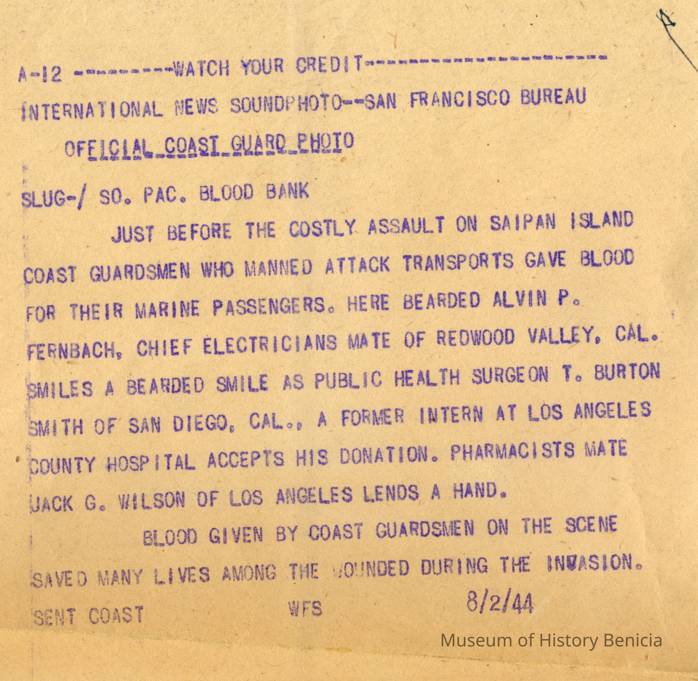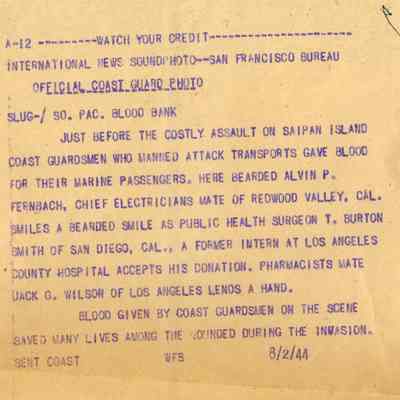 This is a loose photo that was at the back of the scrapbook. It shows Coast Guardsmen giving blood to their Marine passengers.Collection