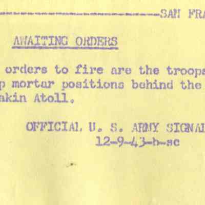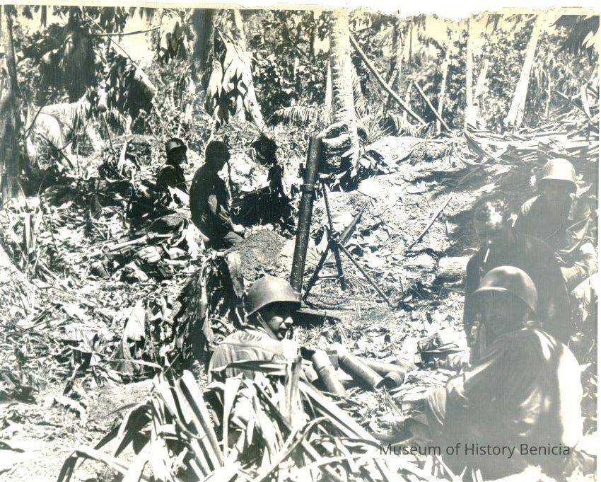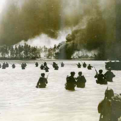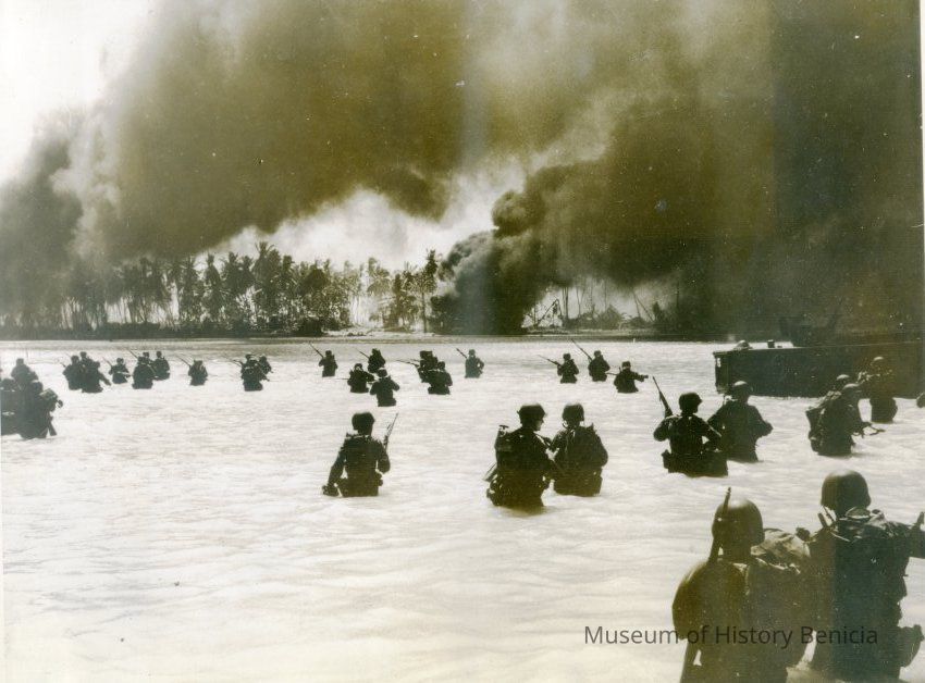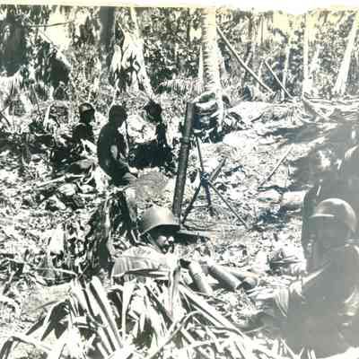 This page shows two photos. One shows troops of the 165th Infantry on Kakin Island with mortar positions. The second is troops of the 165th Infantry wading ashore on Makin Island.Collection