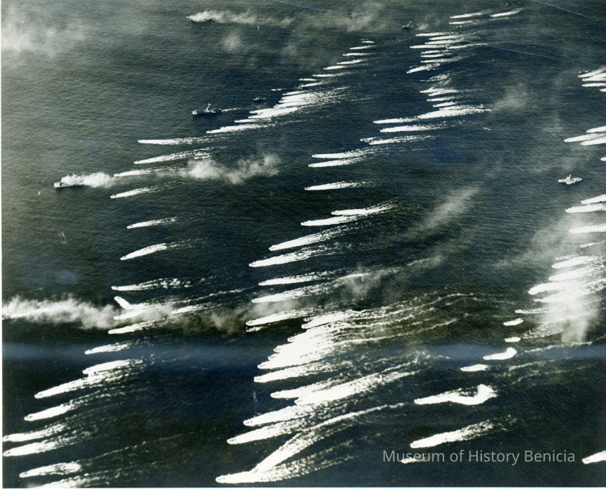 This is a loose photo that was at the back of the scrapbook. It shows American landing craft swarming towards Guam shores.Collection