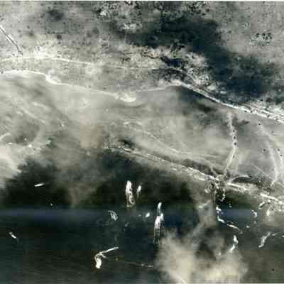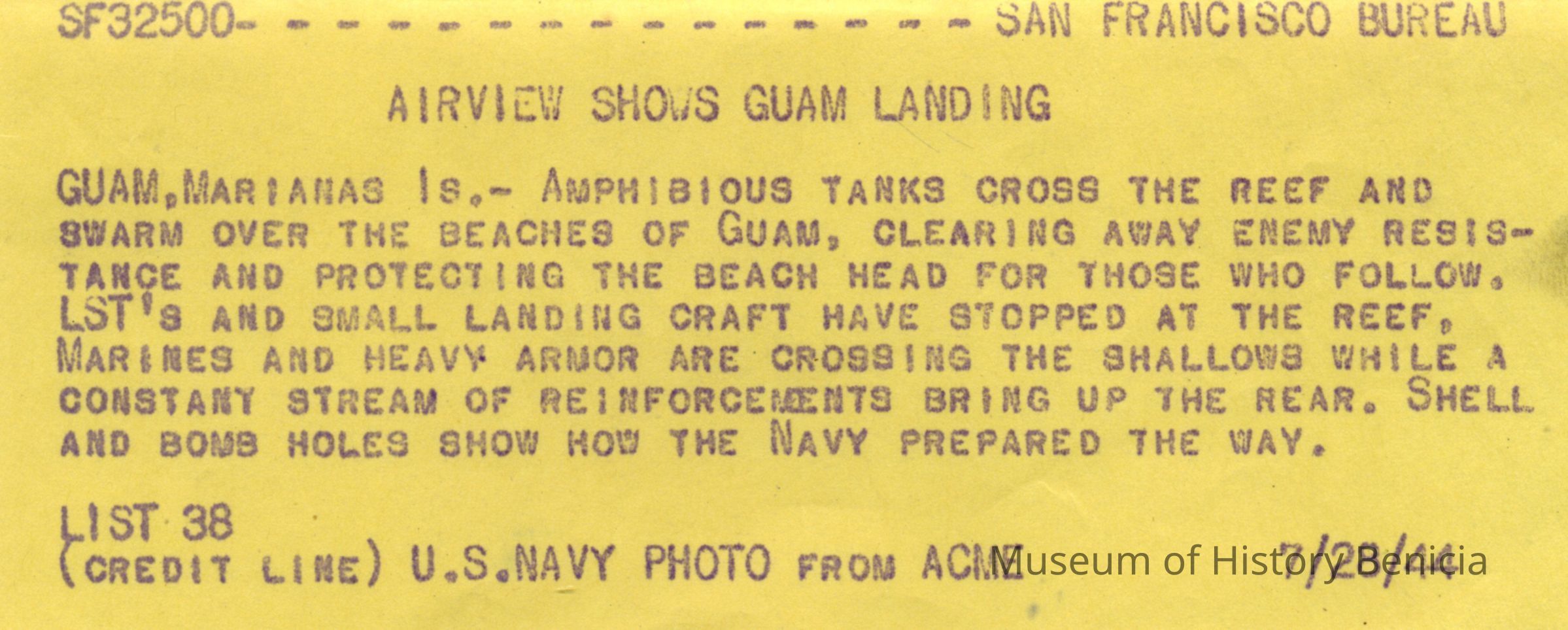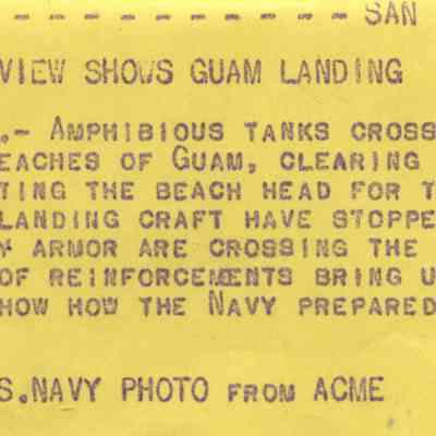 This is a loose photo that was at the back of the scrapbook. It shows amphibious tanks crossing the reef towards Guam shores.Collection