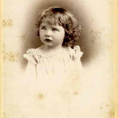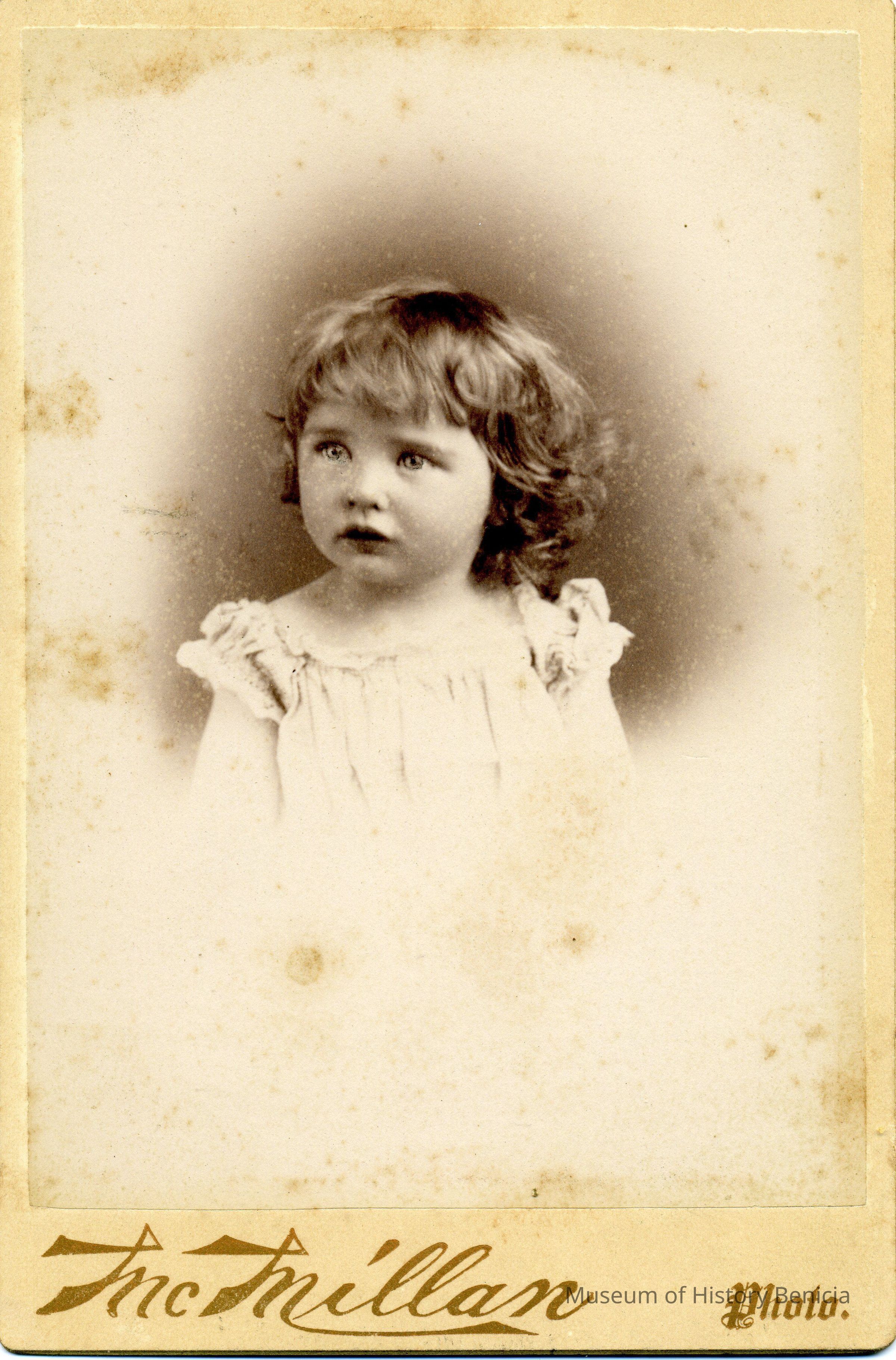 Cabinet photo of a girl. It is in a studio. The image shows some foxing. It came from a photo album of portraits with some photos with names of subjects. Family names: Durrant, Pfister, Dalton, Reynolds, Booth, Gucker. Album is covered in red plush. This photo shows the name Hazel Dalton Newfield written under the photo in the album. It was taken by McMillian probably in Sacramento.