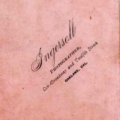 Cabinet photo of a woman standing next to a chair. It is in a studio. The image shows some foxing. It came from a photo album of portraits with some photos with names of subjects. Family names: Durrant, Pfister, Dalton, Reynolds, Booth, Gucker. Album is covered in red plush. This photo shows no name written under the photo in the album. It was taken in Oakland.Collection