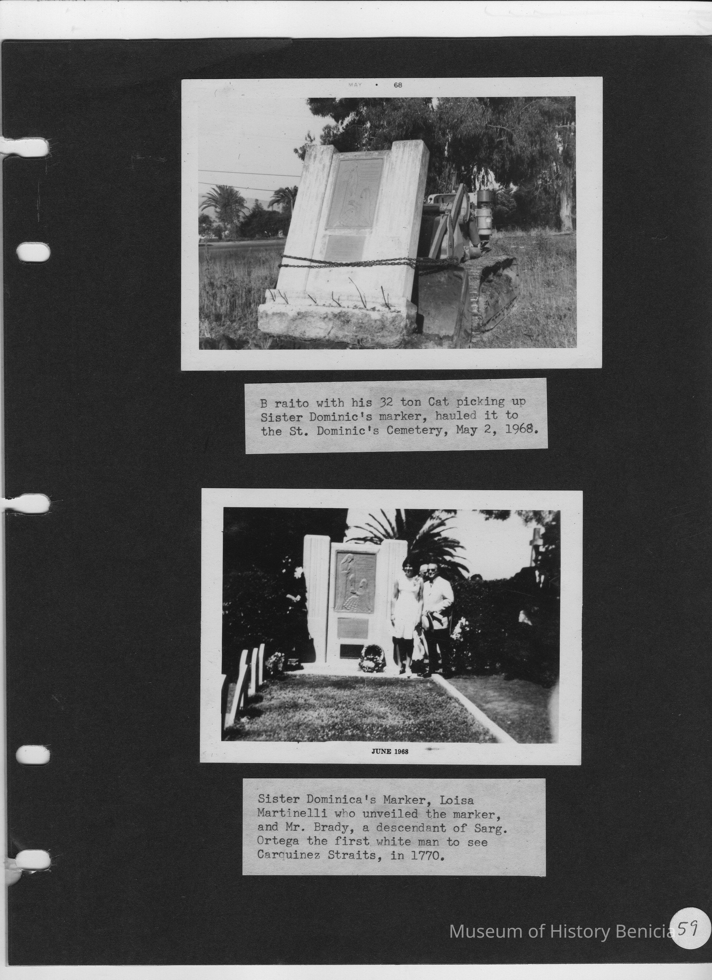 Page contains two B/W photos. Top photo shows Sister Dominica marker being moved by a tractor. Bottom photo shows Loisa Martinelli and Mr. Brady standing by Sister Dominica marker.Collection