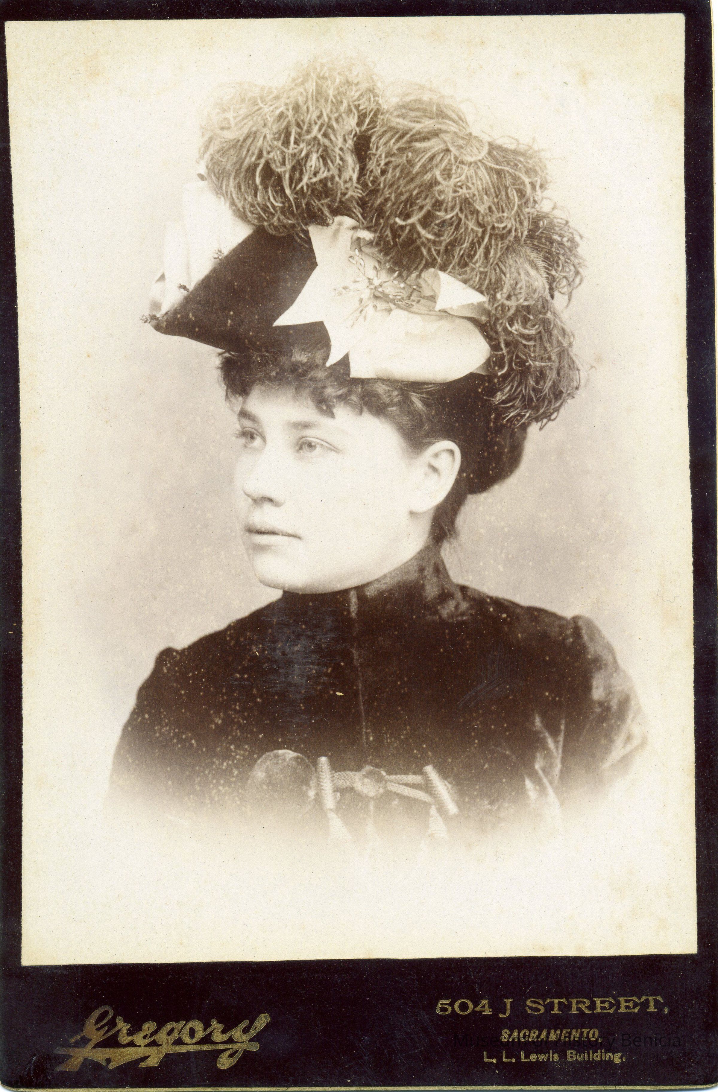 Cabinet photo of a woman. It is in a studio. The image shows some foxing. It came from a photo album of portraits with some photos with names of subjects. Family names: Durrant, Pfister, Dalton, Reynolds, Booth, Gucker. Album is covered in red plush. This photo shows no name written under the photo in the album. It was taken in Sacramento.Collection