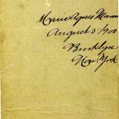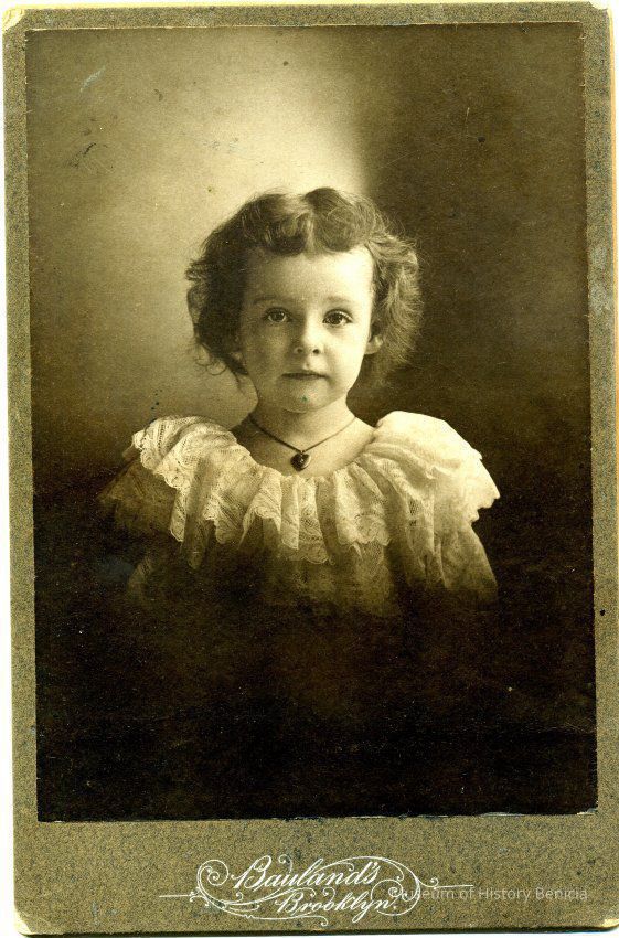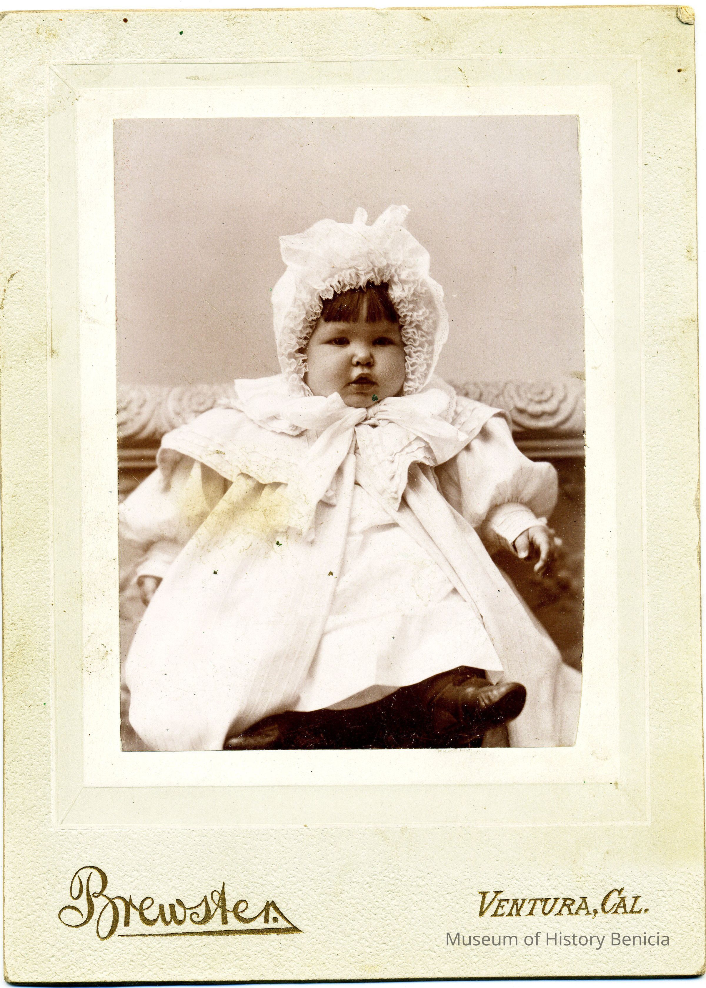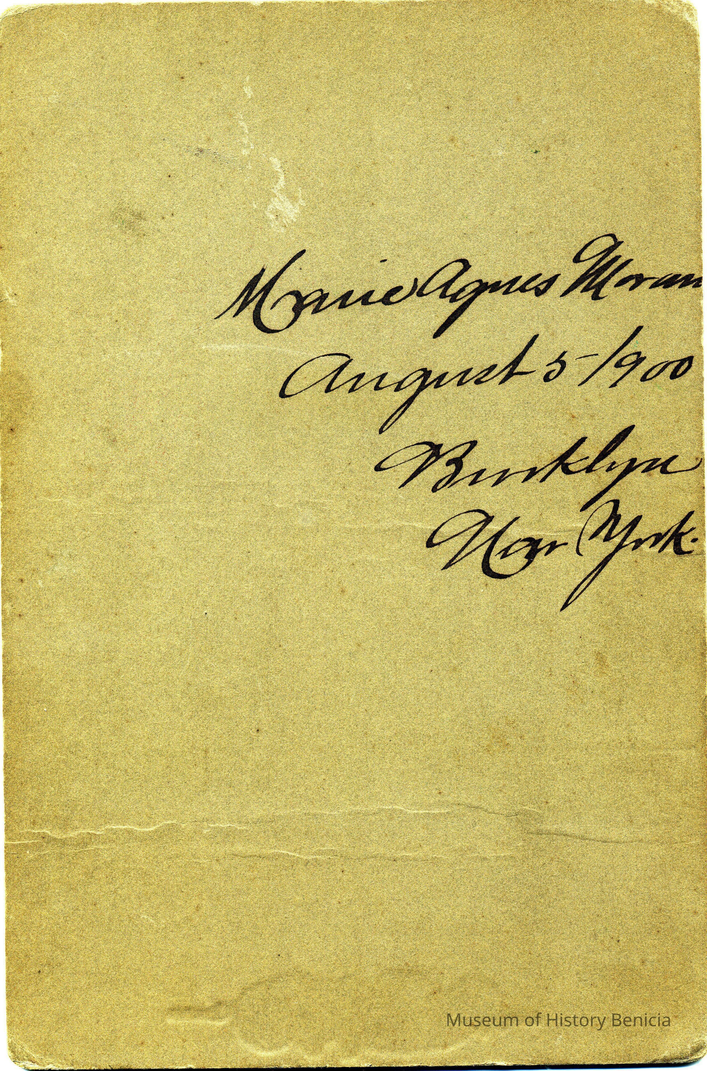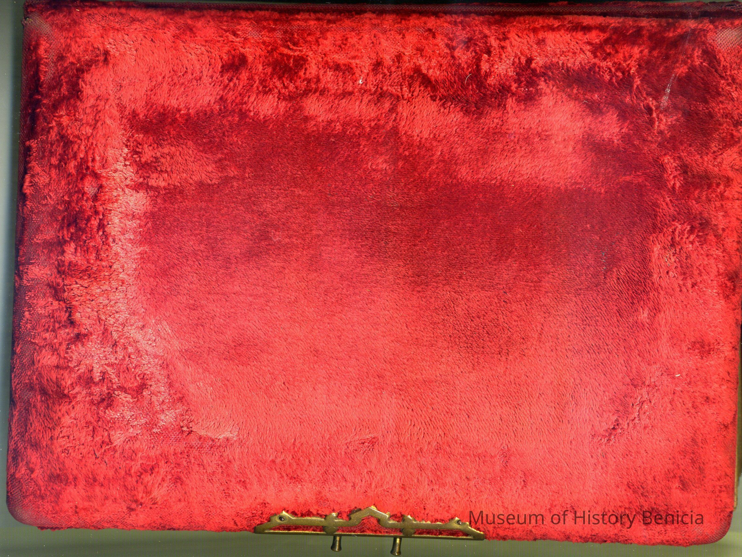 Photo album, red plush, brass chasp. Pages edged in gold leaf, album printed in golden flyleaf. 32 photos some inscribed "Brewster Ventura Cal"; or "Baulands, Brooklyn. Backing is completely separated from pages. Plush velvet worn. Some frames are split. Some photos are discolored.