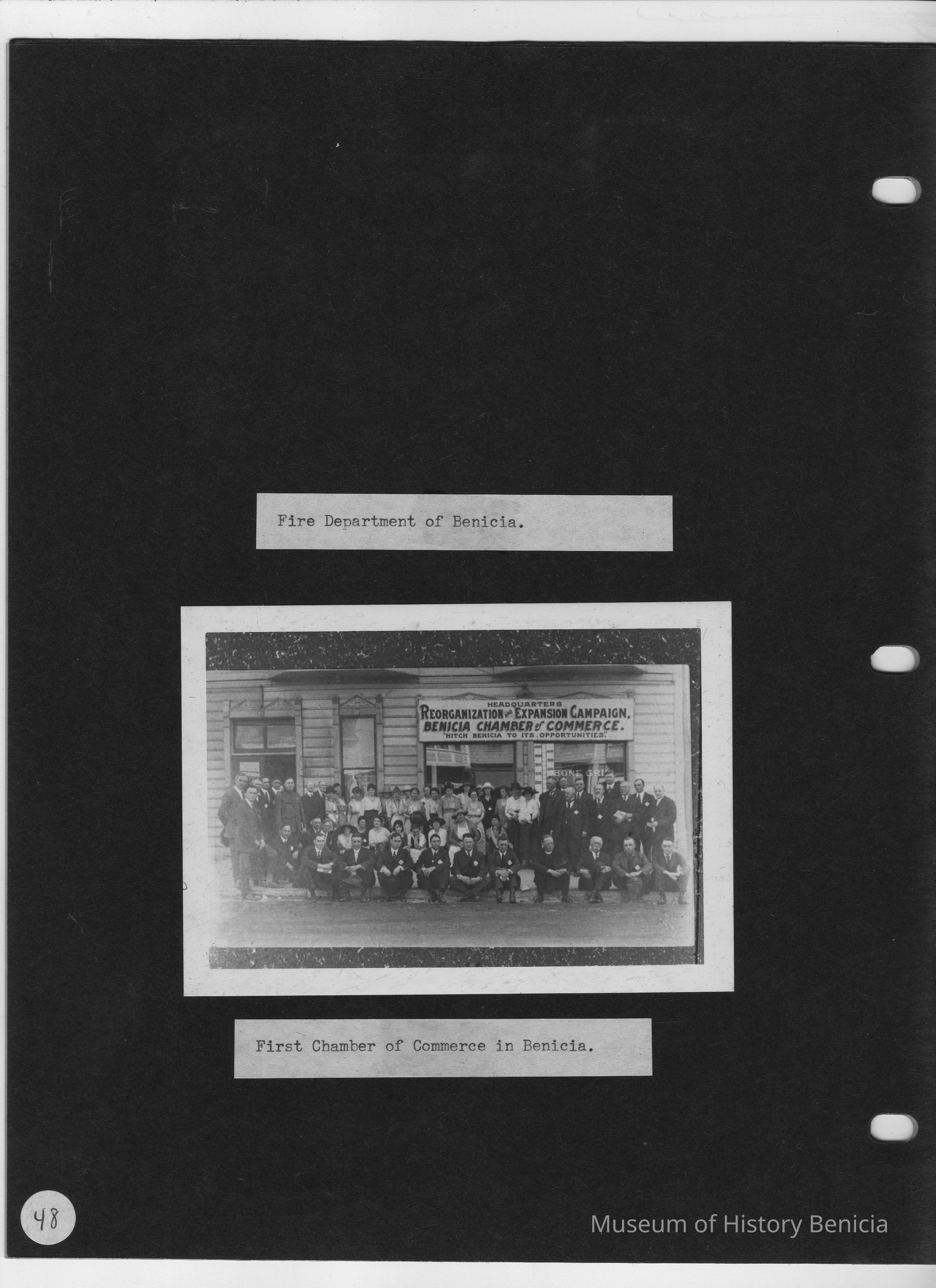 Page contains one black and white photo of the first Chamber of Commerce office in Benicia. Label above photo reads "Fire Department of Benicia", indicating that there was originally another picture on this page.