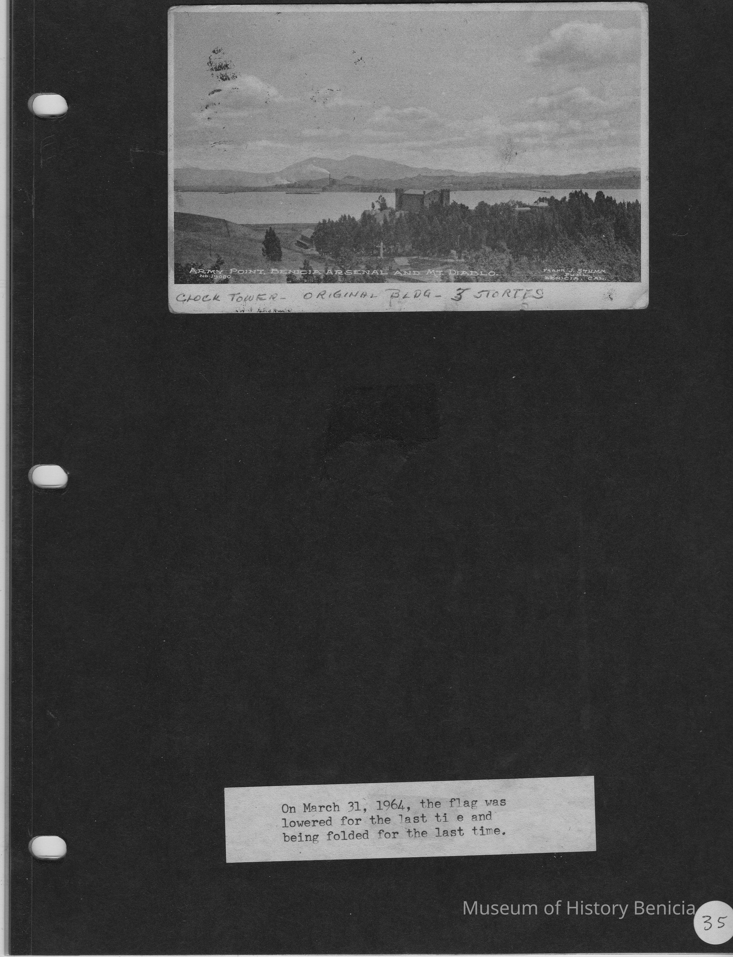 Page contains two B/W photos. Top one is of the Clock Tower, with Mount Diablo visible in the background. Bottom photo is labeled "March 31, 1964, the flag was lowered for the last time and being [sic] folded for the last time.Collection
