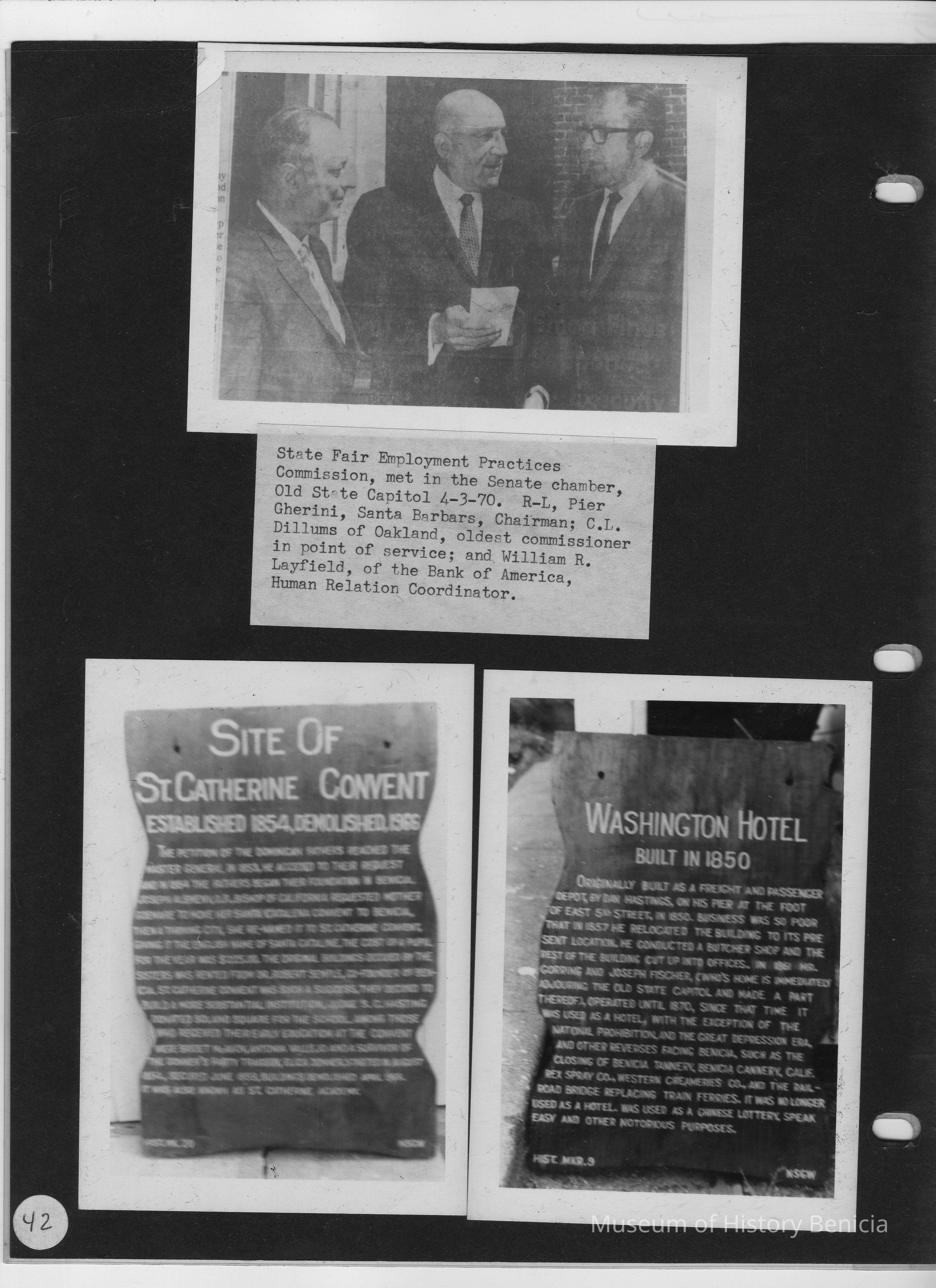 Page contains three B/W photos. Top photo shows three members of State Fair Employment Practices Commission (Pier Gherini, C.L. Dillums, William R. Layfield). Bottom left photo shows marker commemorating St. Catherine's Convent. Bottom right photo shows historical marker at Washington Hotel.Collection