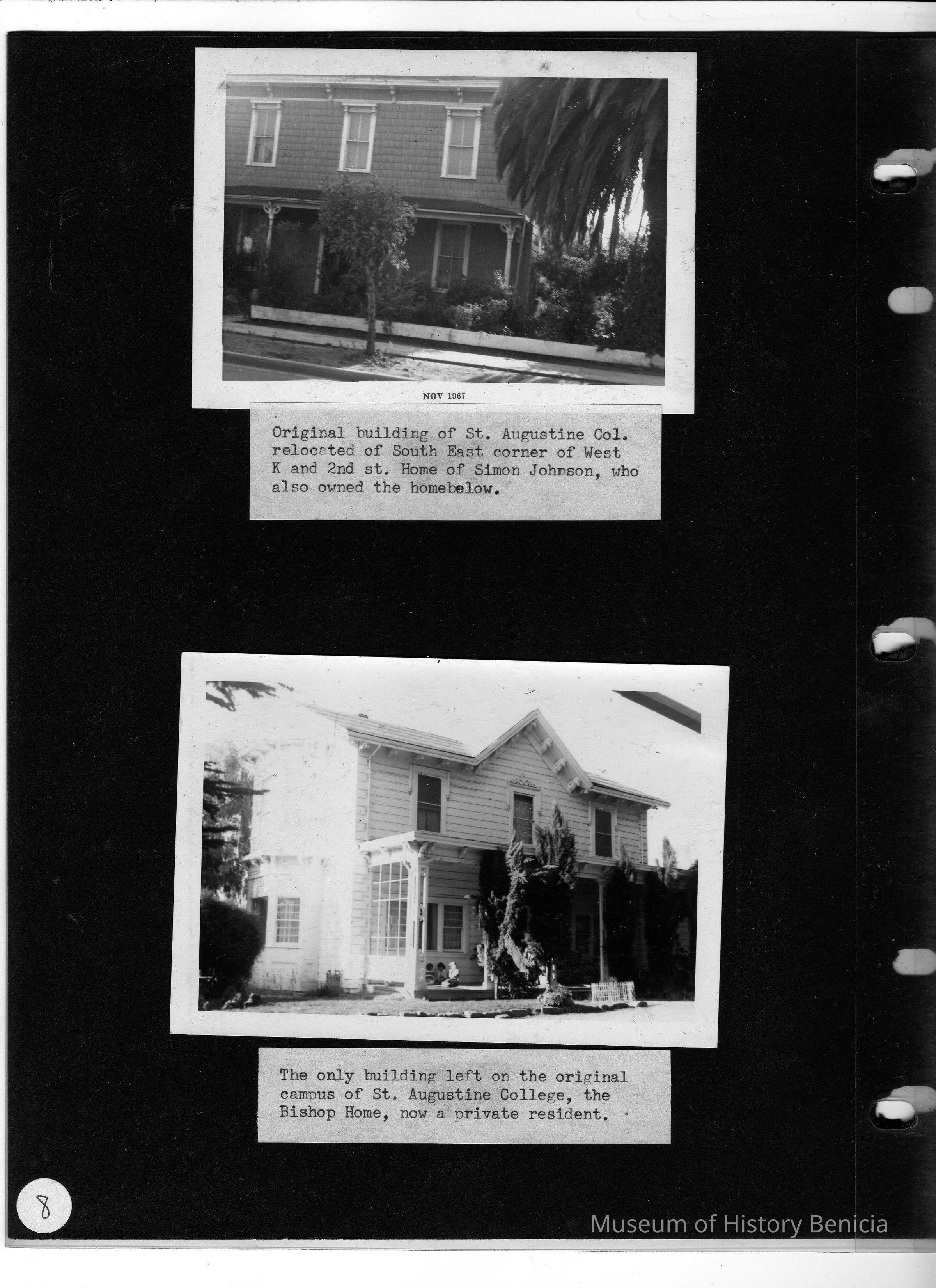 Page contains two B/W photos. Top photo shows an original building of St. Augustine's College, relocated to the southeast corner of West Second and K Streets. Bottom photo shows the only St. Augustine's College building left on the original campus.Collection