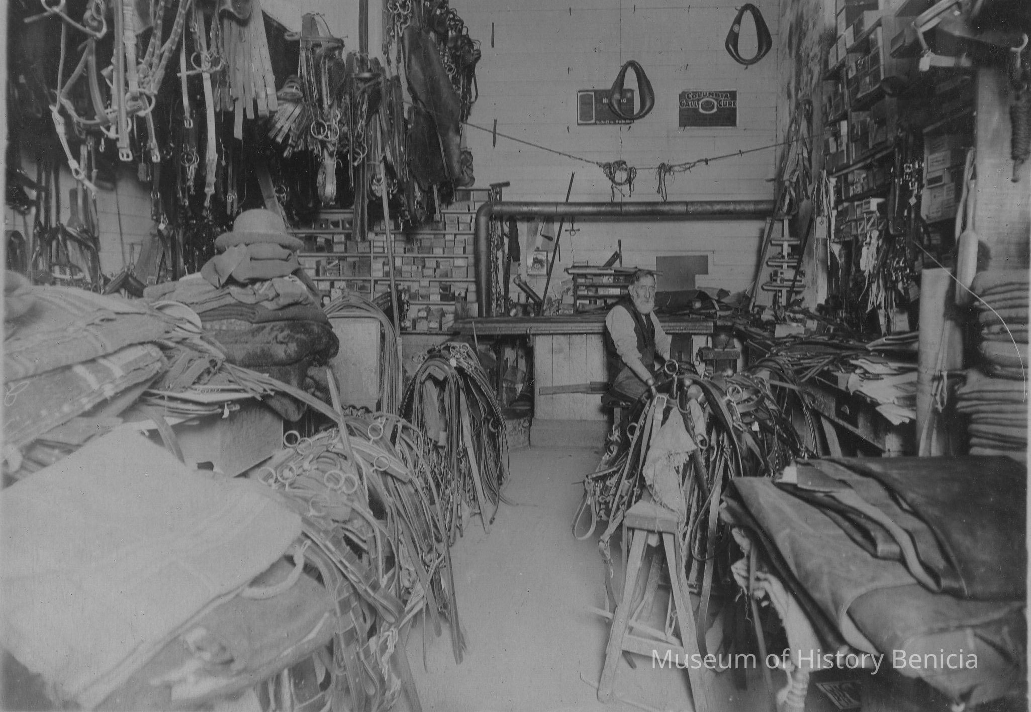 Page contains one sepia-toned photograph of some sort of shop or workshop interior. A bearded man sits right of center amid the clutter. From the looks of it, this seems to be a horse-related supply store.Collection