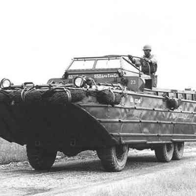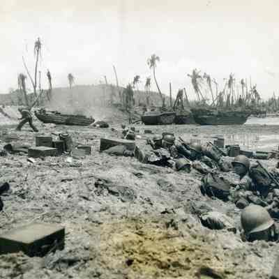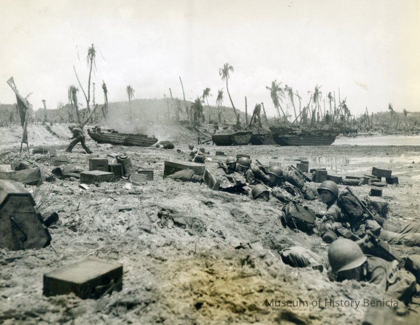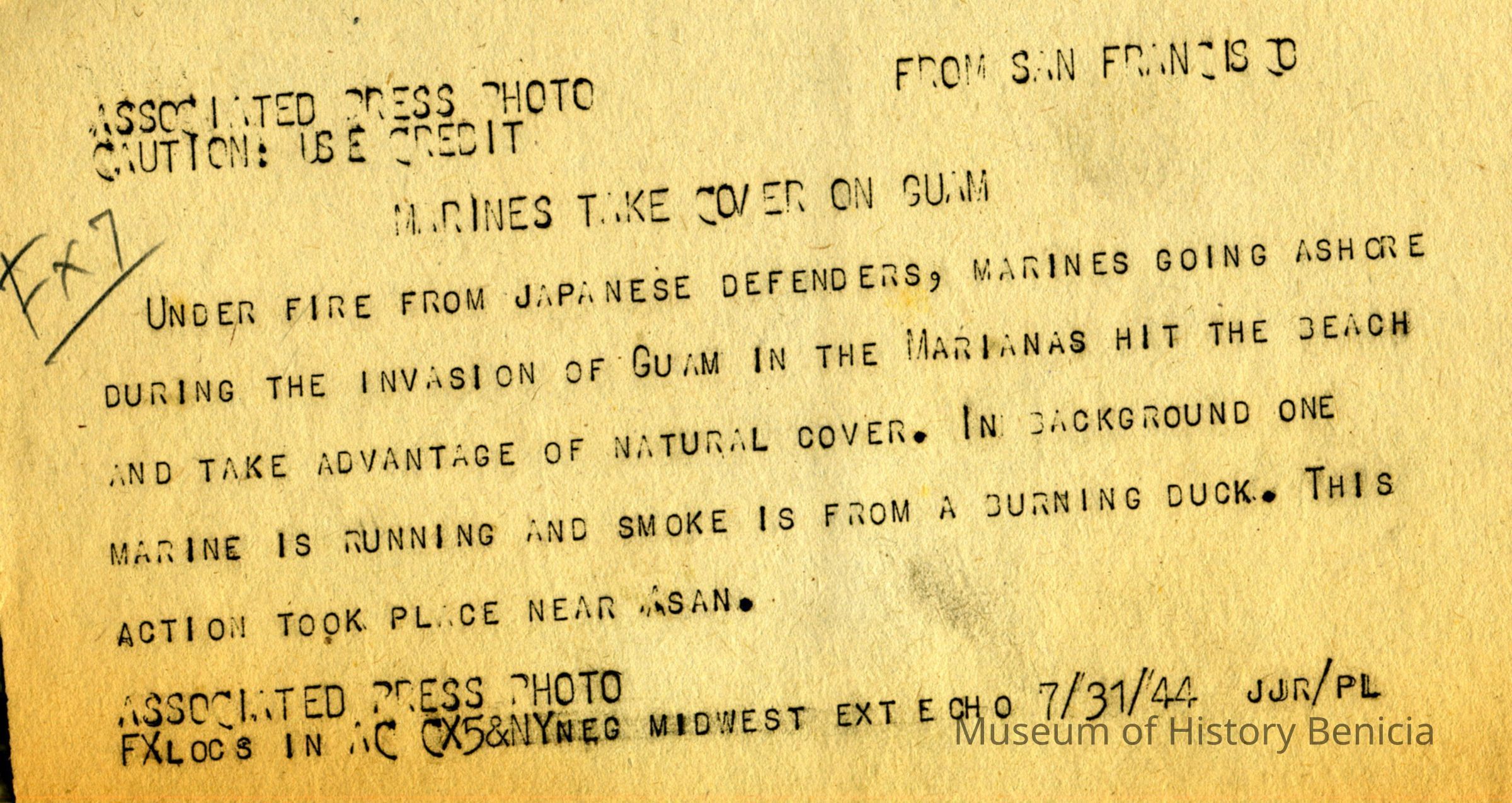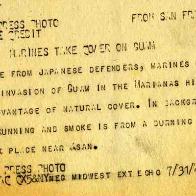 This is a loose photo that was at the back of the scrapbook. It shows Marines on Guam under fire. The smoke in the photo is from a burning Duck( The DUKW (colloquially known as Duck) is a six-wheel-drive amphibious modification of the 2+1/2-ton CCKW trucks used by the U.S. military during World War II and the Korean War.).Collection