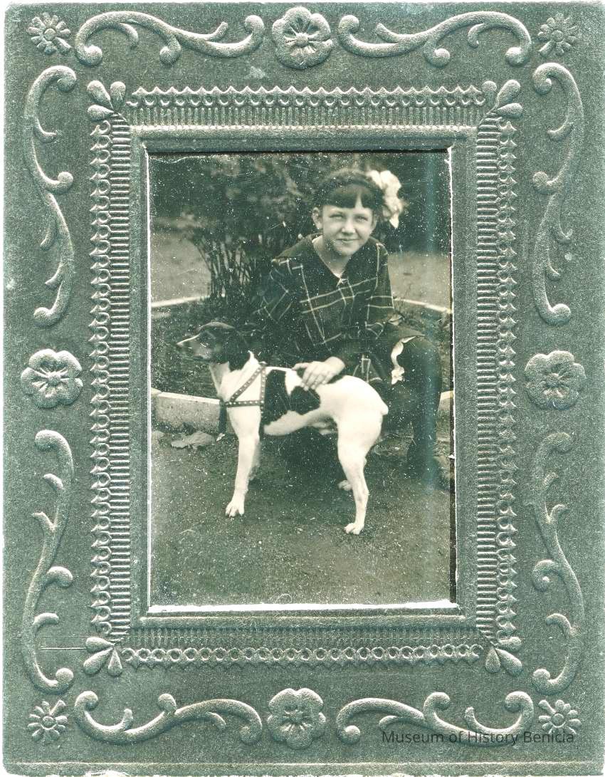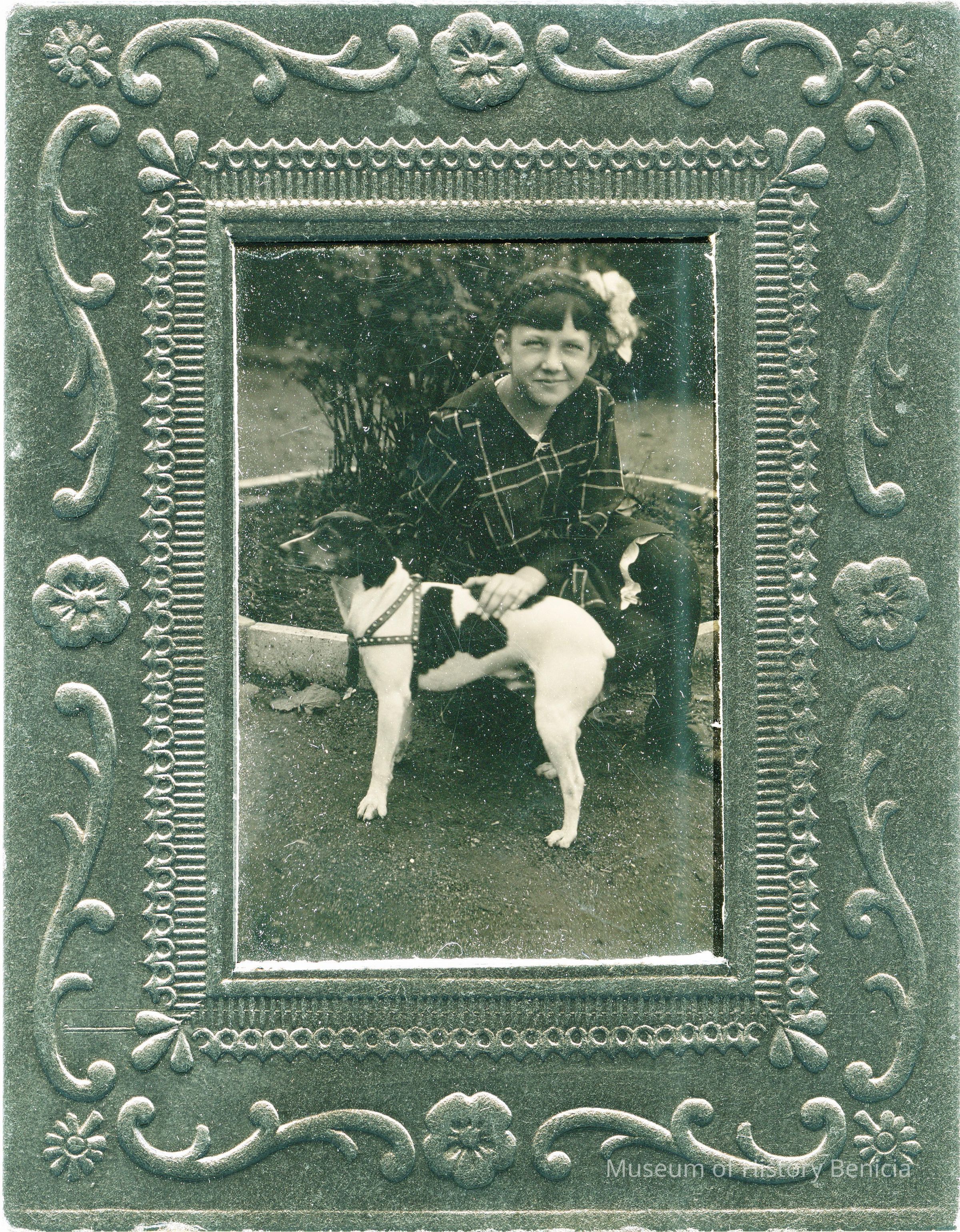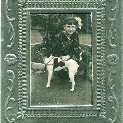 This is a framed photo of a child with their dog. It was found loose in the Rueger family album.