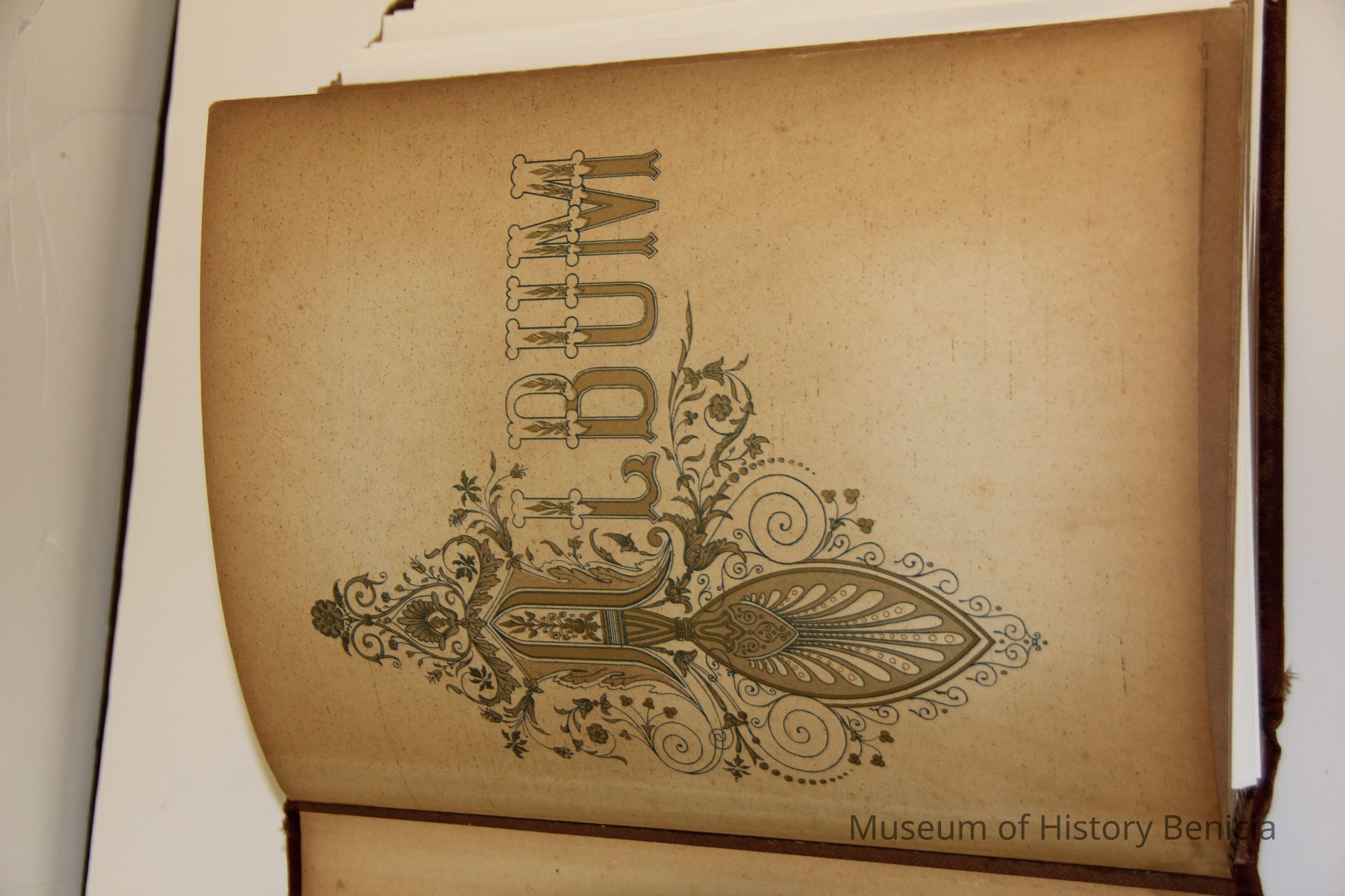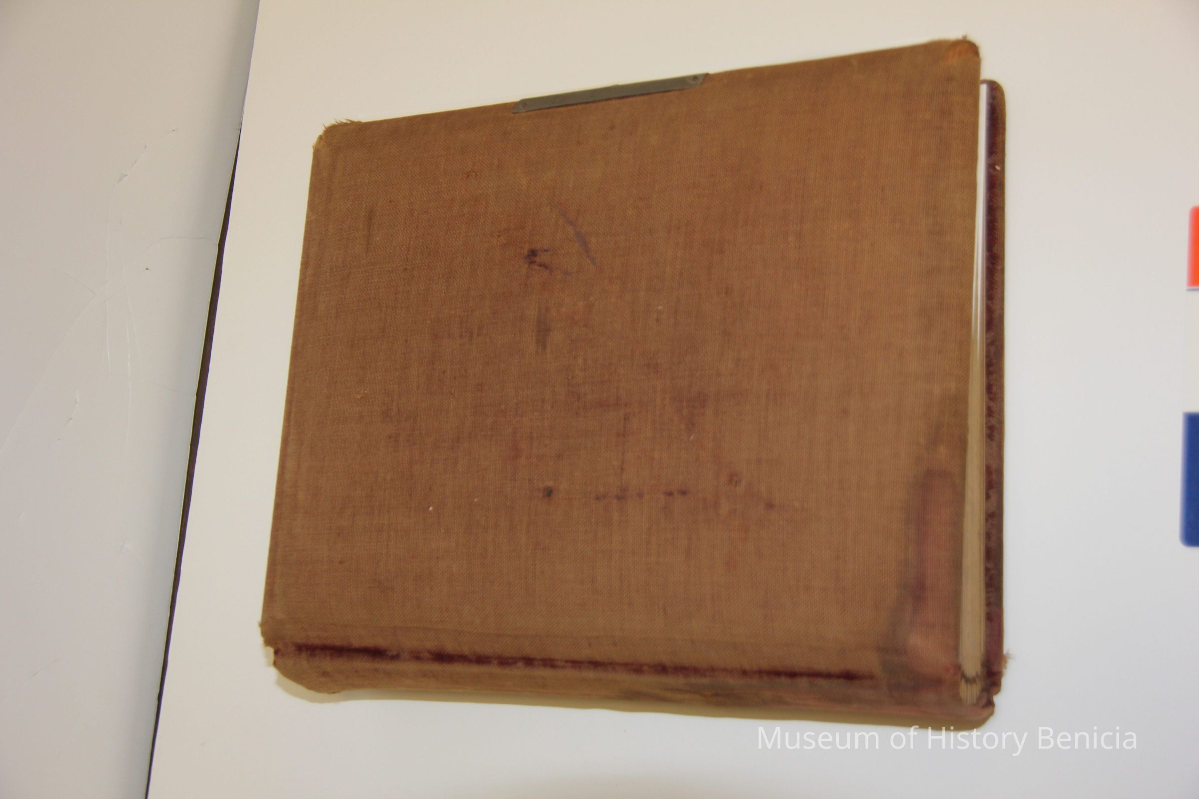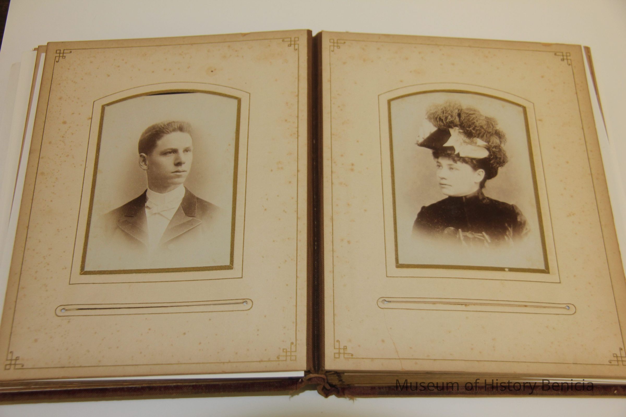 Photo album of portraits with some photos with names of subjects. Family names: Durrant, Pfister, Dalton, Reynolds, Booth, Gucker. Album is covered in red plush.Collection