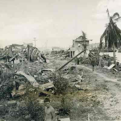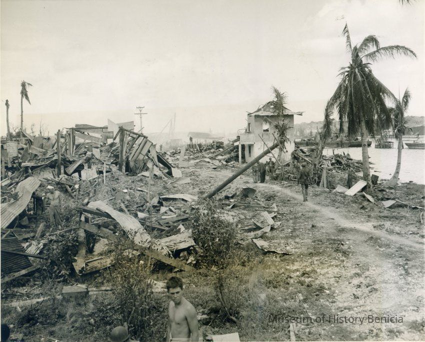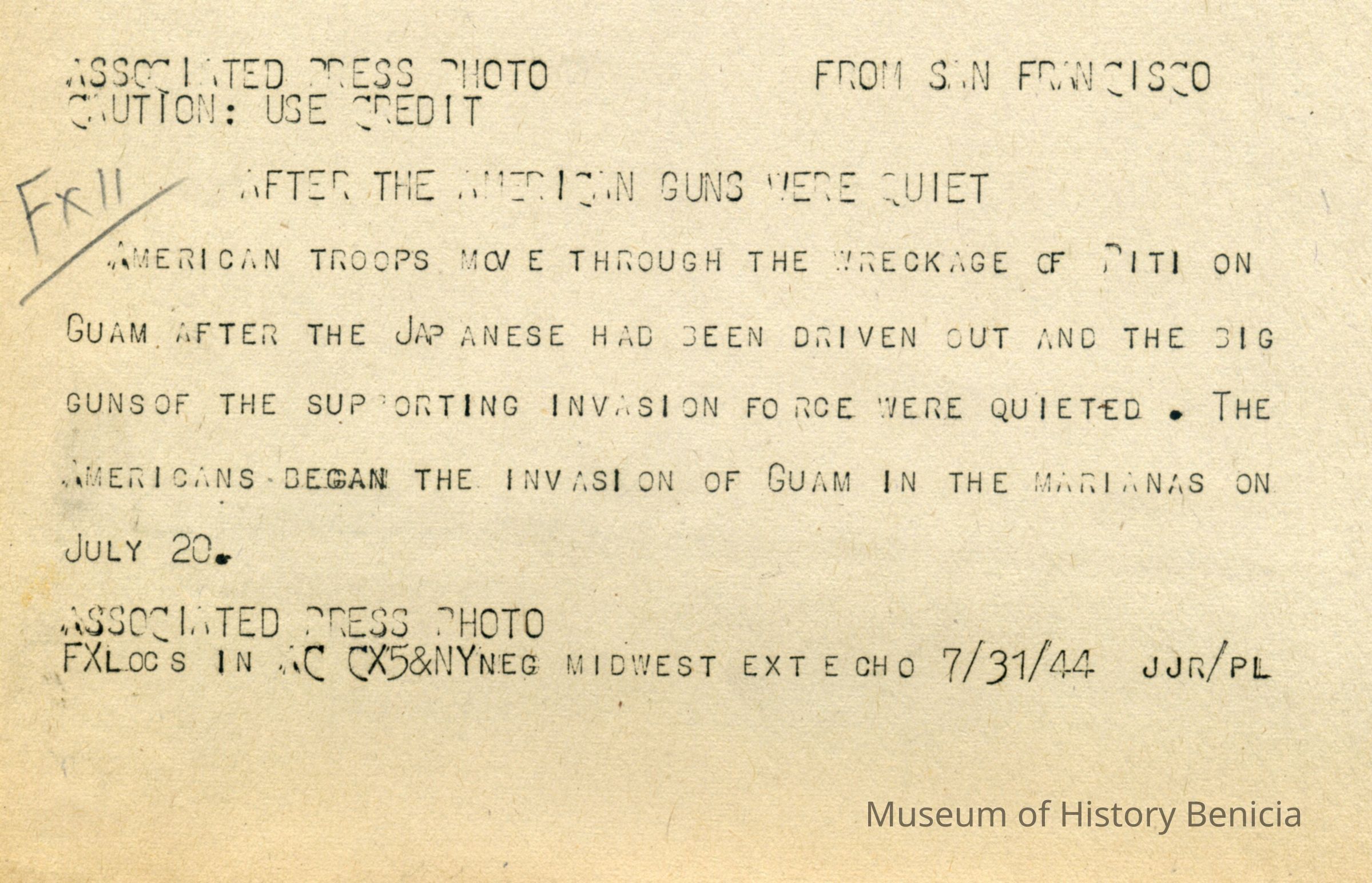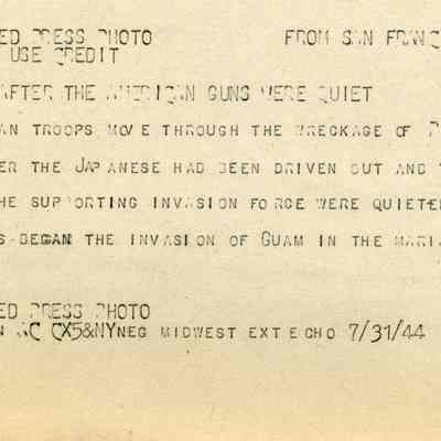 This is a loose photo that was at the back of the scrapbook. It shows American troops moving through the town of Piti inGuam after the Japanese had been driven out.Collection