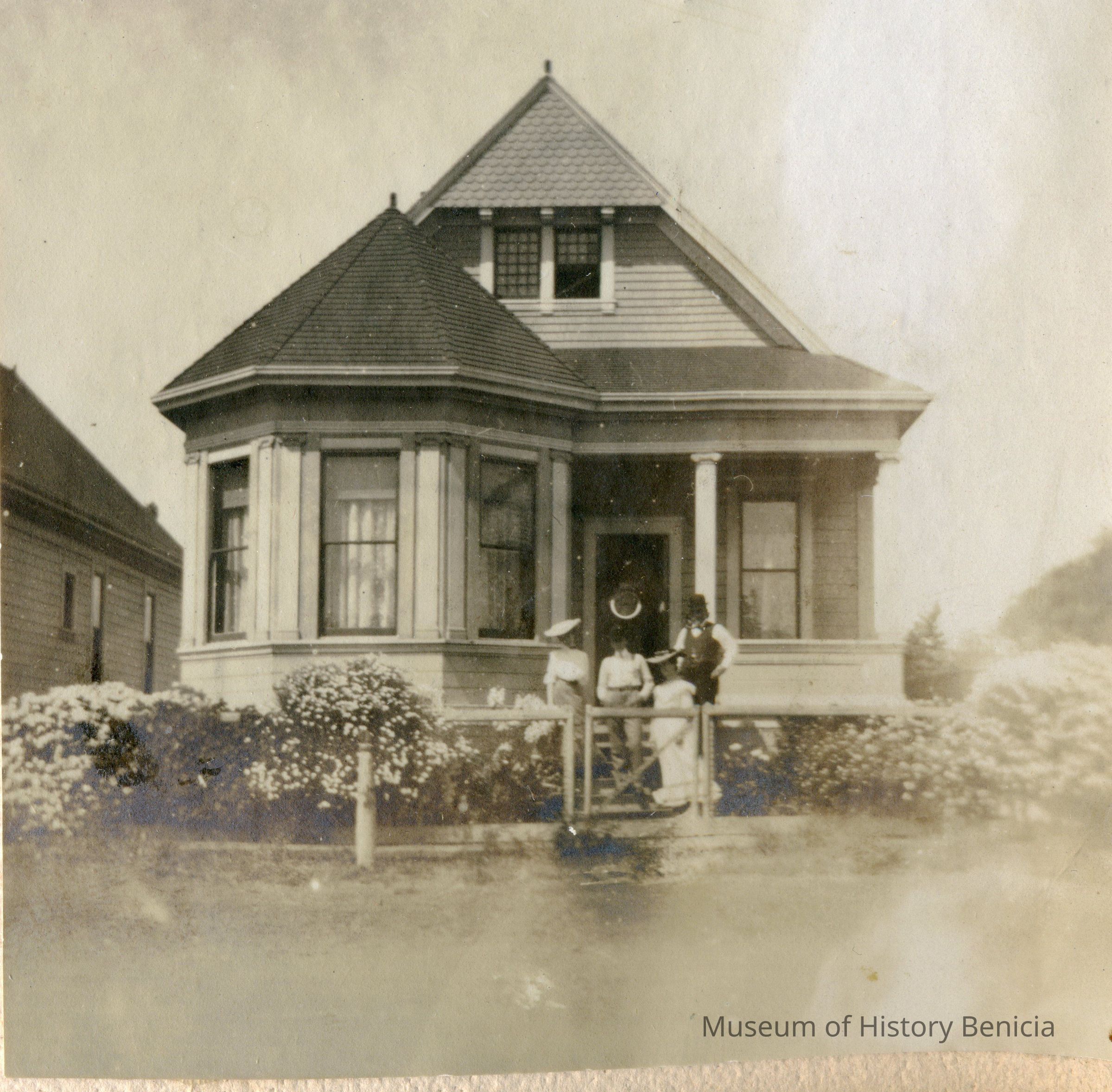 This is a scan of three of the photos on those pages in that album. It shows a house in Benicia with people in front.Collection