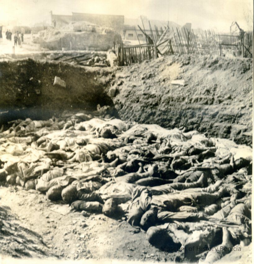 The eigth page shows two photos. One shows Marines guarding their wounded in Bougainville. The second photo shows a mass grave for Japanese soldiers who were killed in the battle Changteh with the Chinese.Collection