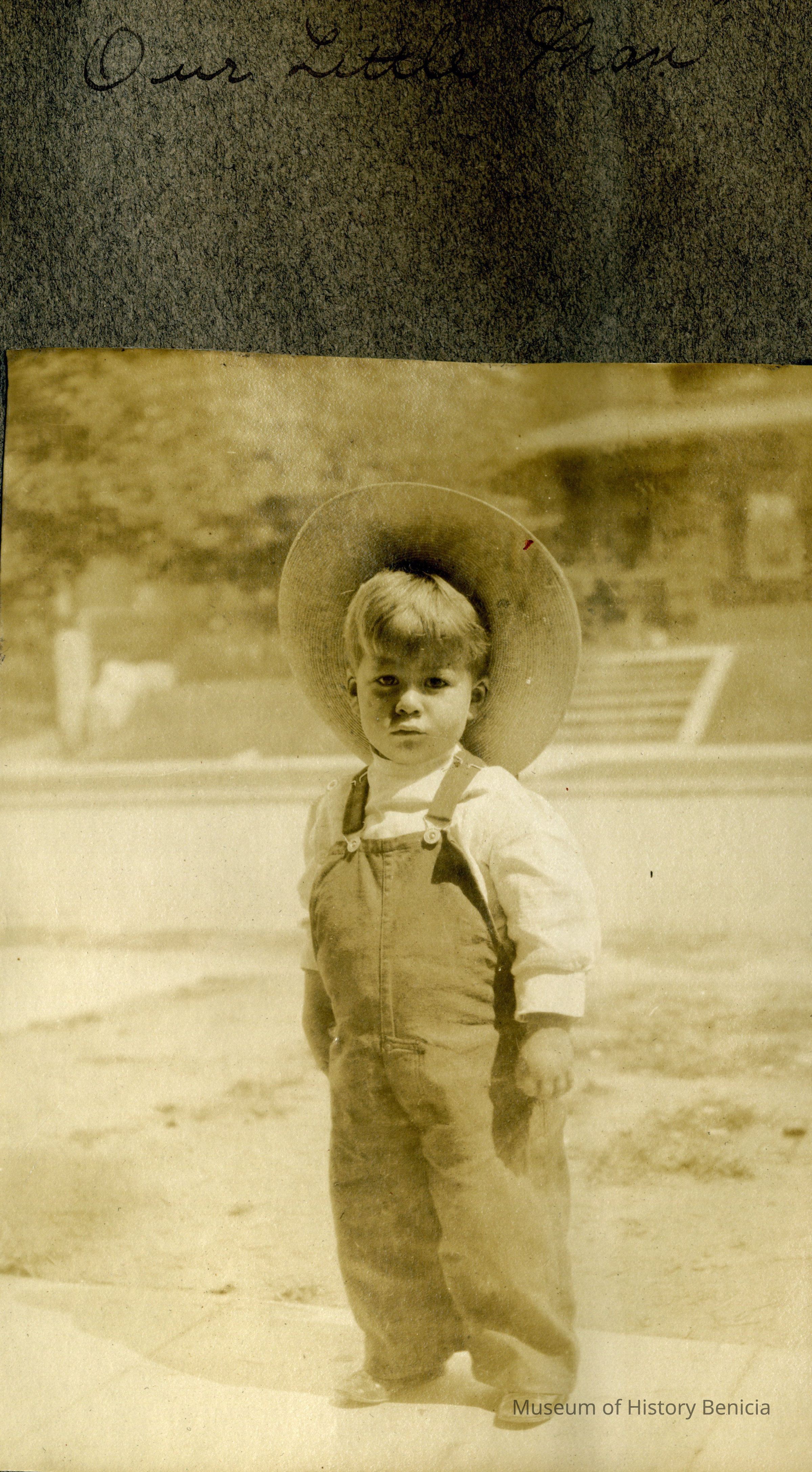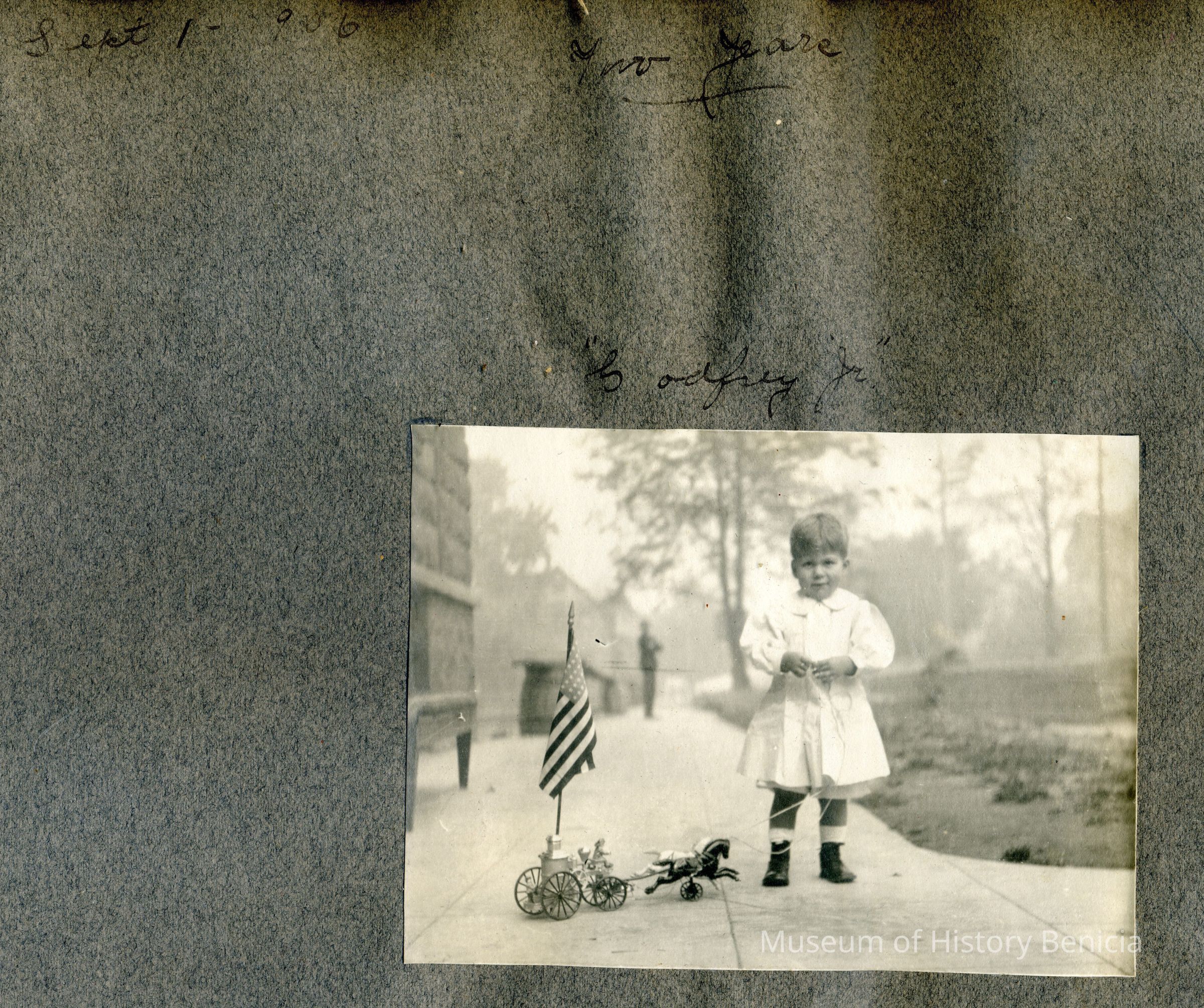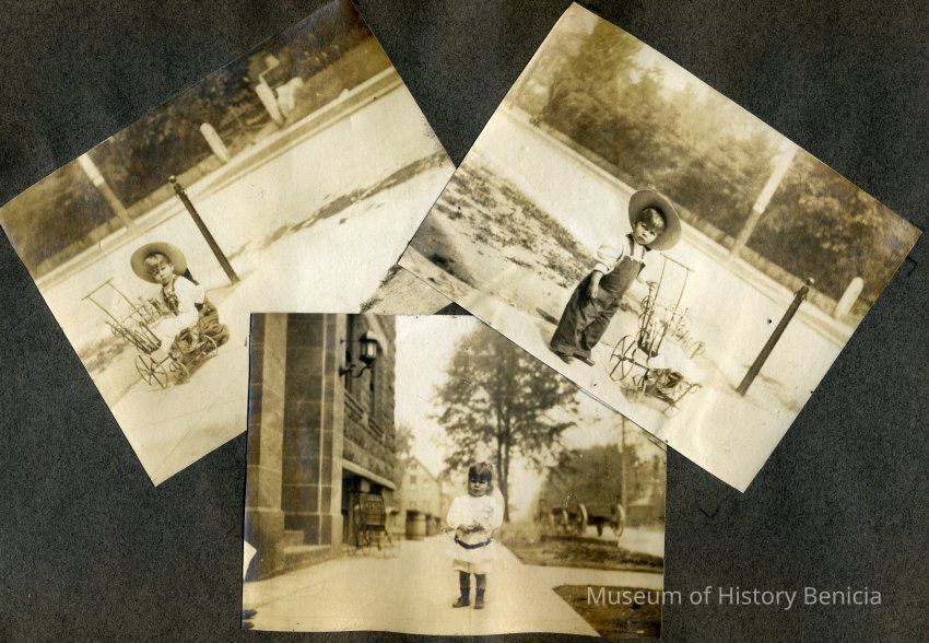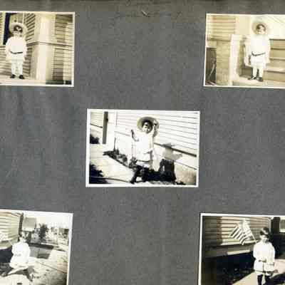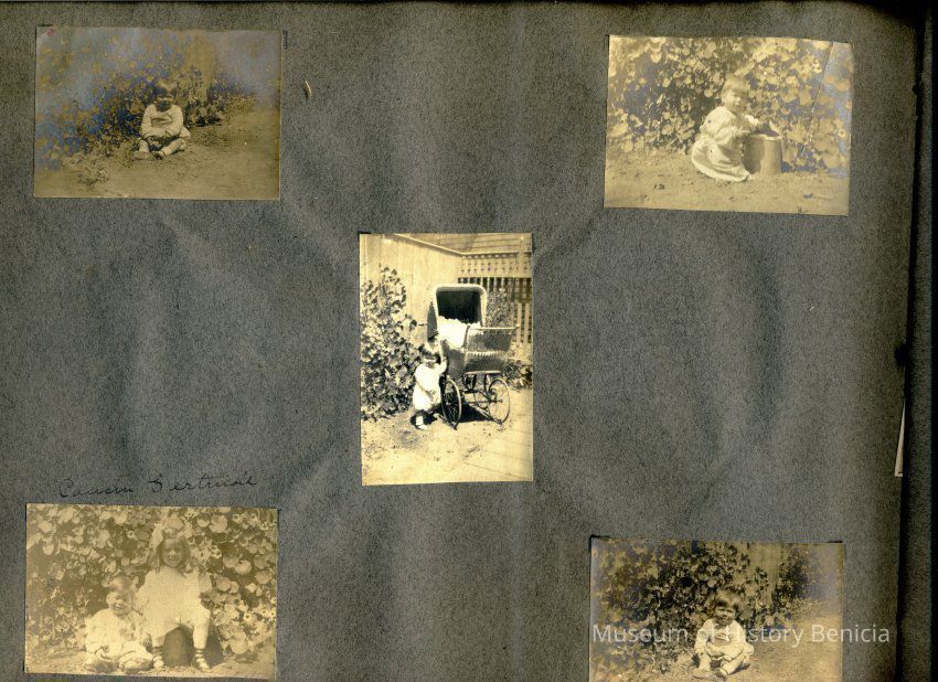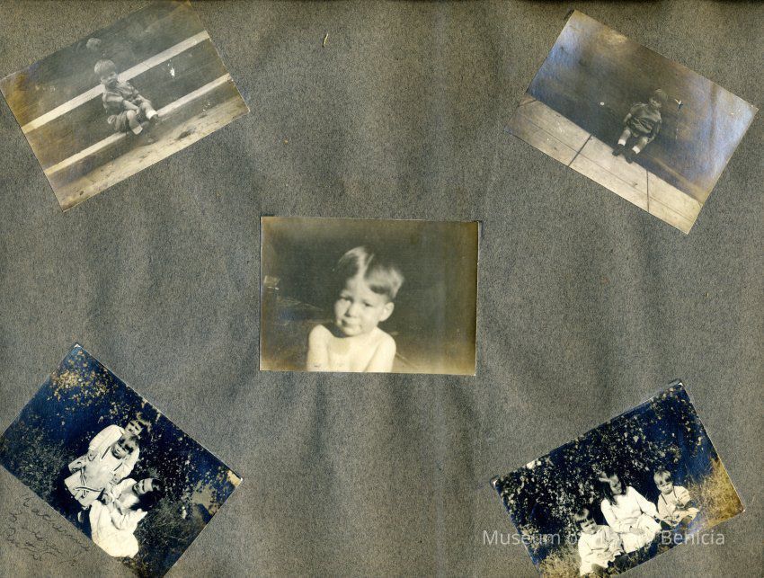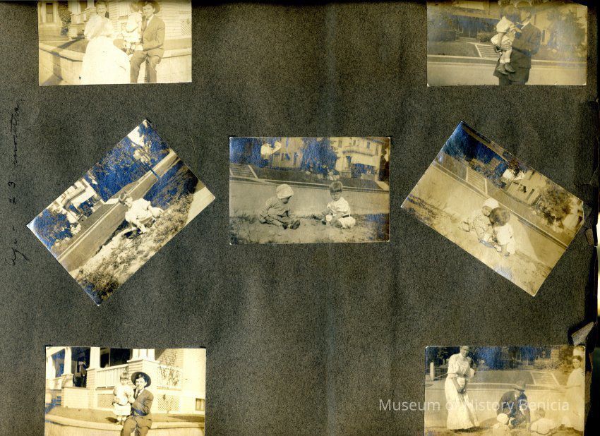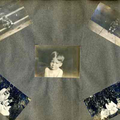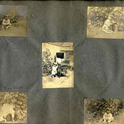This is a velvet covered photo album measuring 10" x 12". It contans mostly photos of Godfrey Rueger Jr. at various ages. Godfrey Jr. was born 09/01/1904 in Benicia and died 03/16/1983 in Los Angeles. His parents were Godfrey Rueger (1875-1956) and Zoe Durner (1884 -). He had a sister named Zor born 1910. I think some of the photos are of her in this album.Collection