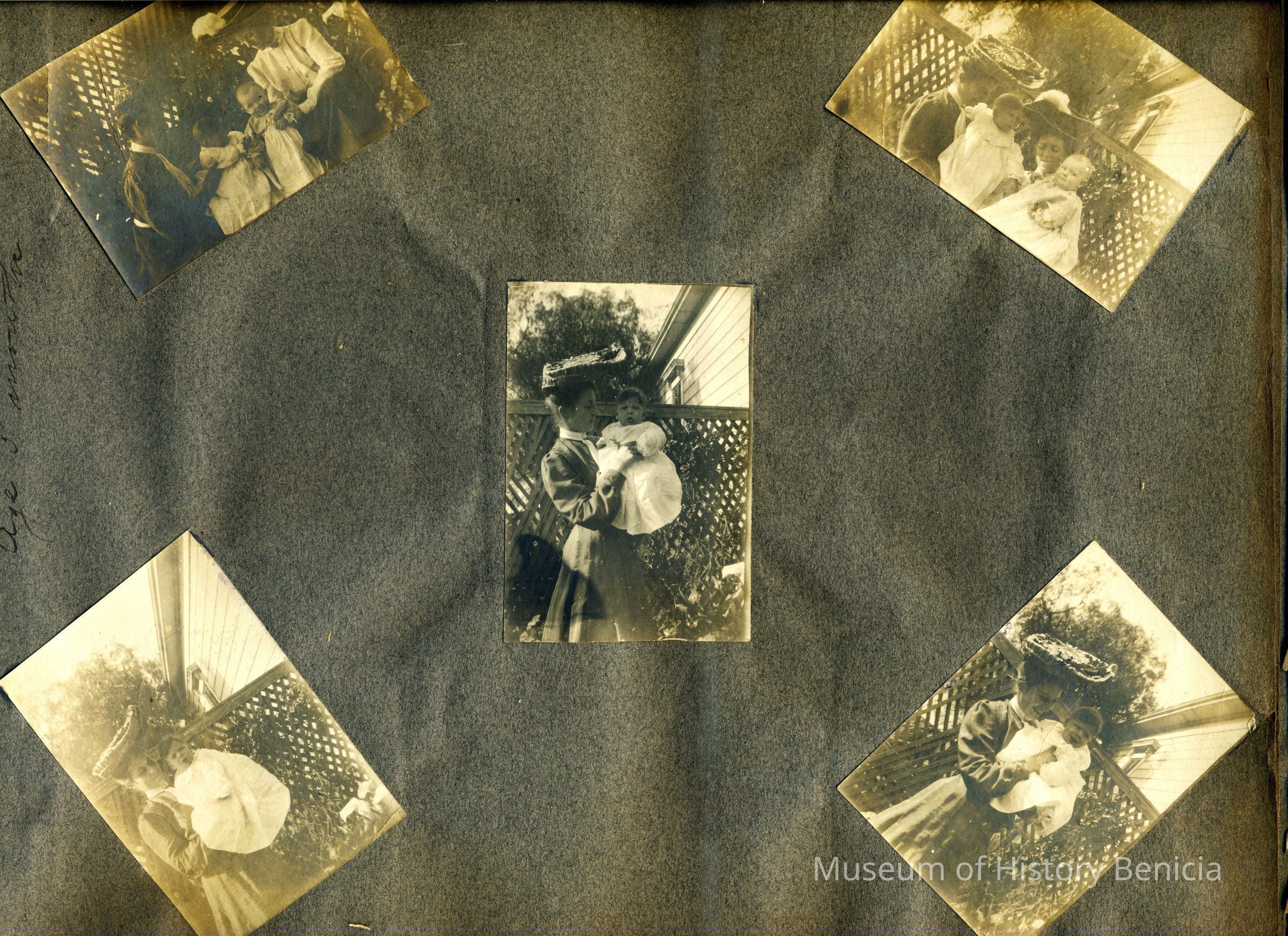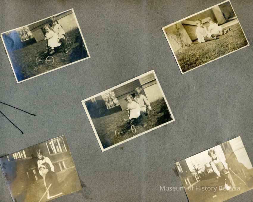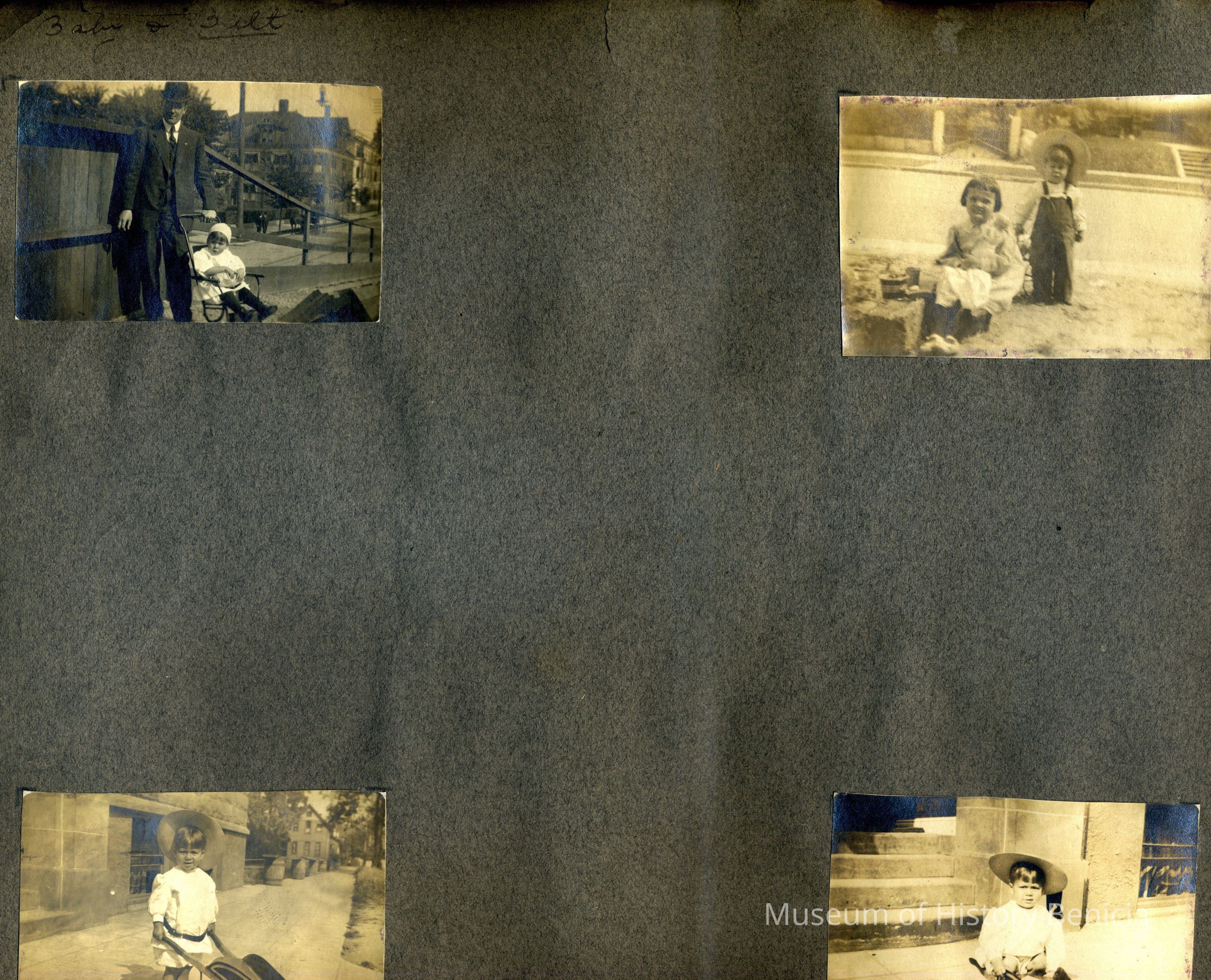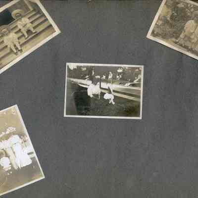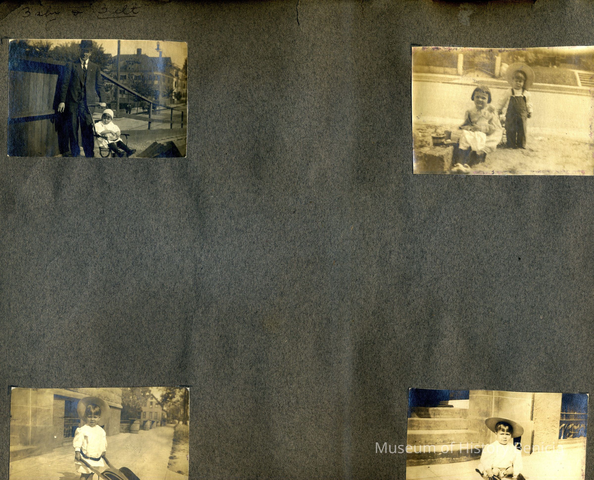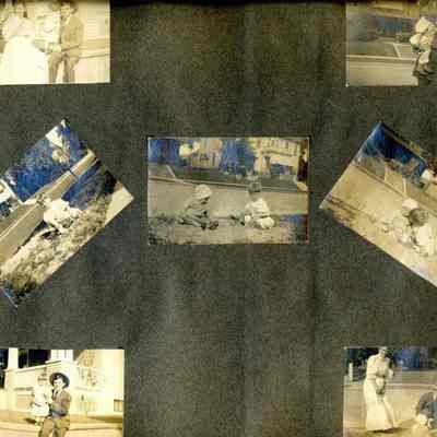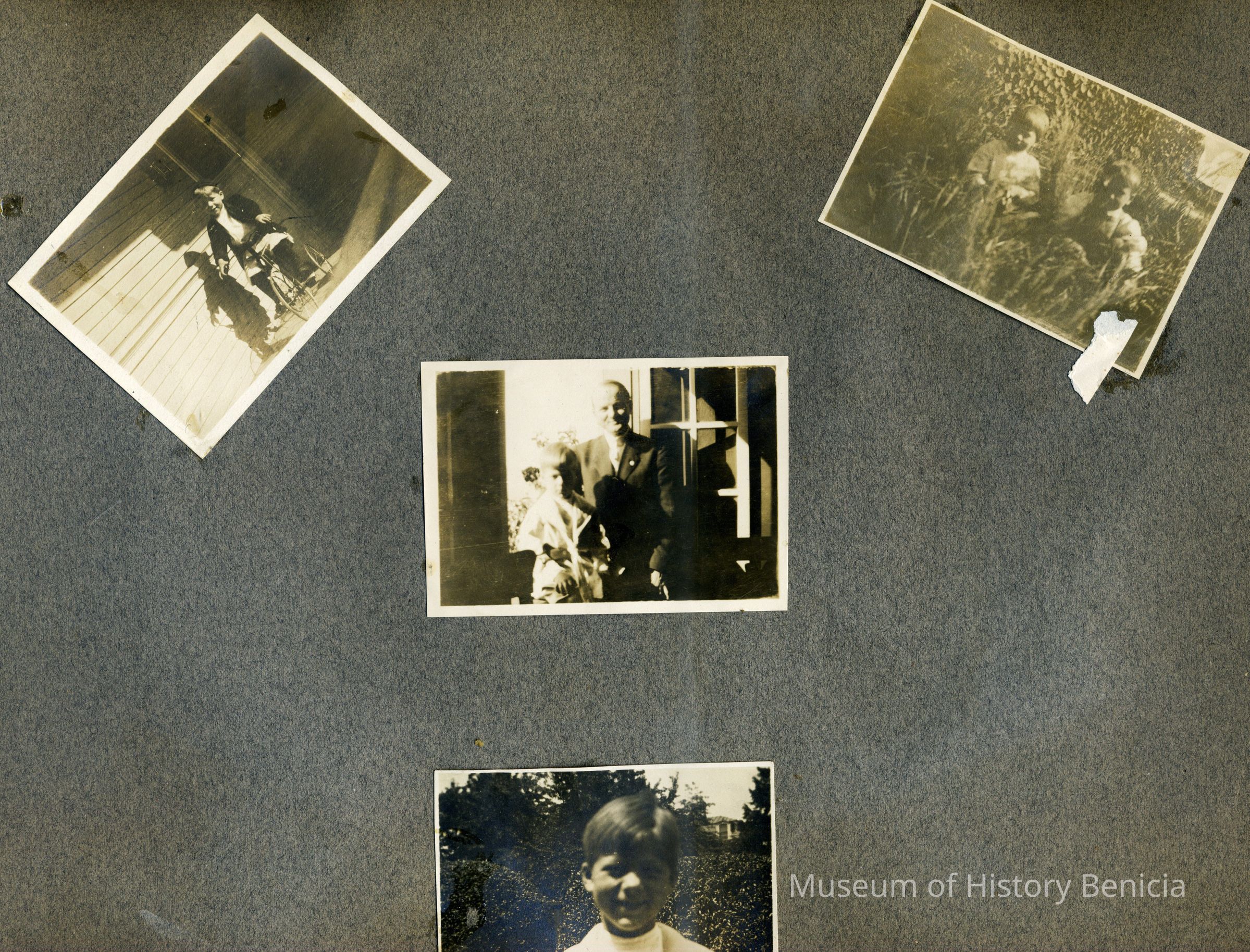 This is a velvet covered photo album measuring 10" x 12". It contans mostly photos of Godfrey Rueger Jr. at various ages. Godfrey Jr. was born 09/01/1904 in Benicia and died 03/16/1983 in Los Angeles. His parents were Godfrey Rueger (1875-1956) and Zoe Durner (1884 -). He had a sister named Zor born 1910. I think some of the photos are of her in this album.Collection