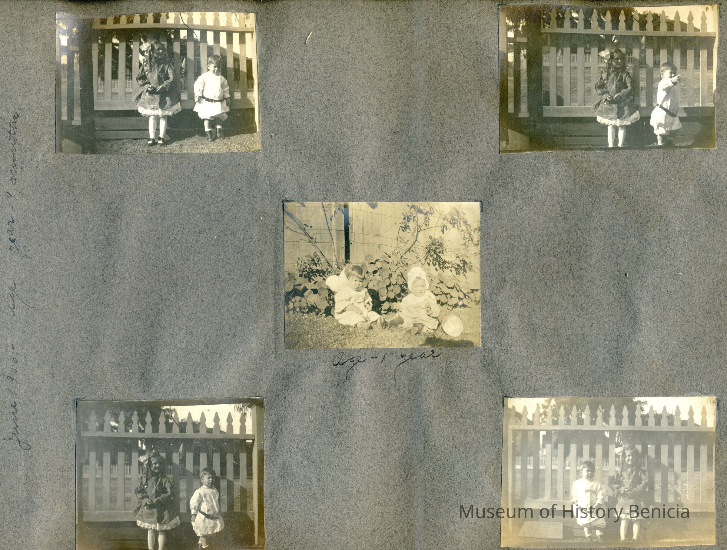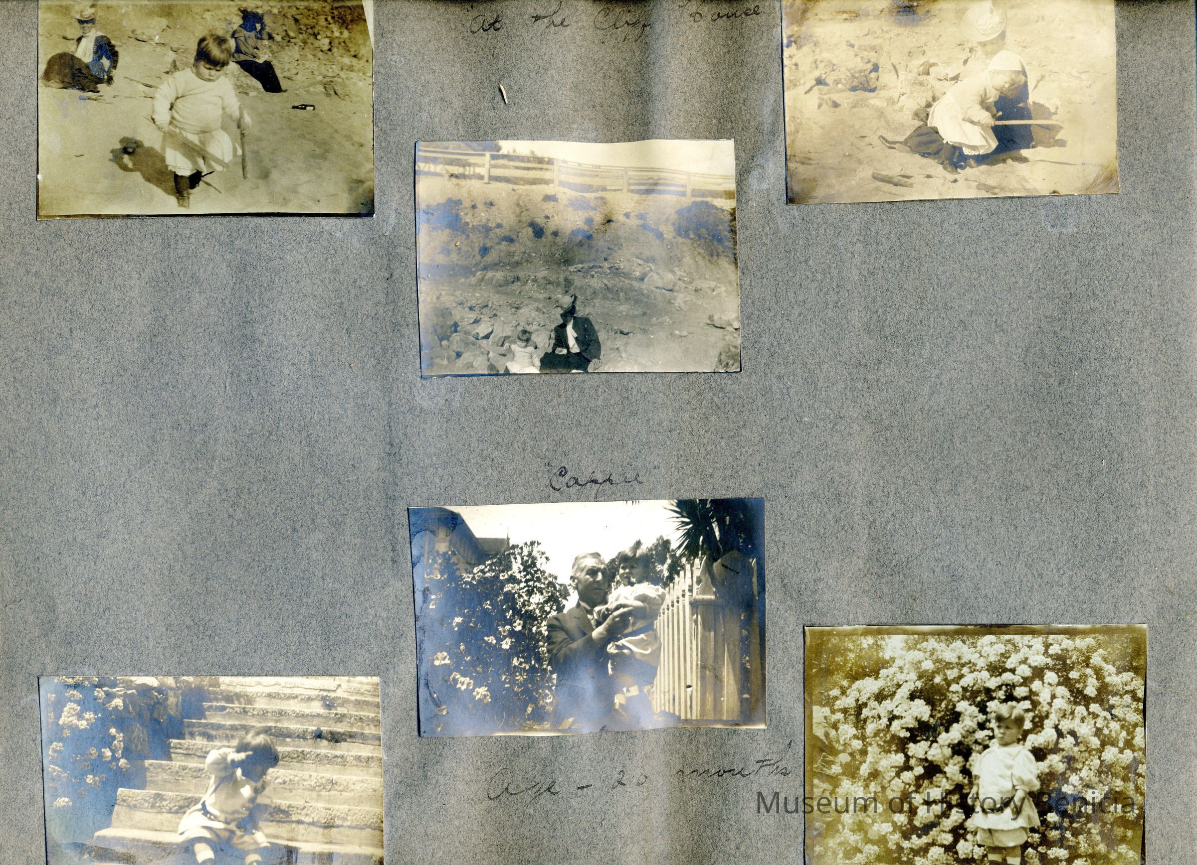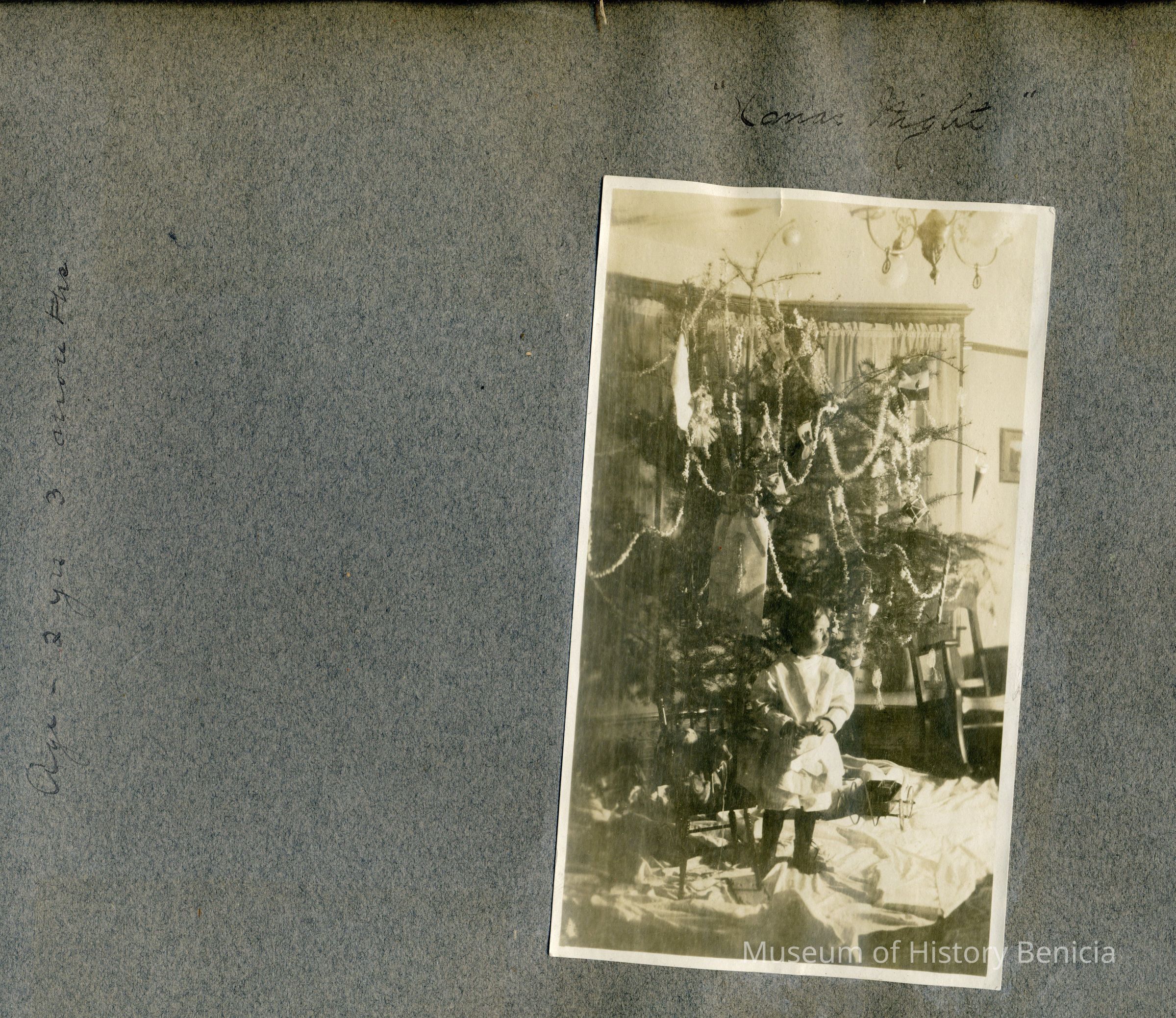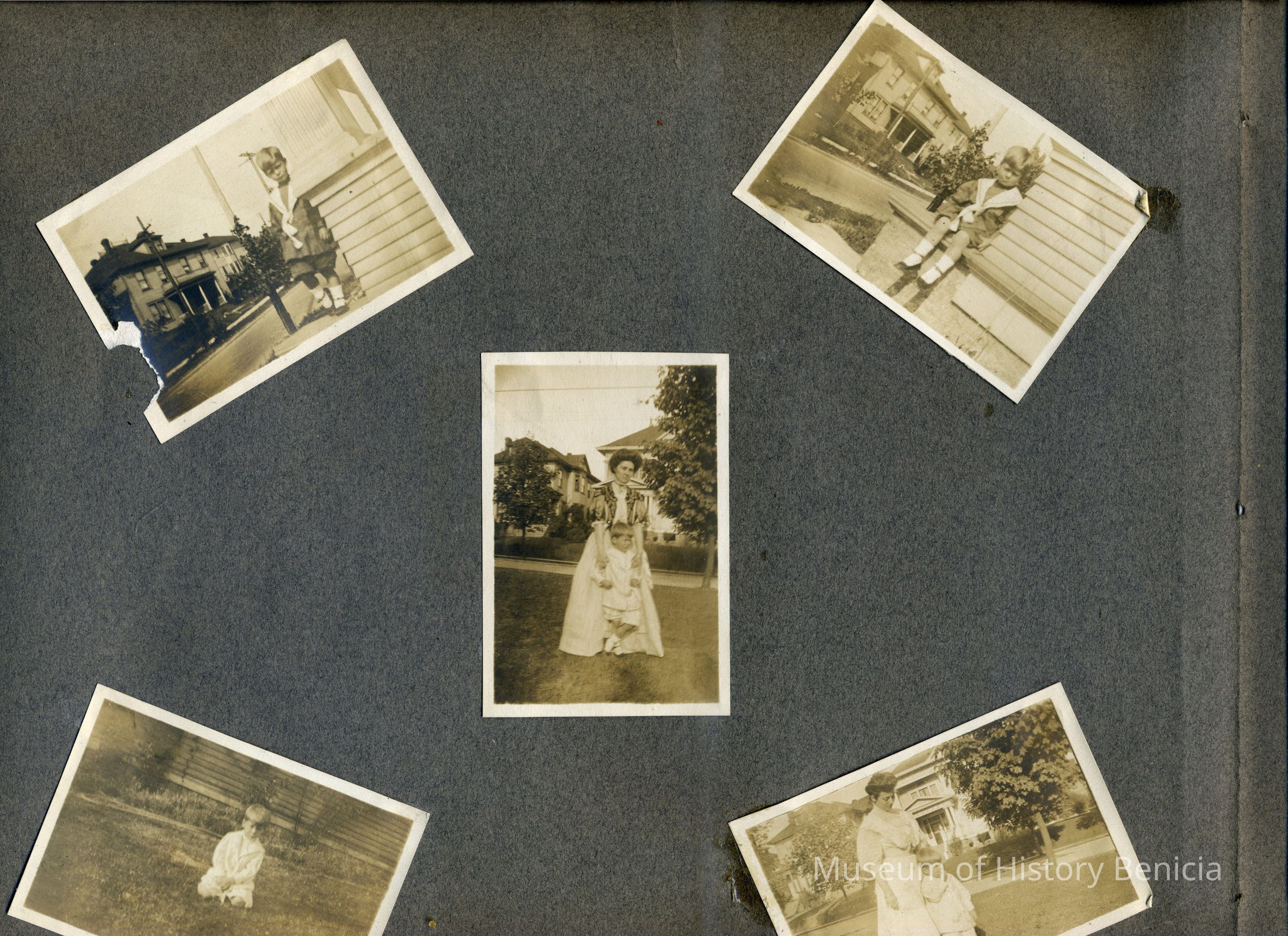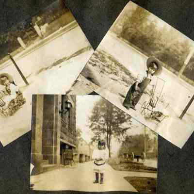 This is a velvet covered photo album measuring 10" x 12". It contans mostly photos of Godfrey Rueger Jr. at various ages. Godfrey Jr. was born 09/01/1904 in Benicia and died 03/16/1983 in Los Angeles. His parents were Godfrey Rueger (1875-1956) and Zoe Durner (1884 -). He had a sister named Zor born 1910. I think some of the photos are of her in this album.Collection