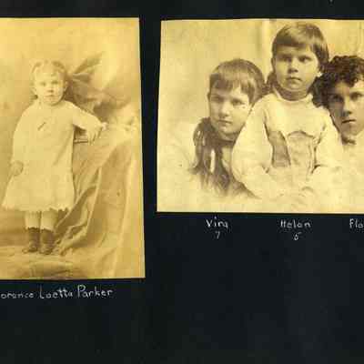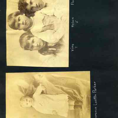 Photo album with a tooled leather cover that has the word "photographs" on the front and several colored diamonds down each side. The photo album is from the Parker/Teale families. Most pages have names written under the photos. The photos are so well documented and very firmly glued into the album that it is being kept together and photos are generally not being removed from the album.