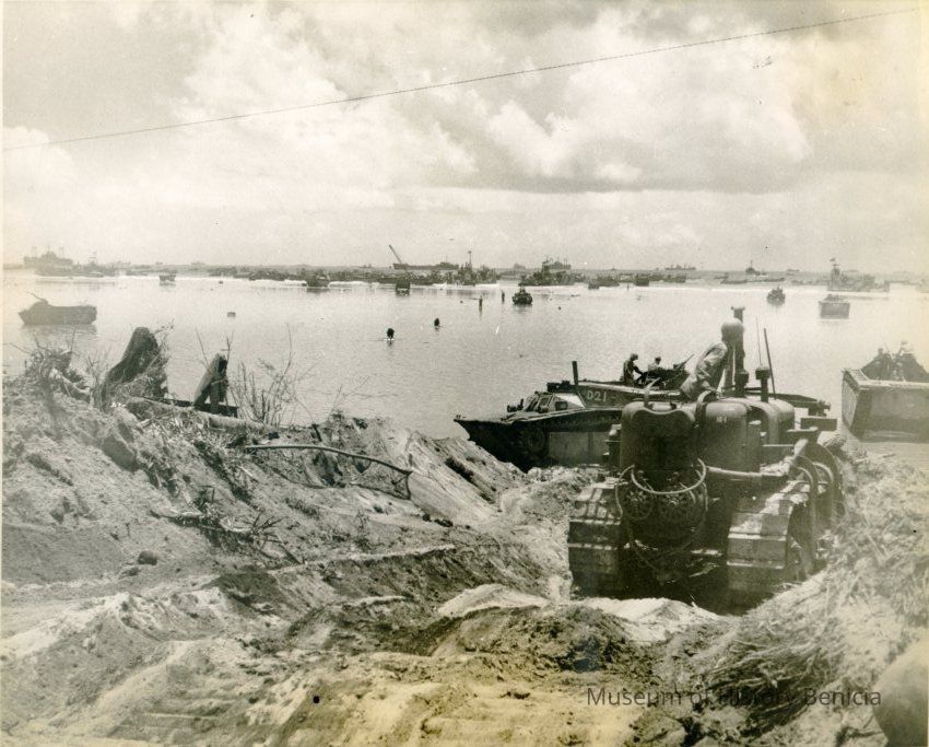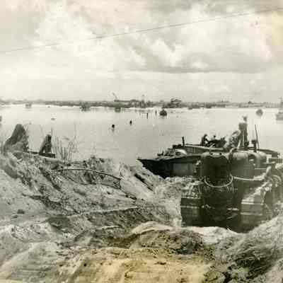 This is a loose photo that was at the back of the scrapbook. It shows American landing craft and a tank coming ashore. Not sure where it is from because the description is missing.Collection
