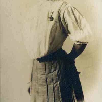 Photo album with a tooled leather cover that has the word "photographs" on the front and several colored diamonds down each side. The photo album is from the Parker/Teale families. Most pages have names written under the photos. The photos are so well documented and very firmly glued into the album that it is being kept together and photos are generally not being removed from the album.