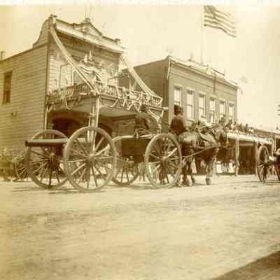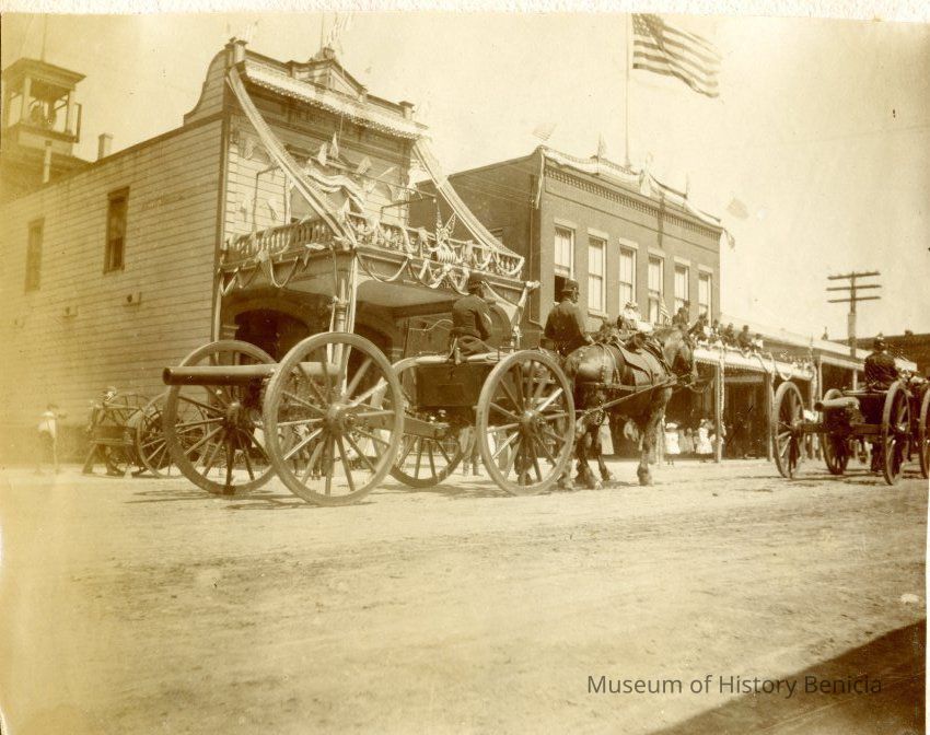 This is a scan of one of the photos on this page in that album. It shows a part of the July 4th, 1901 parade in front of the fire engine house in Benicia with people in front.Collection