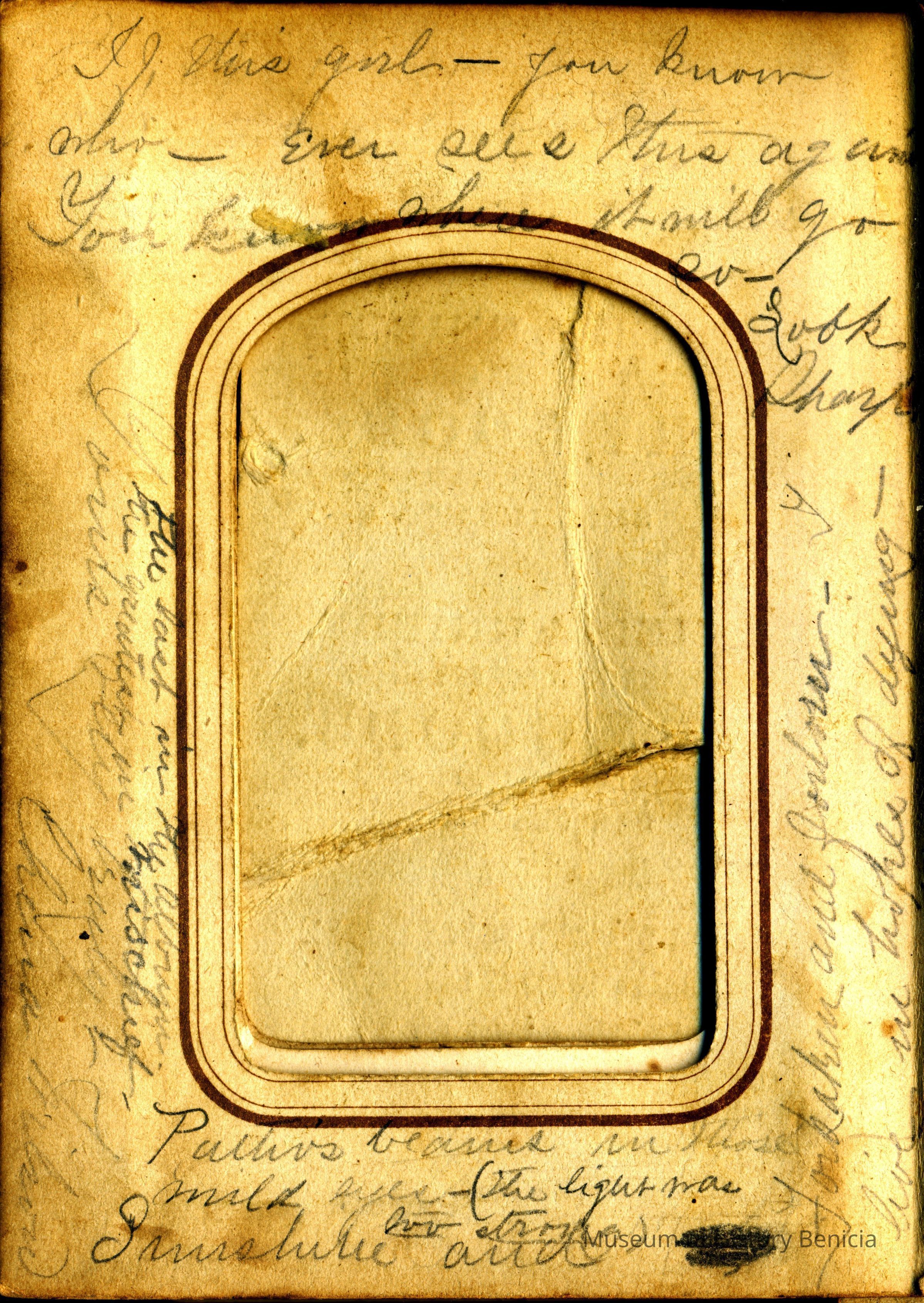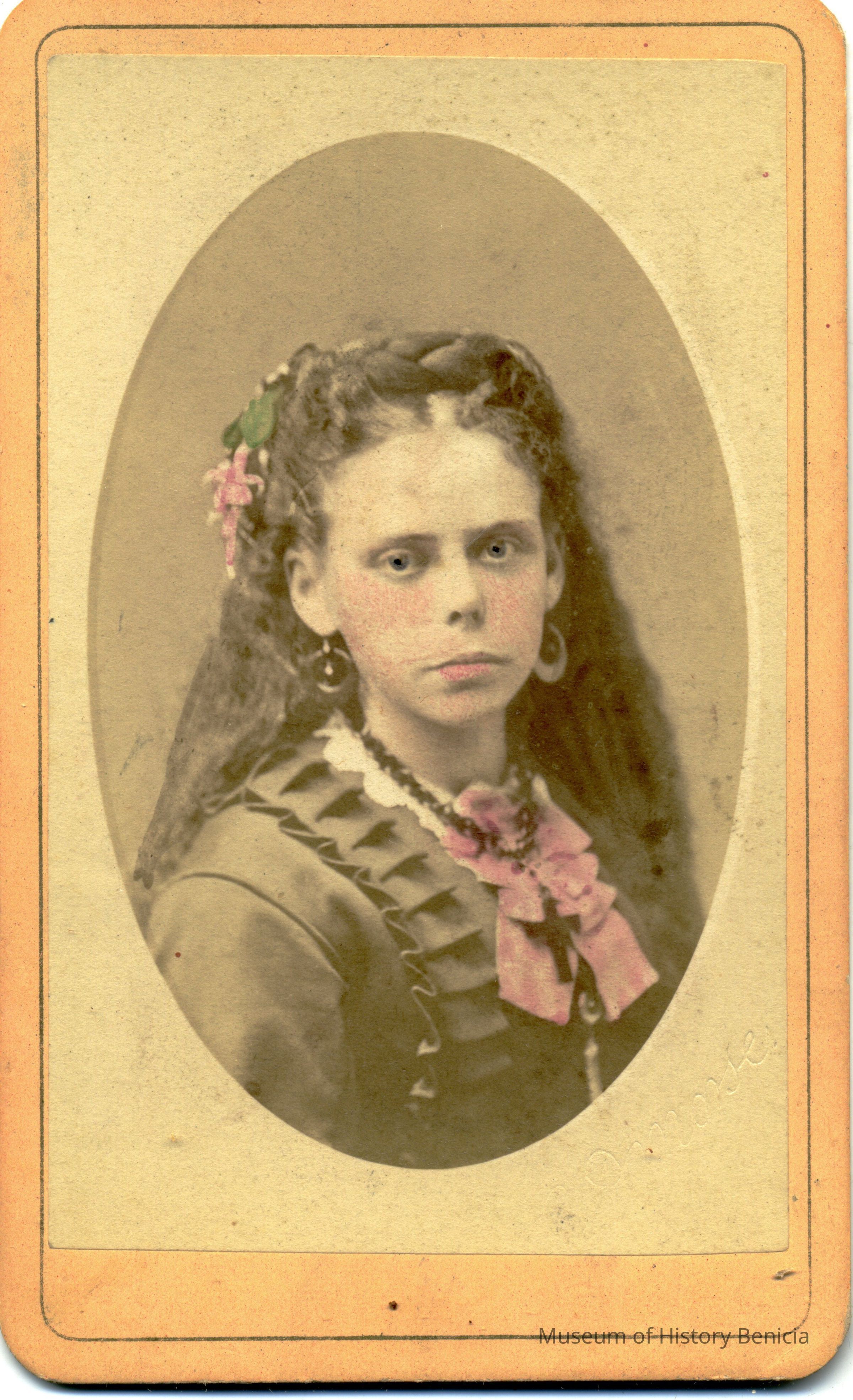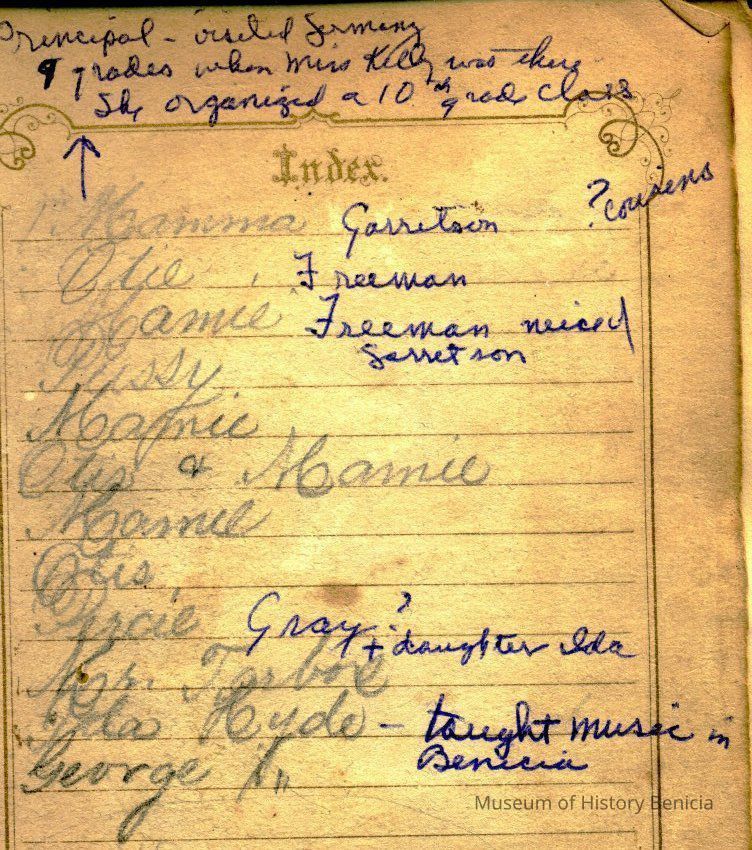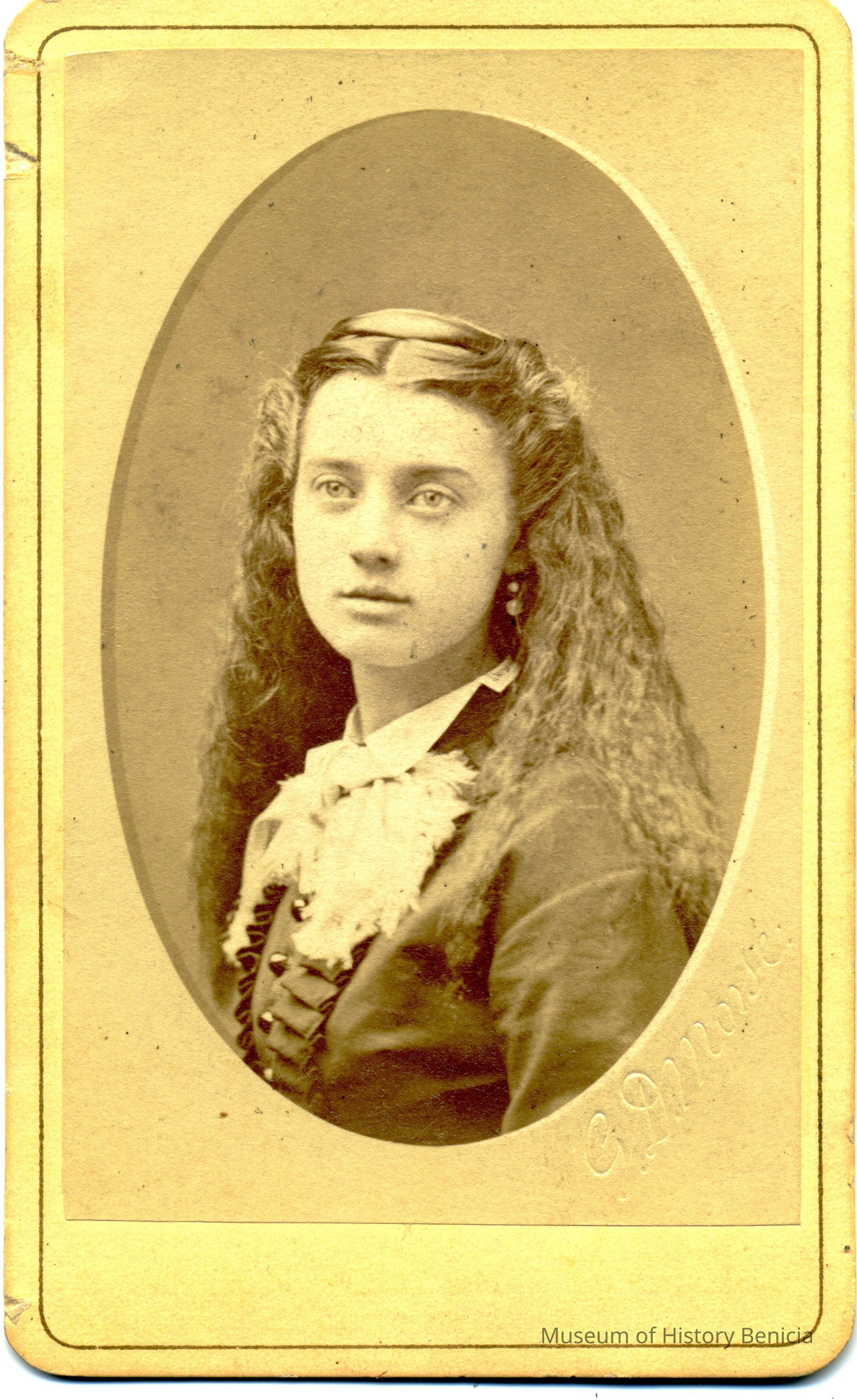 The cards show they were given to "Emma". There is an Emma M. Garretson born 03/24/1858 in Benicia who attended the Young Ladies Seminary and Mills starting 1870. My guess would be that this album was created about 1874 possibly when she graduated.
