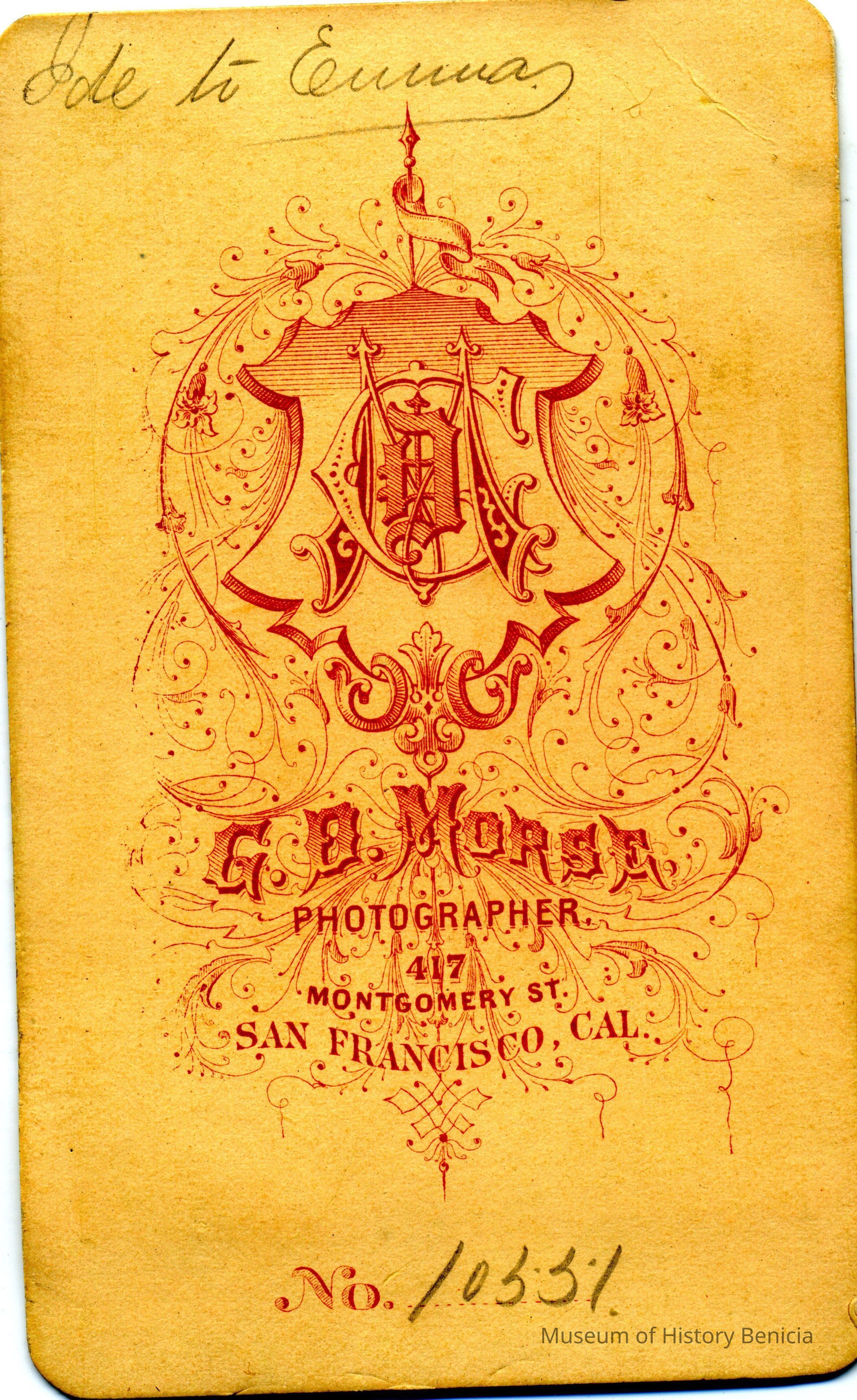 George Daniels Morse, noted as a traveling daguerreian and/or photographer, 1859 to 1889. Apparently based in San Francisco, he traveled to the northern part of California.