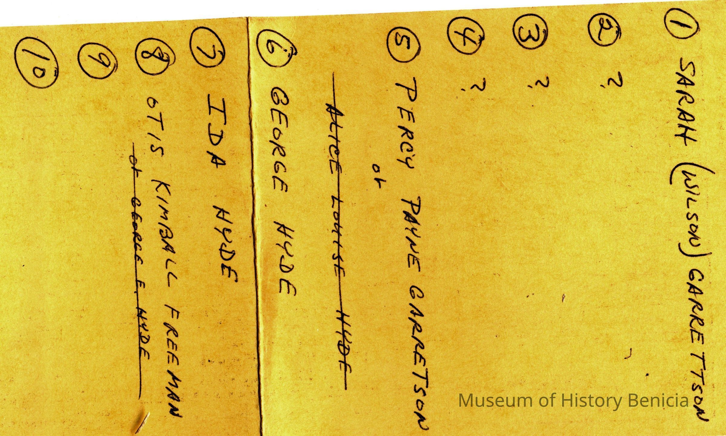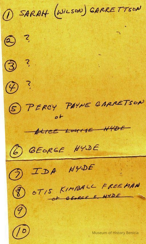 The Garretson family starts with William Garretson marrying Sarah Wilson and moving to Benicia. One of their children was Nathan Hammond Garretson (08/26/1811) who married Jane Adelaide Howard (1818). There children were: