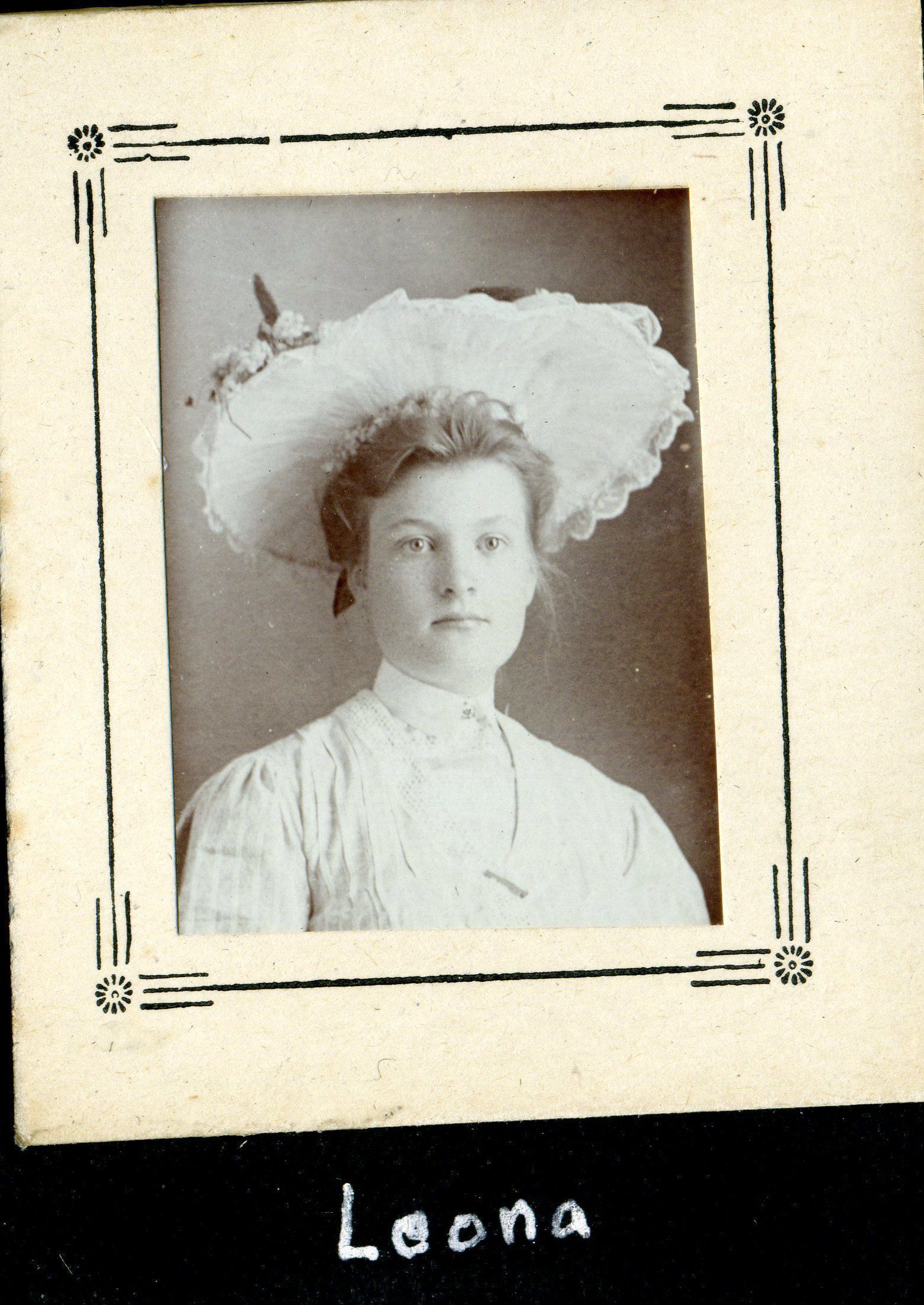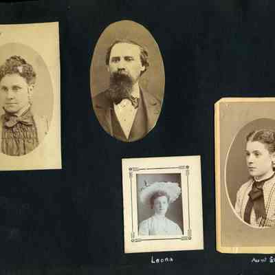Photo album with a tooled leather cover that has the word "photographs" on the front and several colored diamonds down each side. The photo album is from the Parker/Teale families. Most pages have names written under the photos. The photos are so well documented and very firmly glued into the album that it is being kept together and photos are generally not being removed from the album.