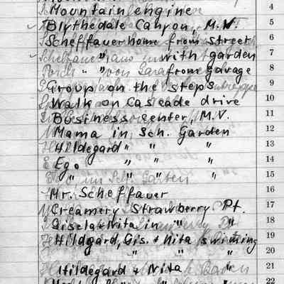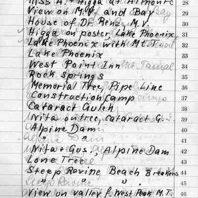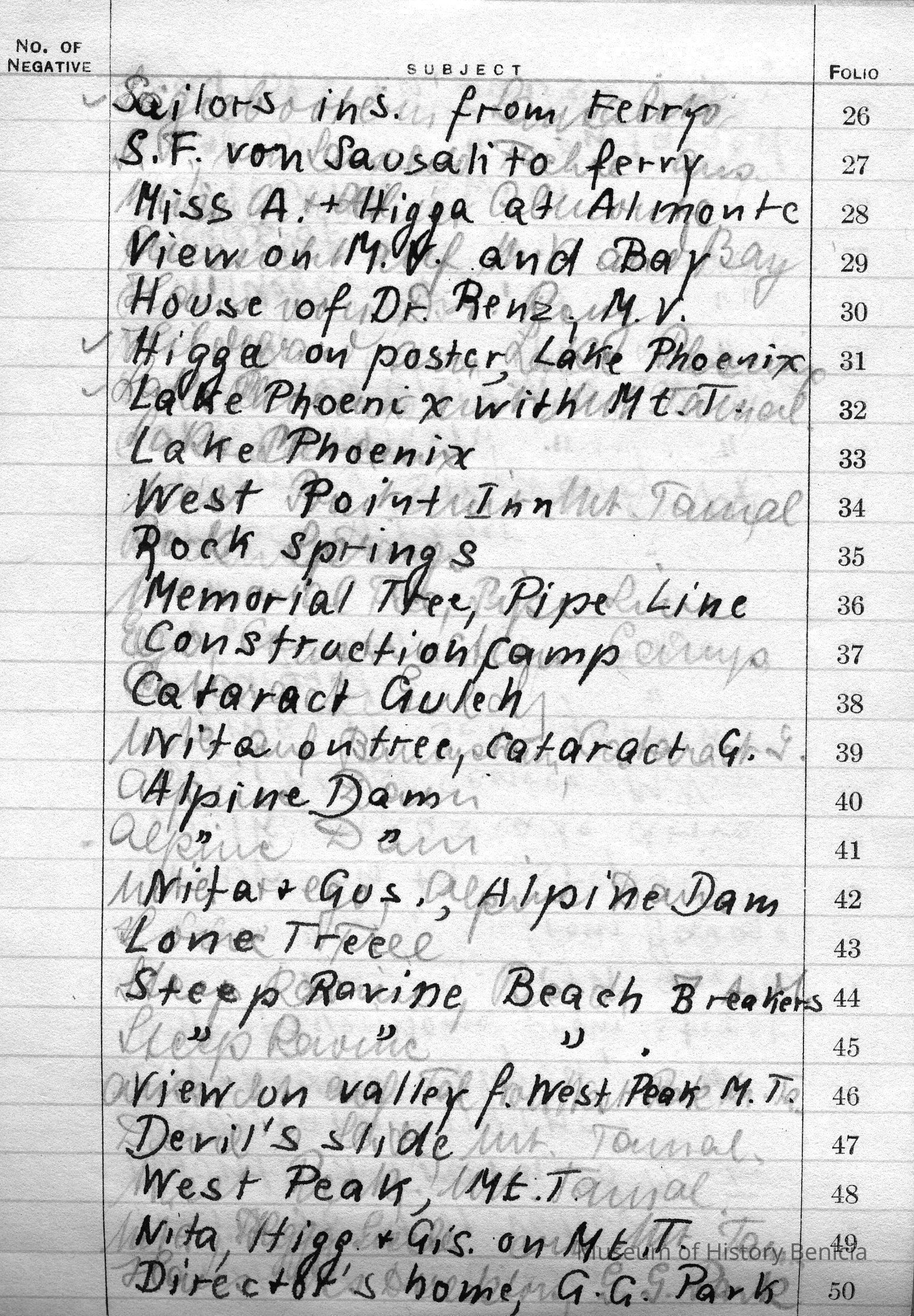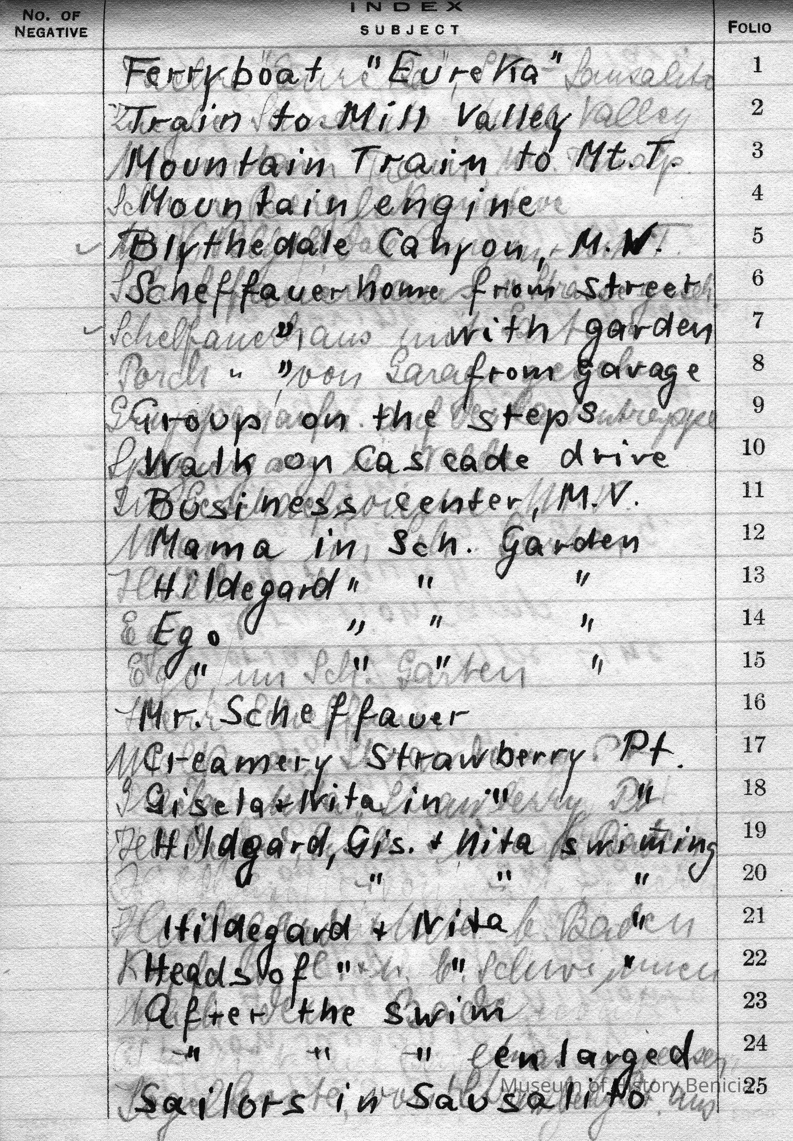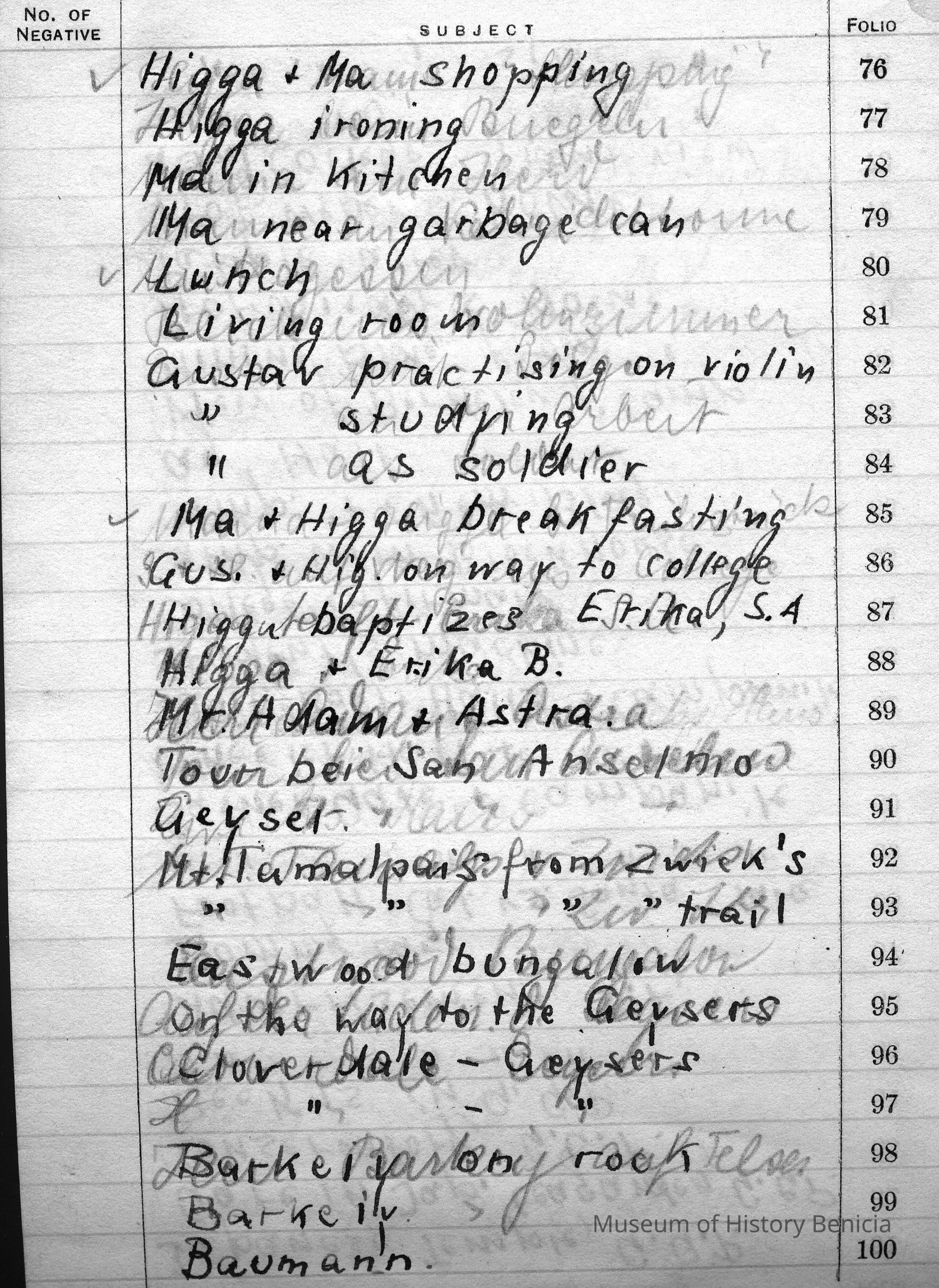100 glassine envelopes w/negative and an index identifying the negatives. Marin area, Golden Gate Park, UC Berkeley, ferry boat, geysers and people w/German first names only.