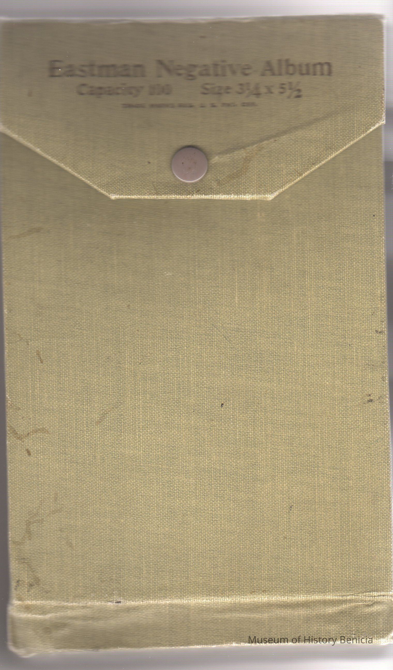 information from description on other #: Light green cloth alum w/snap flap. Printed on flap: "Eastman Negative Album/Capacity 100 Size 3-1/4" x 5-1/2"...."