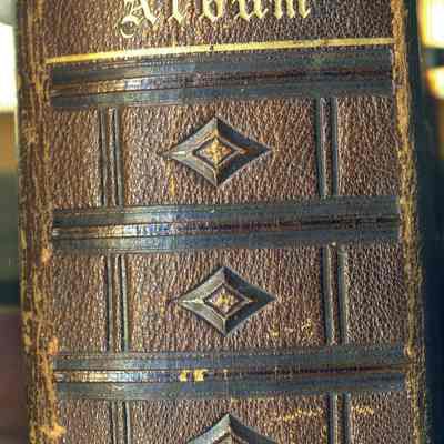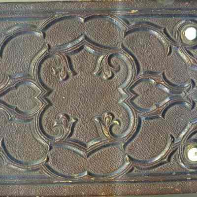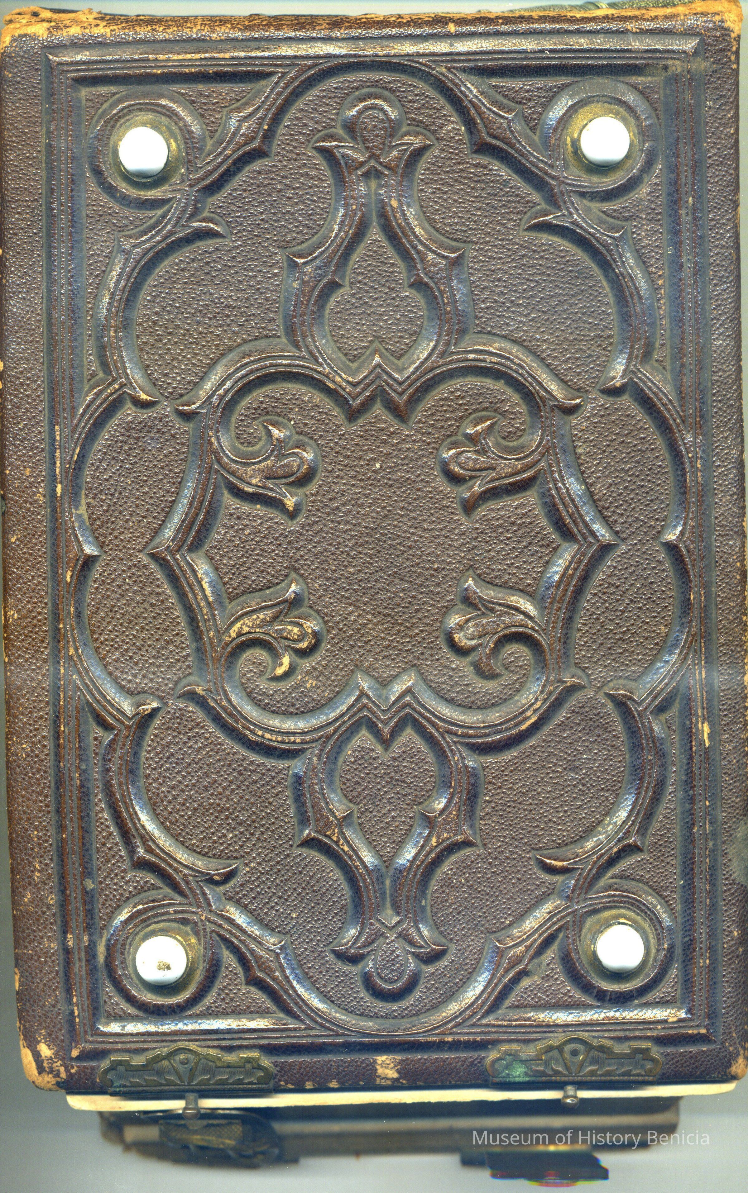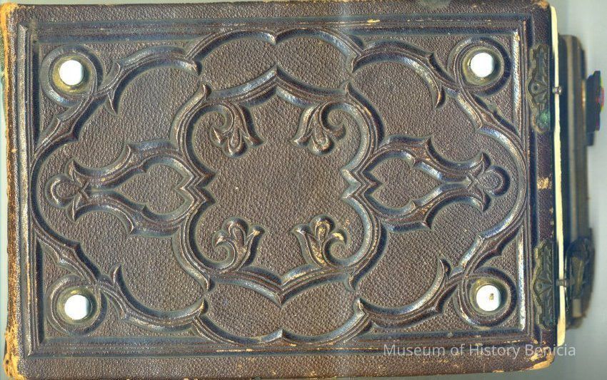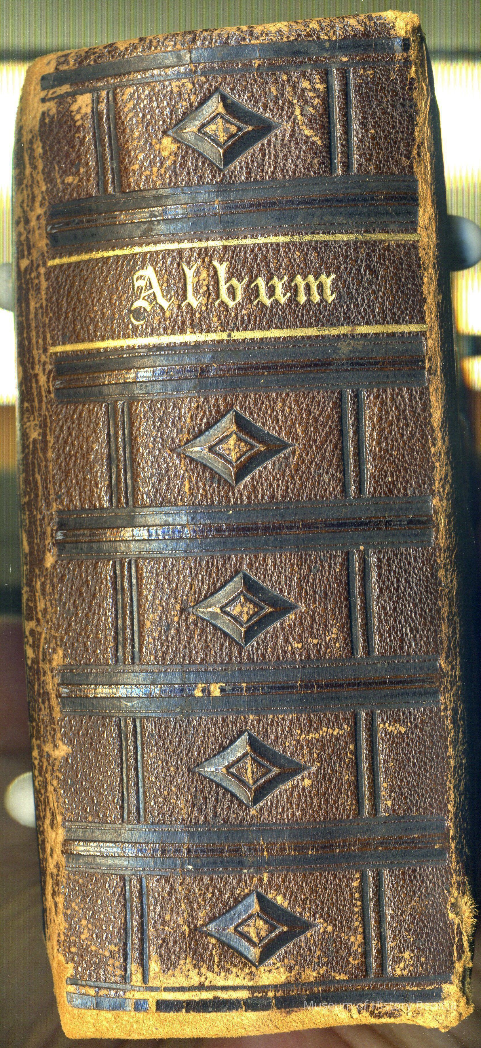 This is a photo album owned by L. M. Sherwood. It was made to hold carte-de-visite photos and is about half full. It has two metal clasps on the outside, a thick brown cover with a geometrick design and four glass beads protruding from the cover. The same design is on the back. The spine has the word "album" and a diamond pattern. The photos have been described in fair detail with the relationship to the owner.Collection