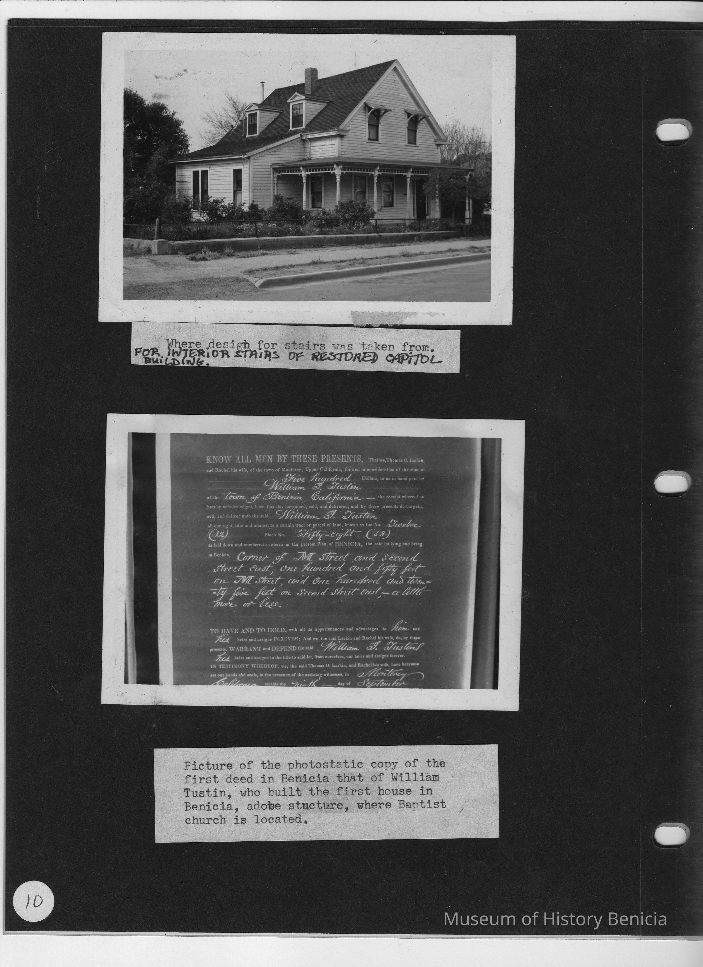 Page contains two B/W photos. Top shows home at 150 West G St. Bottom shows photostatic copy of the first deed in Benicia, that of William Tustin, who built the first house in Benicia.Collection